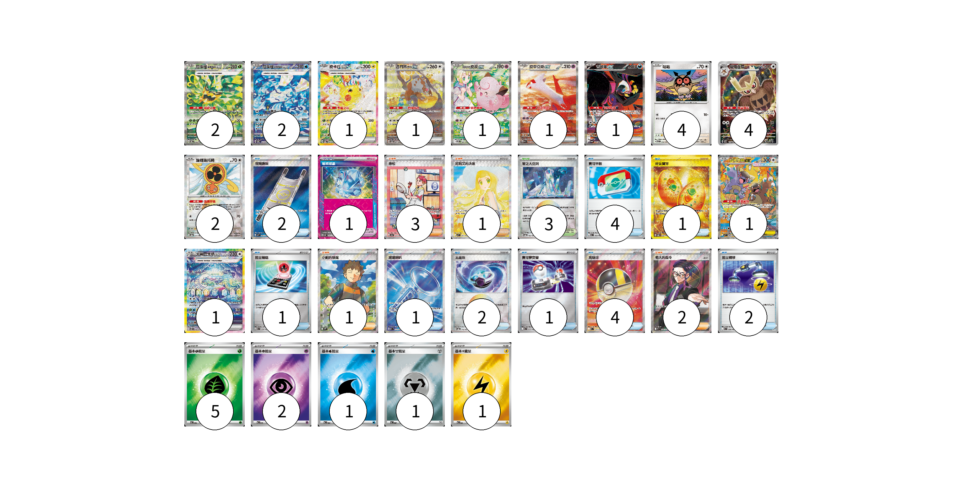 牌組構築方案 以此牌組為基礎新構築牌組 顯示卡面 顯示列表 寶可夢卡(21) 2 2 1 1 1 1 1 4 4 2 1 1 寶可夢道具(1) 1 物品卡(18) 2 4 1 1 1 2 1 4 2 支援者卡(7) 3 1 1 2 競技場卡(3) 3 能量卡(10) 5 2 1 1 1 寶可夢卡(21) 卡牌名稱 張數 卡牌名稱 張數 厄鬼椪 碧草面具ex SV6 125/101 02 厄鬼椪 水井面具ex SV6 127/101 02 皮卡丘ex SV8 132/106 01 月月熊 赫月 ex SV5a 091/066 01 莉莉艾的皮皮ex SV9 126/100 01 拉帝亞斯ex SV7a 087/064 01 吉雉雞ex SV6a 089/064 01 咕咕 SV7 076/102 04 貓頭夜鷹 SV7 114/102 04 旋轉洛托姆 SV8a 131/187 02 超級袋獸ex M1S 089/063 01 太樂巴戈斯ex SV7 130/102 01 寶可夢道具(1) 卡牌名稱 張數 卡牌名稱 張數 璀璨結晶 SV8a 152/187 01 物品卡(18) 卡牌名稱 張數 卡牌名稱 張數 夜間擔架 M1L 083/063 02 寶可平板 MC 662/742 04 好友寶芬 SV6 133/101 01 能量輸送 MC 639/742 01 玻璃喇叭 M2a 215/193 01 太晶珠 SV8a 145/187 02 寶可夢交替 MC 663/742 01 高級球 M2a 216/193 04 能量轉移 MC 638/742 02 支援者卡(7) 卡牌名稱 張數 卡牌名稱 張數 赤松 SV8a 227/187 03 莉莉艾的決意 M1L 091/063 01 小剛的發掘 SV9 123/100 01 老大的指令(烏羽) MC 760/742 02 競技場卡(3) 卡牌名稱 張數 卡牌名稱 張數 零之大空洞 SV8a 182/187 03 能量卡(10) 卡牌名稱 張數 卡牌名稱 張數 基本【草】能量 MC GRA 05 基本【超】能量 MC PSY 02 基本【水】能量 MC WAT 01 基本【鋼】能量 MC MET 01 基本【雷】能量 MC LIG 01 以此牌組為基礎新構築牌組 牌組編碼 pKAckJ-fDZsru-EQdtGq copy 列印牌組單 牌組編碼已複製 分享至SNS