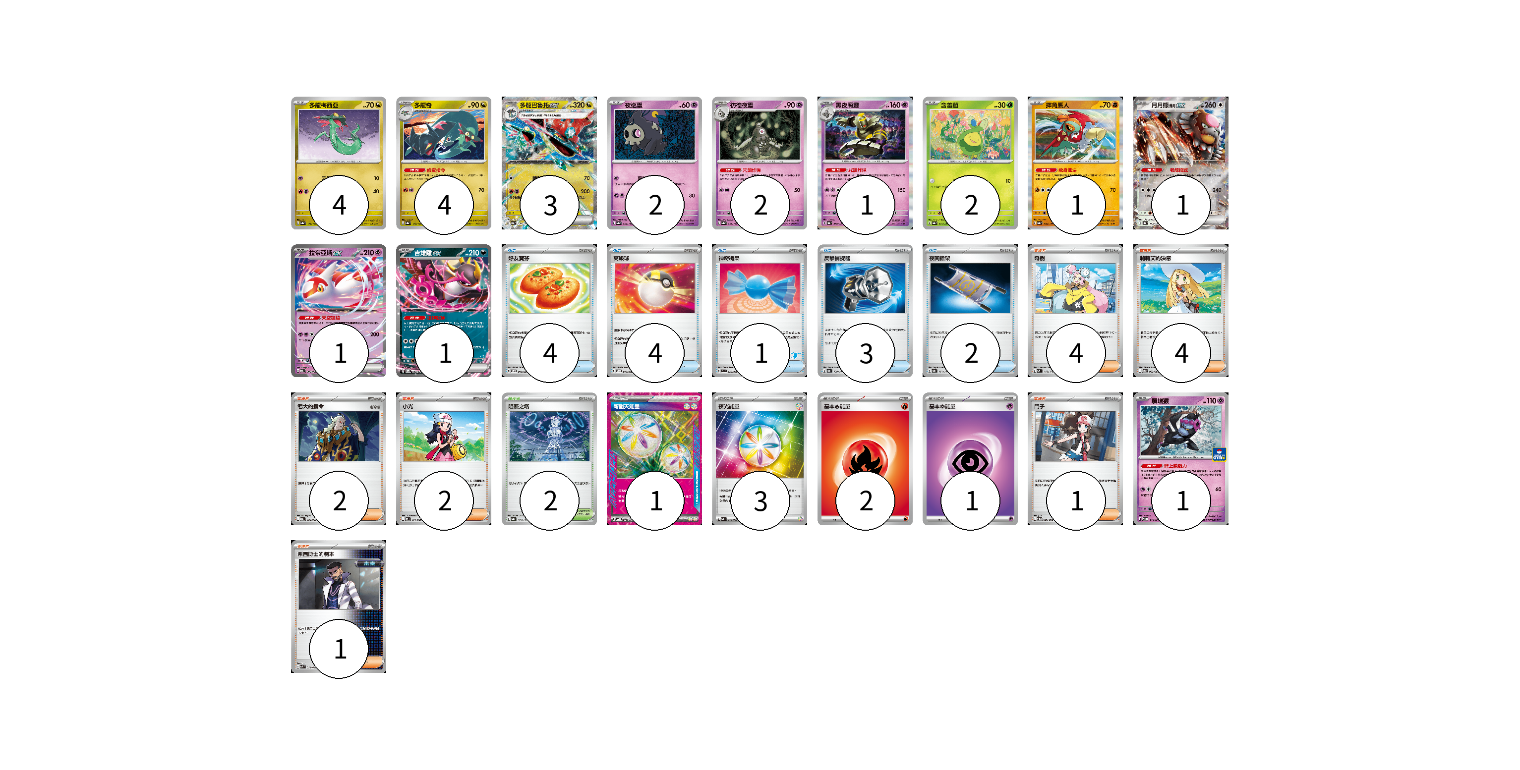 牌組構築方案 以此牌組為基礎新構築牌組 顯示卡面 顯示列表 寶可夢卡(23) 4 4 3 2 2 1 2 1 1 1 1 1 物品卡(14) 4 4 1 3 2 支援者卡(14) 4 4 2 2 1 1 競技場卡(2) 2 能量卡(7) 1 3 2 1 寶可夢卡(23) 卡牌名稱 張數 卡牌名稱 張數 多龍梅西亞 SV8a 118/187 04 多龍奇 SV8a 119/187 04 多龍巴魯托ex SV8a 120/187 03 夜巡靈 SV8a 064/187 02 彷徨夜靈 SV8a 065/187 02 黑夜魔靈 SV8a 066/187 01 含羞苞 SV8a 001/187 02 摔角鷹人 SV8a 084/187 01 月月熊 赫月ex SV8a 134/187 01 拉帝亞斯ex MBD 003/022 01 吉雉雞ex SVOM 009/021 01 願增猿 M-P 014/M-P 01 物品卡(14) 卡牌名稱 張數 卡牌名稱 張數 好友寶芬 SVOM 012/021 04 高級球 SVOD 012/020 04 神奇糖果 SVI 053/066 01 反擊捕捉器 SV8a 139/187 03 夜間擔架 SV8a 151/187 02 支援者卡(14) 卡牌名稱 張數 卡牌名稱 張數 奇樹 SVM 160/175 04 莉莉艾的決意 M1L 062/063 04 老大的指令 MBD 020/022 02 小光 M2 077/080 02 鬥子 SV11W 085/086 01 弗圖博士的劇本 SVK 034/042 01 競技場卡(2) 卡牌名稱 張數 卡牌名稱 張數 阻礙之塔 SV8a 181/187 02 能量卡(7) 卡牌名稱 張數 卡牌名稱 張數 新衝天能量 SV5K 071/071 01 夜光能量 SVK 042/042 03 基本火能量 sv-p FIR 02 基本超能量 sv-p PSY 01 以此牌組為基礎新構築牌組 牌組編碼 pMOtvP-XqTDdh-dUuzyZ copy 列印牌組單 牌組編碼已複製 分享至SNS