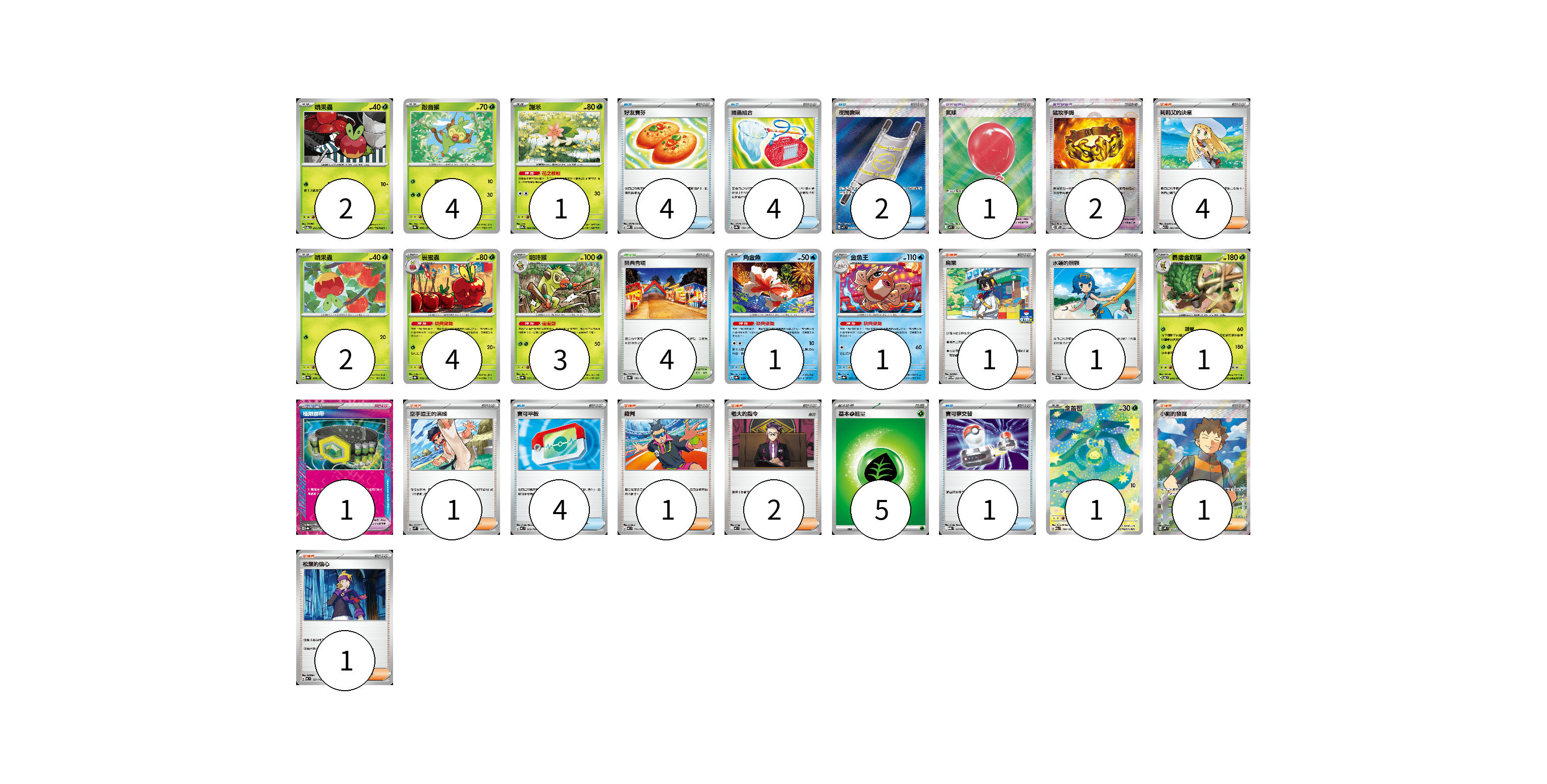 牌組構築方案 以此牌組為基礎新構築牌組 顯示卡面 顯示列表 寶可夢卡(20) 2 4 1 2 4 3 1 1 1 1 寶可夢道具(4) 1 2 1 物品卡(15) 4 4 2 4 1 支援者卡(12) 4 1 1 1 1 2 1 1 競技場卡(4) 4 能量卡(5) 5 寶可夢卡(20) 卡牌名稱 張數 卡牌名稱 張數 啃果蟲 SV6 011/101 02 敲音猴 SV8a 006/187 04 謝米 SV9a 006/063 01 啃果蟲 SV8a 008/187 02 裹蜜蟲 SV8a 009/187 04 啪咚猴 SV8a 007/187 03 角金魚 SV8a 028/187 01 金魚王 SV8a 029/187 01 轟擂金剛猩 SV6 010/101 01 含羞苞 M2a 196/193 01 寶可夢道具(4) 卡牌名稱 張數 卡牌名稱 張數 氣球 M1L 084/063 01 猛攻手鐲 SV11W 082/086 02 極限腰帶 SV8a 159/187 01 物品卡(15) 卡牌名稱 張數 卡牌名稱 張數 好友寶芬 MBD 013/022 04 捕蟲組合 SV8a 150/187 04 夜間擔架 M1L 083/063 02 寶可平板 MC 662/742 04 寶可夢交替 MBG 015/022 01 支援者卡(12) 卡牌名稱 張數 卡牌名稱 張數 莉莉艾的決意 M1L 062/063 04 烏栗 SV-P 229/SV-P 01 水蓮的照顧 SV8a 168/187 01 空手道王的演練 SVM 145/175 01 裁判 MC 711/742 01 老大的指令 MC 724/742 02 小剛的發掘 SV9 123/100 01 松葉的信心 MC 727/742 01 競技場卡(4) 卡牌名稱 張數 卡牌名稱 張數 祭典會場 SV8a 180/187 04 能量卡(5) 卡牌名稱 張數 卡牌名稱 張數 基本【草】能量 MC GRA 05 以此牌組為基礎新構築牌組 牌組編碼 pNzqGF-rjOZRz-WadYOA copy 列印牌組單 牌組編碼已複製 分享至SNS