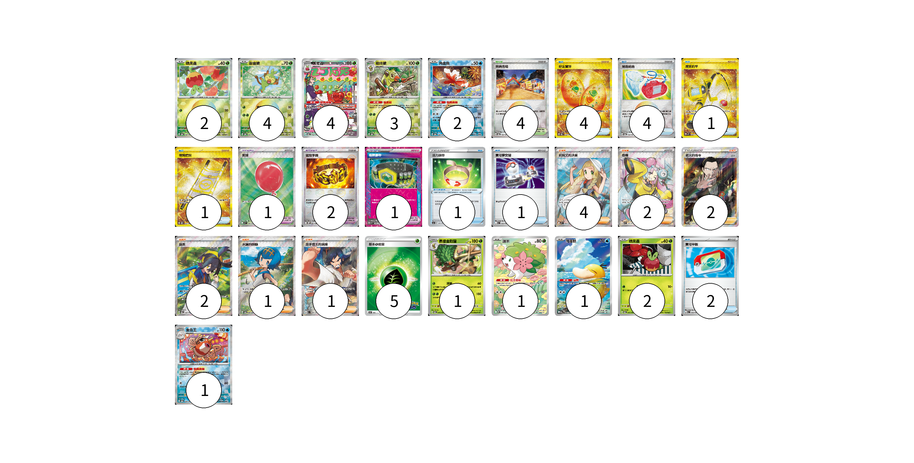 牌組構築方案 以此牌組為基礎新構築牌組 顯示卡面 顯示列表 寶可夢卡(21) 2 4 4 3 2 1 1 1 2 1 寶可夢道具(5) 1 2 1 1 物品卡(13) 4 4 1 1 1 2 支援者卡(12) 4 2 2 2 1 1 競技場卡(4) 4 能量卡(5) 5 寶可夢卡(21) 卡牌名稱 張數 卡牌名稱 張數 啃果蟲 SV8a 008/187 02 敲音猴 SV8a 006/187 04 裹蜜蟲 SV6 103/101 04 啪咚猴 SV8a 007/187 03 角金魚 SV8a 028/187 02 轟擂金剛猩 SV6 010/101 01 謝米 SV9a 066/063 01 可達鴨 M2a 199/193 01 啃果蟲 SV6 011/101 02 金魚王 SV8a 029/187 01 寶可夢道具(5) 卡牌名稱 張數 卡牌名稱 張數 氣球 M1L 084/063 01 猛攻手鐲 SV11W 082/086 02 極限腰帶 SV5K 066/071 01 活力頭帶 SC1a 143/154 01 物品卡(13) 卡牌名稱 張數 卡牌名稱 張數 好友寶芬 SV6 133/101 04 捕蟲組合 SV8a 150/187 04 厲害釣竿 SV2P 098/071 01 夜間擔架 SV8 137/106 01 寶可夢交替 MC 663/742 01 寶可平板 MC 662/742 02 支援者卡(12) 卡牌名稱 張數 卡牌名稱 張數 莉莉艾的決意 M1L 086/063 04 奇樹 SV2D 091/071 02 老大的指令(坂木) SC1b 170/153 02 烏栗 SV6 122/101 02 水蓮的照顧 SV5a 088/066 01 空手道王的演練 M2a 220/193 01 競技場卡(4) 卡牌名稱 張數 卡牌名稱 張數 祭典會場 SV8a 180/187 04 能量卡(5) 卡牌名稱 張數 卡牌名稱 張數 基本草能量 S10b GRA 05 以此牌組為基礎新構築牌組 牌組編碼 pOinGT-Rhjilo-KIAwXj copy 列印牌組單 牌組編碼已複製 分享至SNS