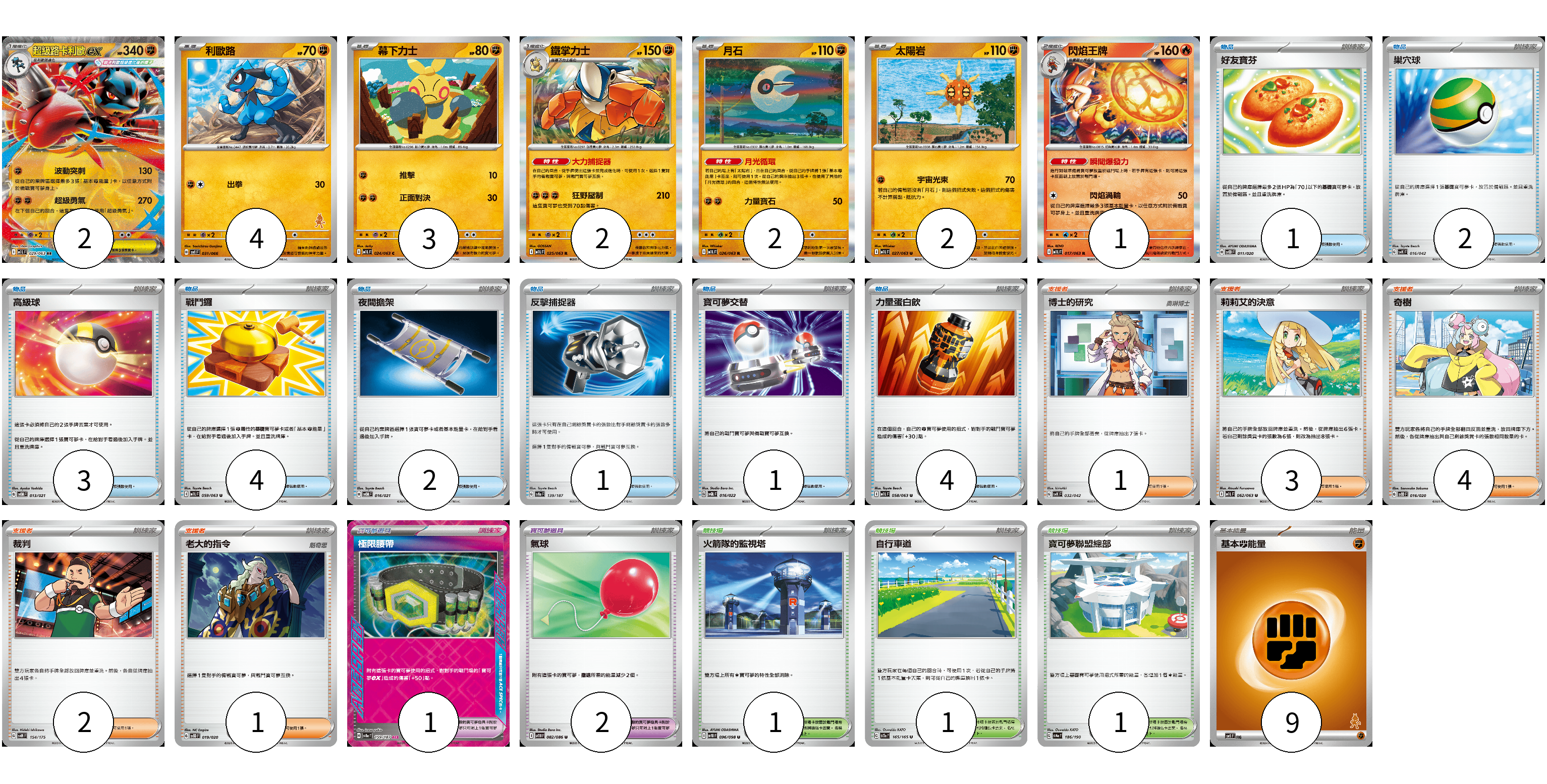 牌組構築方案 以此牌組為基礎新構築牌組 顯示卡面 顯示列表 寶可夢卡(16) 2 4 3 2 2 2 1 寶可夢道具(3) 1 2 物品卡(18) 1 2 3 4 2 1 1 4 支援者卡(11) 1 3 4 2 1 競技場卡(3) 1 1 1 能量卡(9) 9 寶可夢卡(16) 卡牌名稱 張數 卡牌名稱 張數 超級路卡利歐ex M1L 029/063 02 利歐路 SVI 031/066 04 幕下力士 M1L 024/063 03 鐵掌力士 M1L 025/063 02 月石 M1L 026/063 02 太陽岩 M1L 027/063 02 閃焰王牌 M1L 017/063 01 寶可夢道具(3) 卡牌名稱 張數 卡牌名稱 張數 極限腰帶 SV8a 159/187 01 氣球 SV11B 082/086 02 物品卡(18) 卡牌名稱 張數 卡牌名稱 張數 好友寶芬 SVOD 011/020 01 巢穴球 SVK 016/042 02 高級球 SVOM 013/021 03 戰鬥鑼 M1L 059/063 04 夜間擔架 SVOM 016/021 02 反擊捕捉器 SV8a 139/187 01 寶可夢交替 SVQL 016/022 01 力量蛋白飲 M1L 058/063 04 支援者卡(11) 卡牌名稱 張數 卡牌名稱 張數 博士的研究 SVK 032/042 01 莉莉艾的決意 M1L 062/063 03 奇樹 SVOD 016/020 04 裁判 SVM 154/175 02 老大的指令 SVOD 019/020 01 競技場卡(3) 卡牌名稱 張數 卡牌名稱 張數 火箭隊的監視塔 SV10 096/098 01 自行車道 SV2a 165/165 01 寶可夢聯盟總部 SV4a 186/190 01 能量卡(9) 卡牌名稱 張數 卡牌名稱 張數 基本【鬥】能量 SVI FIG 09 以此牌組為基礎新構築牌組 牌組編碼 pQeydM-xZhoVF-RxOWRk copy 列印牌組單 牌組編碼已複製 分享至SNS