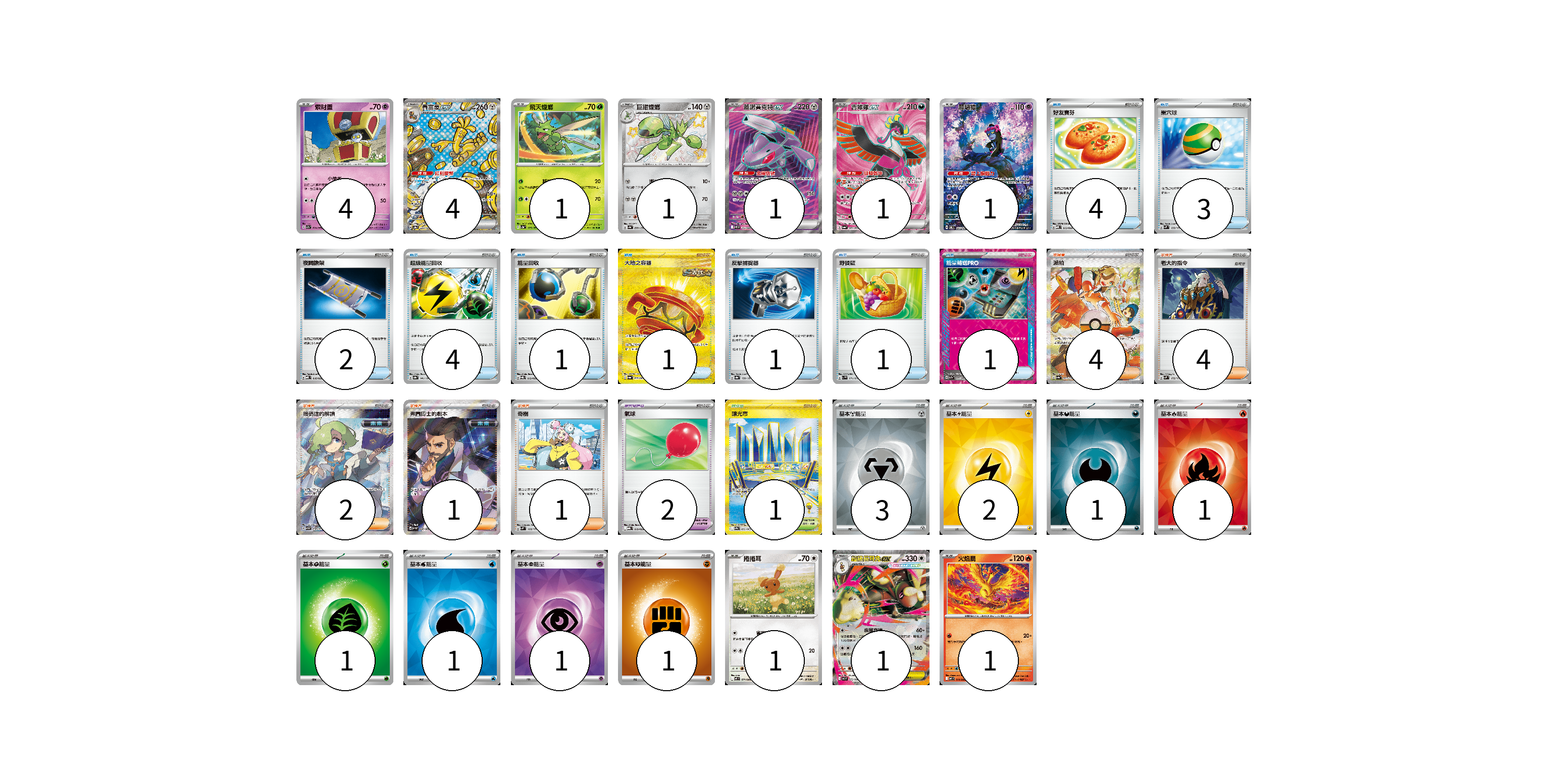牌組構築方案 以此牌組為基礎新構築牌組 顯示卡面 顯示列表 寶可夢卡(16) 4 4 1 1 1 1 1 1 1 1 寶可夢道具(2) 2 物品卡(18) 4 3 2 4 1 1 1 1 1 支援者卡(12) 4 4 2 1 1 競技場卡(1) 1 能量卡(11) 3 2 1 1 1 1 1 1 寶可夢卡(16) 卡牌名稱 張數 卡牌名稱 張數 索財靈 SV7a 024/064 04 賽富豪ex SV8a 220/187 04 飛天螳螂 SV2a 123/165 01 巨鉗螳螂 SV4a 299/190 01 蓋諾賽克特ex SV11B 164/086 01 吉雉雞ex SV6a 081/064 01 願增猿 SV6 107/101 01 捲捲耳 M2 071/080 01 超級長耳兔ex M2 072/080 01 火焰鳥 M2 014/080 01 寶可夢道具(2) 卡牌名稱 張數 卡牌名稱 張數 氣球 MBG 019/022 02 物品卡(18) 卡牌名稱 張數 卡牌名稱 張數 好友寶芬 MBD 013/022 04 巢穴球 SVM 133/175 03 夜間擔架 MBD 016/022 02 超級能量回收 SV8a 141/187 04 能量回收 SVQL 012/022 01 大地之容器 SV6a 093/064 01 反擊捕捉器 SV8a 139/187 01 野餐籃 SV1V 071/078 01 能量輸送PRO SV7a 052/064 01 支援者卡(12) 卡牌名稱 張數 卡牌名稱 張數 派帕 SV4a 353/190 04 老大的指令 SVM 172/175 04 暗碼迷的解讀 SV5M 090/071 02 弗圖博士的劇本 SV4M 086/066 01 奇樹 SVM 160/175 01 競技場卡(1) 卡牌名稱 張數 卡牌名稱 張數 釀光市 SV9a 092/063 01 能量卡(11) 卡牌名稱 張數 卡牌名稱 張數 基本【鋼】能量 SVOD MET 03 基本【雷】能量 SVQP LIG 02 基本【惡】能量 SVOM DAR 01 基本【火】能量 SVQL FIR 01 基本【草】能量 M-P GRA 01 基本【水】能量 SVK WAT 01 基本【超】能量 SVOD PSY 01 基本【鬥】能量 M-P FIG 01 以此牌組為基礎新構築牌組 牌組編碼 pSHbJF-ZFMKlG-GvsClp copy 列印牌組單 牌組編碼已複製 分享至SNS