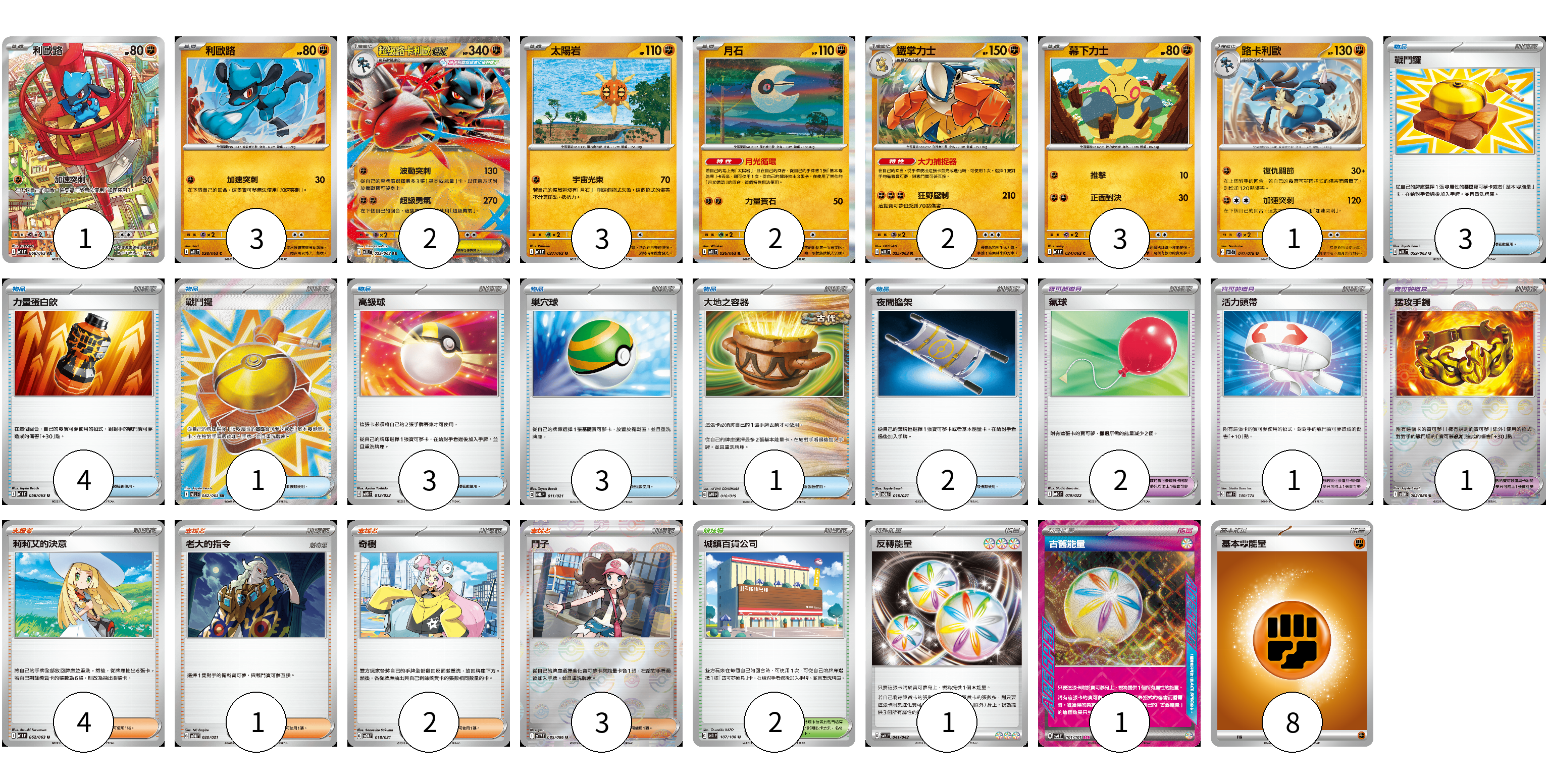 牌組構築方案 以此牌組為基礎新構築牌組 顯示卡面 顯示列表 寶可夢卡(17) 1 3 2 3 2 2 3 1 寶可夢道具(4) 2 1 1 物品卡(17) 3 4 1 3 3 1 2 支援者卡(10) 4 1 2 3 競技場卡(2) 2 能量卡(10) 1 1 8 寶可夢卡(17) 卡牌名稱 張數 卡牌名稱 張數 利歐路 M1L 068/063 01 利歐路 M1L 028/063 03 超級路卡利歐ex M1L 029/063 02 太陽岩 M1L 027/063 03 月石 M1L 026/063 02 鐵掌力士 M1L 025/063 02 幕下力士 M1L 024/063 03 路卡利歐 SV1S 041/078 01 寶可夢道具(4) 卡牌名稱 張數 卡牌名稱 張數 氣球 MBG 019/022 02 活力頭帶 SVM 140/175 01 猛攻手鐲 SV11W 082/086 01 物品卡(17) 卡牌名稱 張數 卡牌名稱 張數 戰鬥鑼 M1L 059/063 03 力量蛋白飲 M1L 058/063 04 戰鬥鑼 M1L 082/063 01 高級球 MBG 012/022 03 巢穴球 SVTL 011/021 03 大地之容器 SVTG 010/019 01 夜間擔架 SVOM 016/021 02 支援者卡(10) 卡牌名稱 張數 卡牌名稱 張數 莉莉艾的決意 M1L 062/063 04 老大的指令 SVOM 020/021 01 奇樹 SVOM 018/021 02 鬥子 SV11W 085/086 03 競技場卡(2) 卡牌名稱 張數 卡牌名稱 張數 城鎮百貨公司 SV3 107/108 02 能量卡(10) 卡牌名稱 張數 卡牌名稱 張數 反轉能量 SVK 041/042 01 古舊能量 SV6 101/101 01 基本【鬥】能量 M-P FIG 08 以此牌組為基礎新構築牌組 牌組編碼 pSIvYX-WkOkvH-wbelNl copy 列印牌組單 牌組編碼已複製 分享至SNS