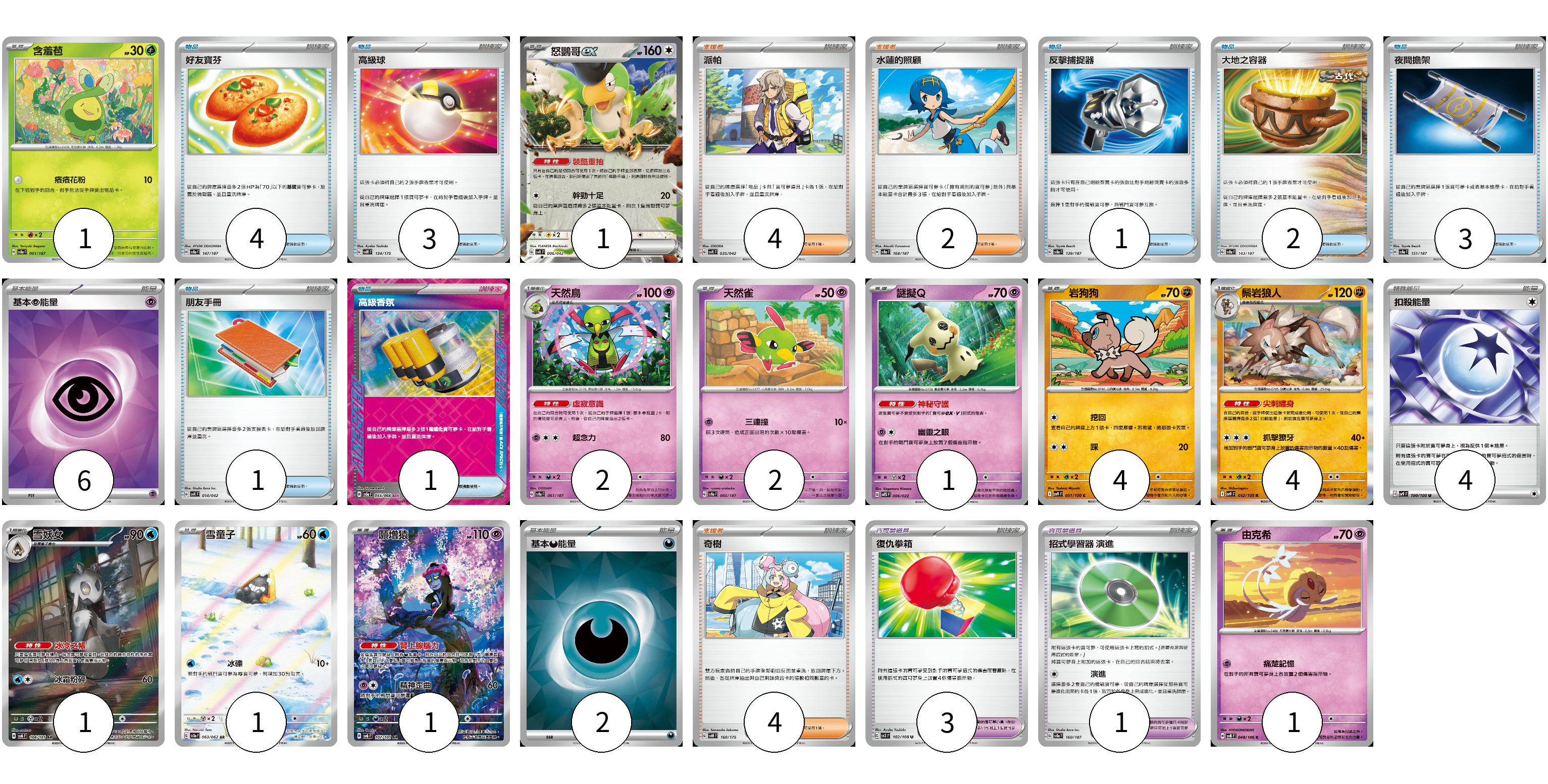 牌組構築方案 以此牌組為基礎新構築牌組 顯示卡面 顯示列表 寶可夢卡(19) 1 1 2 2 1 4 4 1 1 1 1 寶可夢道具(4) 3 1 物品卡(15) 4 3 1 2 3 1 1 支援者卡(10) 4 2 4 能量卡(12) 6 4 2 寶可夢卡(19) 卡牌名稱 張數 卡牌名稱 張數 含羞苞 SV8a 001/187 01 怒鸚哥ex SVK 006/042 01 天然鳥 SV8a 061/187 02 天然雀 SV8a 060/187 02 謎擬Q SVTS 006/022 01 岩狗狗 SV9 051/100 04 鬃岩狼人 SV9 052/100 04 雪妖女 SV6 104/101 01 雪童子 SV3a 063/062 01 願增猿 SV6 107/101 01 由克希 SV8 048/106 01 寶可夢道具(4) 卡牌名稱 張數 卡牌名稱 張數 復仇拳箱 SV3 102/108 03 招式學習器 演進 SV8a 160/187 01 物品卡(15) 卡牌名稱 張數 卡牌名稱 張數 好友寶芬 SV8a 147/187 04 高級球 SVM 134/175 03 反擊捕捉器 SV8a 139/187 01 大地之容器 SV8a 143/187 02 夜間擔架 SV8a 151/187 03 朋友手冊 SVK 014/042 01 高級香氛 SV5a 055/066 01 支援者卡(10) 卡牌名稱 張數 卡牌名稱 張數 派帕 SVK 035/042 04 水蓮的照顧 SV8a 168/187 02 奇樹 SVM 160/175 04 能量卡(12) 卡牌名稱 張數 卡牌名稱 張數 基本【超】能量 SVK PSY 06 扣殺能量 SV9 100/100 04 基本【惡】能量 SVK DAR 02 以此牌組為基礎新構築牌組 牌組編碼 pTPWoJ-VNEUtx-twMcBk copy 列印牌組單 牌組編碼已複製 分享至SNS