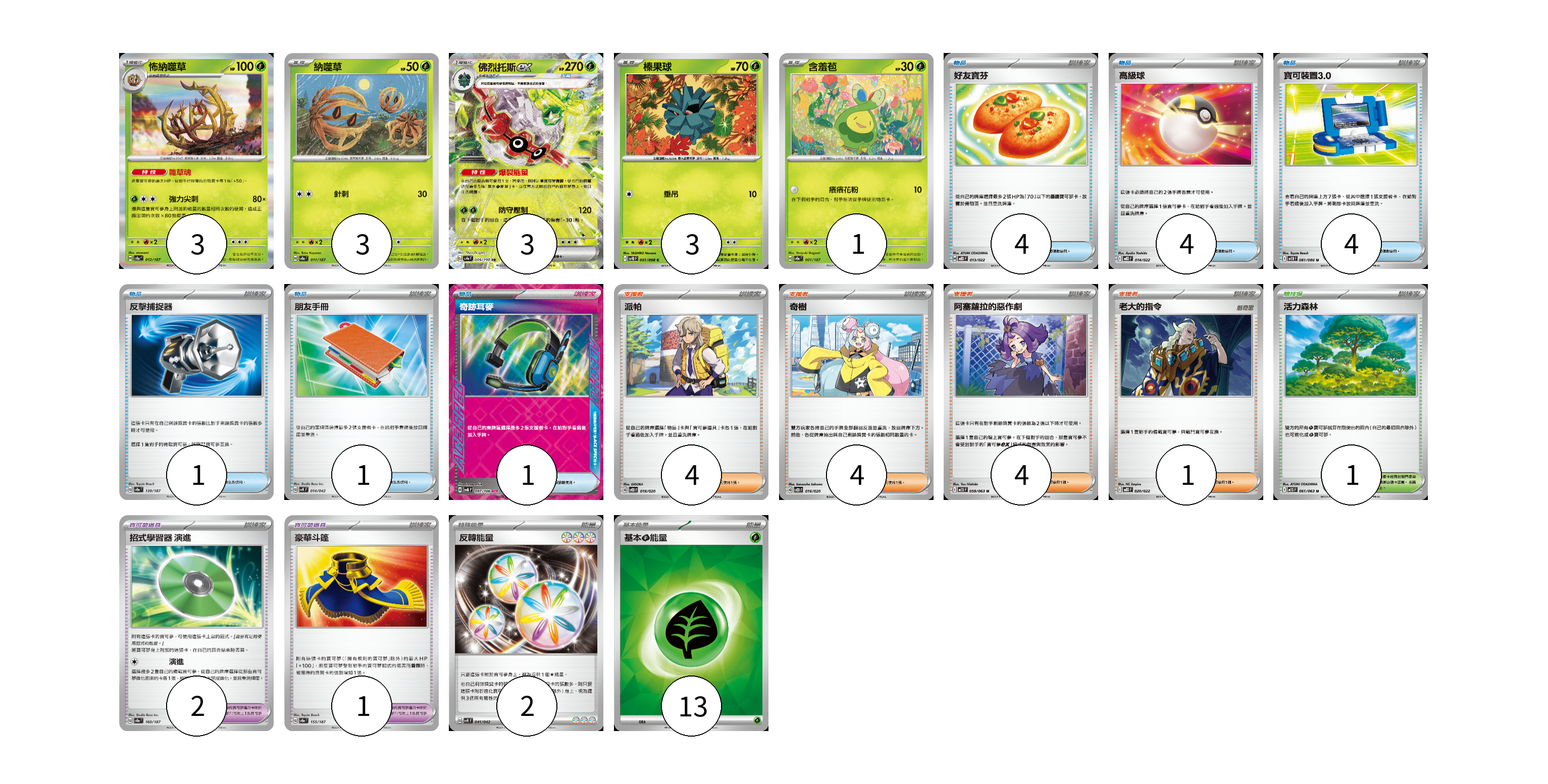 牌組構築方案 以此牌組為基礎新構築牌組 顯示卡面 顯示列表 寶可夢卡(13) 3 3 3 3 1 寶可夢道具(3) 2 1 物品卡(15) 4 4 4 1 1 1 支援者卡(13) 4 4 4 1 競技場卡(1) 1 能量卡(15) 2 13 寶可夢卡(13) 卡牌名稱 張數 卡牌名稱 張數 怖納噬草 SV8a 012/187 03 納噬草 SV8a 011/187 03 佛烈托斯ex SV4a 009/190 03 榛果球 SV10 001/098 03 含羞苞 SV8a 001/187 01 寶可夢道具(3) 卡牌名稱 張數 卡牌名稱 張數 招式學習器 演進 SV8a 160/187 02 豪華斗篷 SV8a 155/187 01 物品卡(15) 卡牌名稱 張數 卡牌名稱 張數 好友寶芬 MBD 013/022 04 高級球 MBD 014/022 04 寶可裝置3.0 SV11B 081/086 04 反擊捕捉器 SV8a 139/187 01 朋友手冊 SVK 014/042 01 奇跡耳麥 SV8 097/106 01 支援者卡(13) 卡牌名稱 張數 卡牌名稱 張數 派帕 SVOD 018/020 04 奇樹 SVOD 016/020 04 阿塞蘿拉的惡作劇 M1S 059/063 04 老大的指令 MBD 020/022 01 競技場卡(1) 卡牌名稱 張數 卡牌名稱 張數 活力森林 M1S 061/063 01 能量卡(15) 卡牌名稱 張數 卡牌名稱 張數 反轉能量 SVK 041/042 02 基本【草】能量 SVM GRA 13 以此牌組為基礎新構築牌組 牌組編碼 pXpKtn-isTUpg-sVfAPA copy 列印牌組單 牌組編碼已複製 分享至SNS