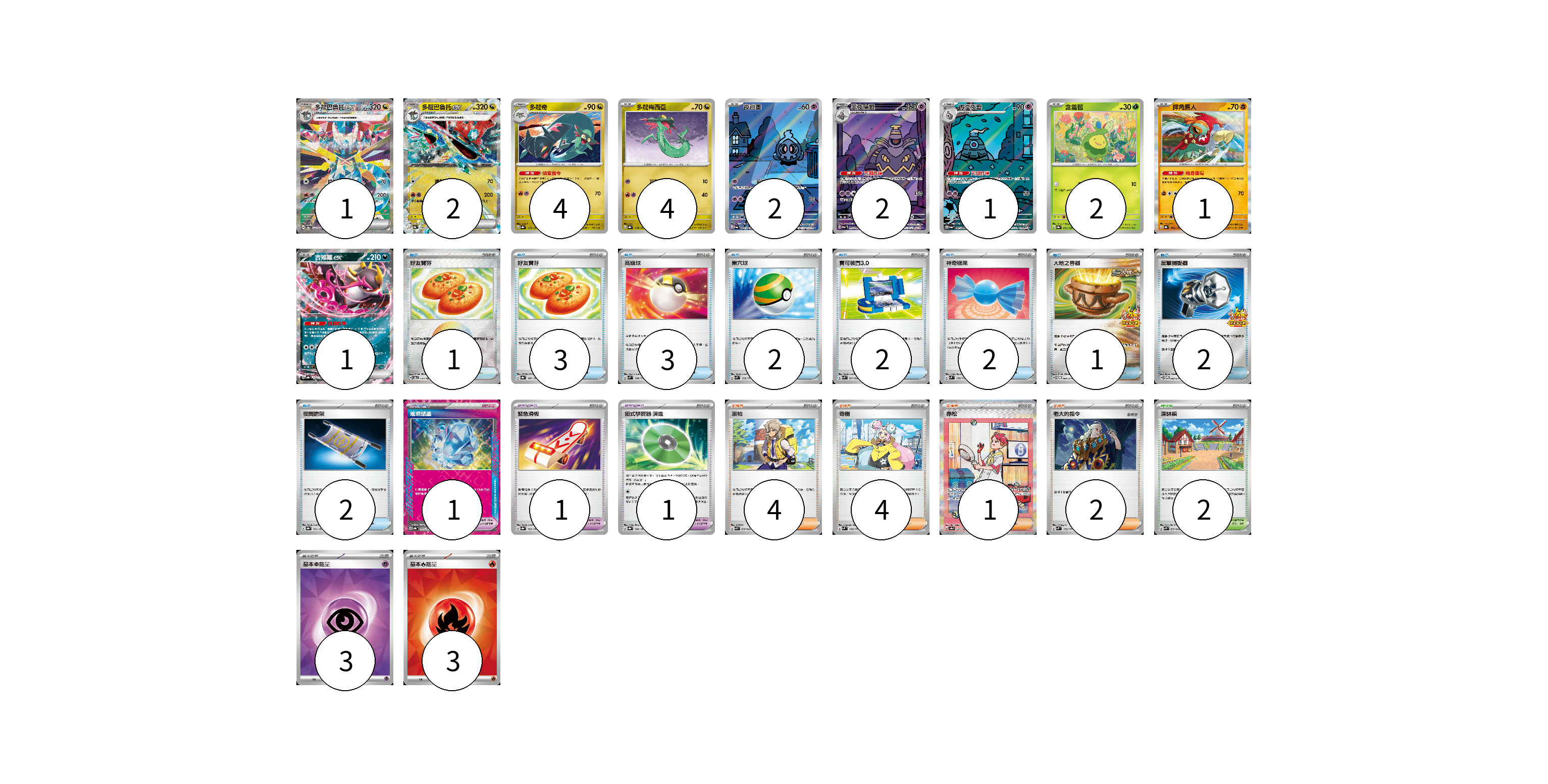 牌組構築方案 以此牌組為基礎新構築牌組 顯示卡面 顯示列表 寶可夢卡(20) 1 2 4 4 2 2 1 2 1 1 寶可夢道具(3) 1 1 1 物品卡(18) 1 3 3 2 2 2 1 2 2 支援者卡(11) 4 4 1 2 競技場卡(2) 2 能量卡(6) 3 3 寶可夢卡(20) 卡牌名稱 張數 卡牌名稱 張數 多龍巴魯托ex SV8a 221/187 01 多龍巴魯托ex SV8a 120/187 02 多龍奇 SV8a 119/187 04 多龍梅西亞 SV8a 118/187 04 夜巡靈 SV6a 068/064 02 黑夜魔靈 SV6a 070/064 02 彷徨夜靈 SV6a 069/064 01 含羞苞 SV8a 001/187 02 摔角鷹人 SV8a 084/187 01 吉雉雞ex SV8a 104/187 01 寶可夢道具(3) 卡牌名稱 張數 卡牌名稱 張數 璀璨結晶 SV8a 152/187 01 緊急滑板 SV8a 153/187 01 招式學習器 演進 SV8a 160/187 01 物品卡(18) 卡牌名稱 張數 卡牌名稱 張數 好友寶芬 SV8a 147/187 01 好友寶芬 SV8a 147/187 03 高級球 SVM 134/175 03 巢穴球 SVM 133/175 02 寶可裝置3.0 SVK 021/042 02 神奇糖果 SVM 135/175 02 大地之容器 SV-P 084/SV-P 01 反擊捕捉器 SV-P 083/SV-P 02 夜間擔架 SV8a 151/187 02 支援者卡(11) 卡牌名稱 張數 卡牌名稱 張數 派帕 SVK 035/042 04 奇樹 SVM 160/175 04 赤松 SV8a 227/187 01 老大的指令 SVM 172/175 02 競技場卡(2) 卡牌名稱 張數 卡牌名稱 張數 深缽鎮 SVK 039/042 02 能量卡(6) 卡牌名稱 張數 卡牌名稱 張數 基本【超】能量 SVK PSY 03 基本【火】能量 SVK FIR 03 以此牌組為基礎新構築牌組 牌組編碼 pahTrk-EKvTlV-MytMLl copy 列印牌組單 牌組編碼已複製 分享至SNS