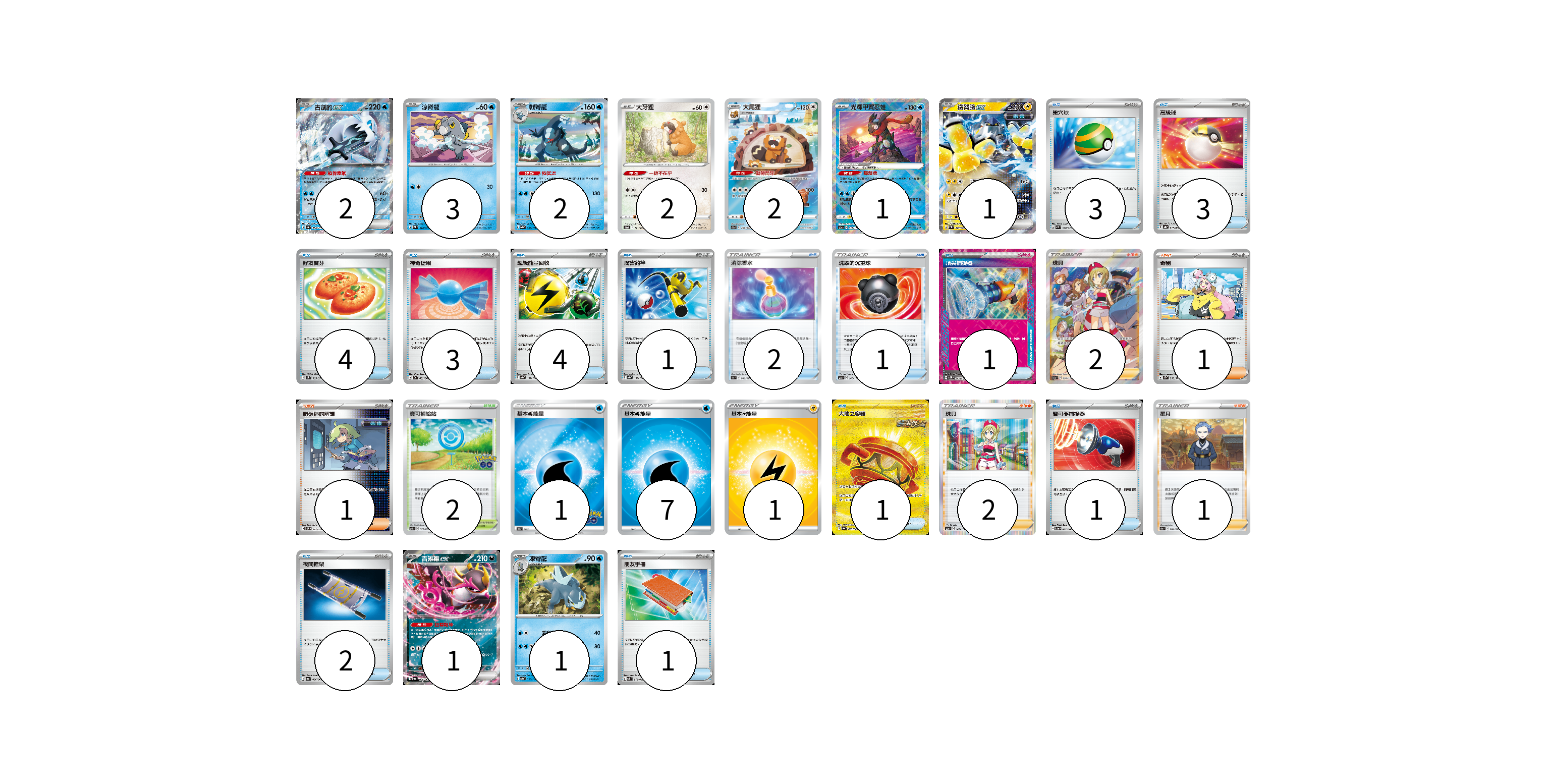 牌組構築方案 以此牌組為基礎新構築牌組 顯示卡面 顯示列表 寶可夢卡(15) 2 3 2 2 2 1 1 1 1 物品卡(27) 3 3 4 3 4 1 2 1 1 1 1 2 1 支援者卡(7) 2 1 1 2 1 競技場卡(2) 2 能量卡(9) 1 7 1 寶可夢卡(15) 卡牌名稱 張數 卡牌名稱 張數 古劍豹ex SV4a 054/190 02 涼脊龍 SV2P 024/071 03 戟脊龍 SV4a 053/190 02 大牙狸 S12a 121/172 02 大尾狸 S12a 200/172 02 光輝甲賀忍蛙 S12a 033/172 01 鐵臂膀ex SV4M 027/066 01 吉雉雞ex SV6a 038/064 01 凍脊龍 SV4a 052/190 01 物品卡(27) 卡牌名稱 張數 卡牌名稱 張數 巢穴球 SV1S 070/078 03 高級球 SVHK 013/022 03 好友寶芬 SV5K 063/071 04 神奇糖果 SV3a 053/062 03 超級能量回收 SV4a 157/190 04 厲害釣竿 SV4a 158/190 01 消除香水 S9a 063/067 02 洗翠的沉重球 S12a 140/172 01 頂尖捕捉器 SV5M 062/071 01 大地之容器 SV6a 093/064 01 寶可夢捕捉器 SV5a 057/066 01 夜間擔架 SV6a 056/064 02 朋友手冊 SVK 014/042 01 支援者卡(7) 卡牌名稱 張數 卡牌名稱 張數 珠貝 S12a 236/172 02 奇樹 SV2D 069/071 01 暗碼迷的解讀 SV5M 067/071 01 珠貝 S12a 149/172 02 星月 S9a 064/067 01 競技場卡(2) 卡牌名稱 張數 卡牌名稱 張數 寶可補給站 S10b 071/071 02 能量卡(9) 卡牌名稱 張數 卡牌名稱 張數 基本水能量 S10b WAT 01 基本【水】能量 SI WAT 07 基本【雷】能量 SI LIG 01 以此牌組為基礎新構築牌組 牌組編碼 pbsFEk-pNCJuS-AvEWCm copy 列印牌組單 牌組編碼已複製 分享至SNS