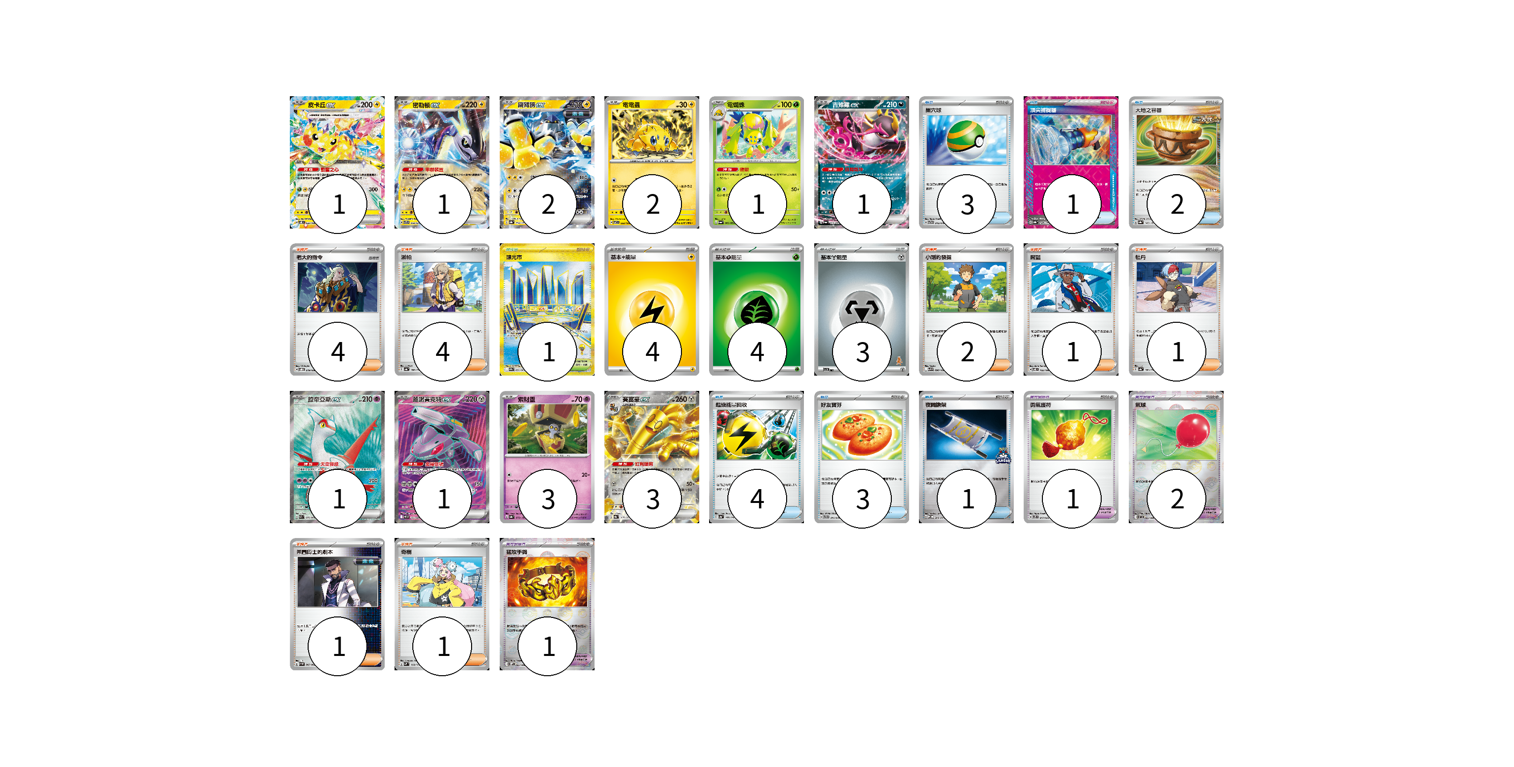 牌組構築方案 以此牌組為基礎新構築牌組 顯示卡面 顯示列表 寶可夢卡(16) 1 1 2 2 1 1 1 1 3 3 寶可夢道具(4) 1 2 1 物品卡(14) 3 1 2 4 3 1 支援者卡(14) 4 4 2 1 1 1 1 競技場卡(1) 1 能量卡(11) 4 4 3 寶可夢卡(16) 卡牌名稱 張數 卡牌名稱 張數 皮卡丘ex SV8 033/106 01 密勒頓ex SVTR 008/021 01 鐵臂膀ex SV8a 054/187 02 電電蟲 SV7 032/102 02 電蜘蛛 SV6a 002/064 01 吉雉雞ex SV6a 038/064 01 拉帝亞斯ex SV7a 078/064 01 蓋諾賽克特ex SV11B 164/086 01 索財靈 SV8a 073/187 03 賽富豪ex SV8a 117/187 03 寶可夢道具(4) 卡牌名稱 張數 卡牌名稱 張數 勇氣護符 SVTS 017/022 01 氣球 SV11B 082/086 02 猛攻手鐲 SV11W 082/086 01 物品卡(14) 卡牌名稱 張數 卡牌名稱 張數 巢穴球 SVTG 012/019 03 頂尖捕捉器 SV8a 148/187 01 大地之容器 SV8a 143/187 02 超級能量回收 SV4a 157/190 04 好友寶芬 SVTG 011/019 03 夜間擔架 SV-P 204/SV-P 01 支援者卡(14) 卡牌名稱 張數 卡牌名稱 張數 老大的指令 SVOD 019/020 04 派帕 SV4a 180/190 04 小剛的發掘 SV9 096/100 02 席藍 SV8 102/106 01 牡丹 SV4a 182/190 01 弗圖博士的劇本 SV4M 065/066 01 奇樹 SVM 160/175 01 競技場卡(1) 卡牌名稱 張數 卡牌名稱 張數 釀光市 SV9a 092/063 01 能量卡(11) 卡牌名稱 張數 卡牌名稱 張數 基本【雷】能量 SVF LIG 04 基本【草】能量 SVTM GRA 04 基本【鋼】能量 SVI MET 03 以此牌組為基礎新構築牌組 牌組編碼 penCWw-zLiLMu-tGzaGh copy 列印牌組單 牌組編碼已複製 分享至SNS