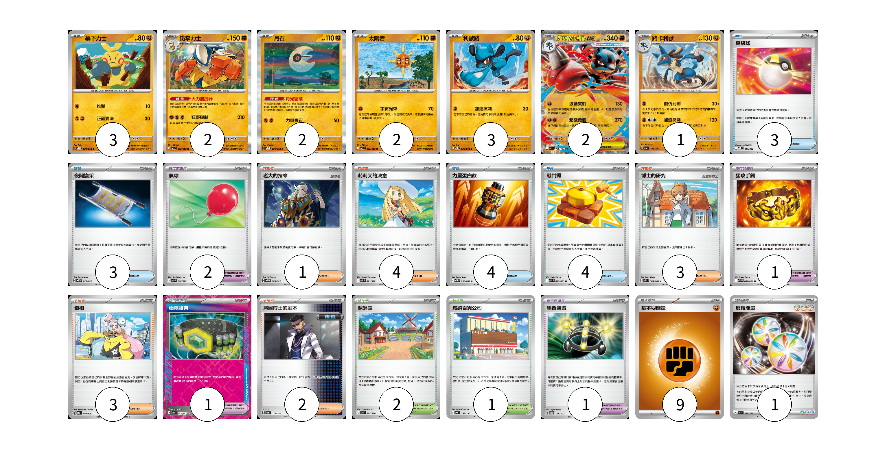 牌組構築方案 以此牌組為基礎新構築牌組 顯示卡面 顯示列表 寶可夢卡(15) 3 2 2 2 3 2 1 寶可夢道具(5) 2 1 1 1 物品卡(14) 3 3 4 4 支援者卡(13) 1 4 3 3 2 競技場卡(3) 2 1 能量卡(10) 9 1 寶可夢卡(15) 卡牌名稱 張數 卡牌名稱 張數 幕下力士 M1L 024/063 03 鐵掌力士 M1L 025/063 02 月石 M1L 026/063 02 太陽岩 M1L 027/063 02 利歐路 M1L 028/063 03 超級路卡利歐ex M1L 029/063 02 路卡利歐 SV4a 105/190 01 寶可夢道具(5) 卡牌名稱 張數 卡牌名稱 張數 氣球 MBD 018/022 02 猛攻手鐲 SV11W 082/086 01 極限腰帶 SV8a 159/187 01 學習裝置 SVTM 016/022 01 物品卡(14) 卡牌名稱 張數 卡牌名稱 張數 高級球 MBD 014/022 03 夜間擔架 MBD 016/022 03 力量蛋白飲 M1L 058/063 04 戰鬥鑼 M1L 059/063 04 支援者卡(13) 卡牌名稱 張數 卡牌名稱 張數 老大的指令 MBD 020/022 01 莉莉艾的決意 MBD 021/022 04 博士的研究 SV11B 084/086 03 奇樹 SVOD 016/020 03 弗圖博士的劇本 SV8a 175/187 02 競技場卡(3) 卡牌名稱 張數 卡牌名稱 張數 深缽鎮 SV4a 185/190 02 城鎮百貨公司 SV4a 183/190 01 能量卡(10) 卡牌名稱 張數 卡牌名稱 張數 基本【鬥】能量 M-P FIG 09 反轉能量 SV4a 189/190 01 以此牌組為基礎新構築牌組 牌組編碼 phgkHu-mAqTkM-LqwmiQ copy 列印牌組單 牌組編碼已複製 分享至SNS