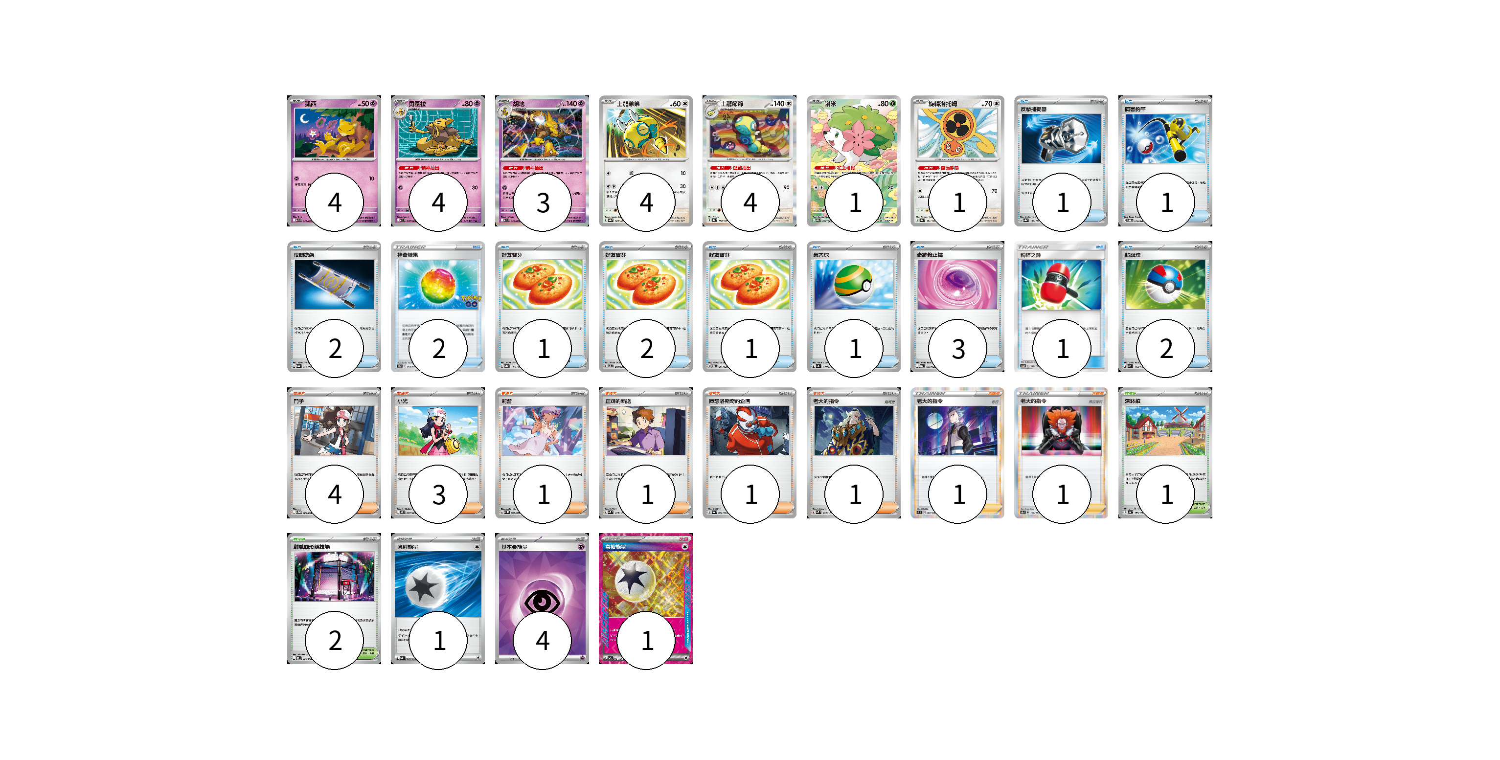 牌組構築方案 以此牌組為基礎新構築牌組 顯示卡面 顯示列表 寶可夢卡(21) 4 4 3 4 4 1 1 物品卡(17) 1 1 2 2 1 2 1 1 3 1 2 支援者卡(13) 4 3 1 1 1 1 1 1 競技場卡(3) 1 2 能量卡(6) 1 4 1 寶可夢卡(21) 卡牌名稱 張數 卡牌名稱 張數 凱西 M1S 036/063 04 勇基拉 M1S 037/063 04 胡地 M1S 038/063 03 土龍弟弟 SV8a 129/187 04 土龍節節 SV8a 130/187 04 謝米 SV9a 066/063 01 旋轉洛托姆 SV8a 131/187 01 物品卡(17) 卡牌名稱 張數 卡牌名稱 張數 反擊捕捉器 SV8a 139/187 01 厲害釣竿 SVOD 010/020 01 夜間擔架 SV6a 056/064 02 神奇糖果 S10b 066/071 02 好友寶芬 SV8a 147/187 01 好友寶芬 SVTL 010/021 02 好友寶芬 SVTM 011/022 01 巢穴球 SV1S 070/078 01 奇跡修正檔 MBD 017/022 03 粉碎之錘 AC2D 142/176 01 超級球 SVM 132/175 02 支援者卡(13) 卡牌名稱 張數 卡牌名稱 張數 鬥子 SV11W 085/086 04 小光 M2 077/080 03 莉普 SV4M 066/066 01 正輝的輸送 SVM 173/175 01 庫瑟洛斯奇的企圖 SV6a 062/064 01 老大的指令 SVM 172/175 01 老大的指令(赤日) S9 097/100 01 老大的指令(弗拉達利) S8b 158/184 01 競技場卡(3) 卡牌名稱 張數 卡牌名稱 張數 深缽鎮 SV4a 185/190 01 對戰圓形競技場 M2 079/080 02 能量卡(6) 卡牌名稱 張數 卡牌名稱 張數 噴射能量 SVK 040/042 01 基本【超】能量 SVOD PSY 04 富裕能量 SV7a 064/064 01 以此牌組為基礎新構築牌組 牌組編碼 pkSwBW-WMGvXr-KyLWsb copy 列印牌組單 牌組編碼已複製 分享至SNS