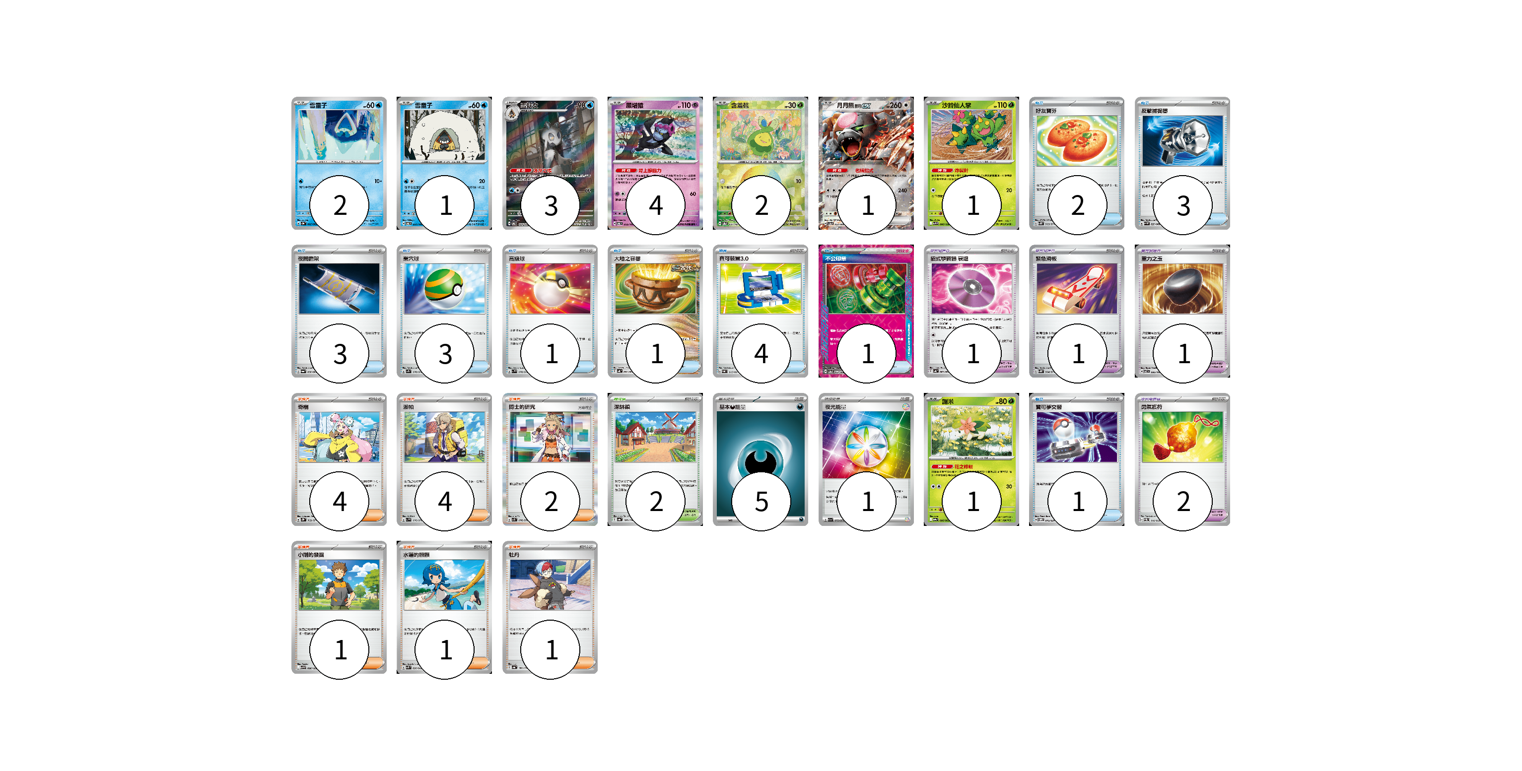 牌組構築方案 以此牌組為基礎新構築牌組 顯示卡面 顯示列表 寶可夢卡(15) 2 1 3 4 2 1 1 1 寶可夢道具(5) 1 1 1 2 物品卡(19) 2 3 3 3 1 1 4 1 1 支援者卡(13) 4 4 2 1 1 1 競技場卡(2) 2 能量卡(6) 5 1 寶可夢卡(15) 卡牌名稱 張數 卡牌名稱 張數 雪童子 SV3a 005/062 02 雪童子 SV6 031/101 01 雪妖女 SV6 104/101 03 願增猿 SV6 055/101 04 含羞苞 SV8a 001/187 02 月月熊 赫月 ex SV5a 052/066 01 沙鈴仙人掌 SV9 006/100 01 謝米 SV9a 006/063 01 寶可夢道具(5) 卡牌名稱 張數 卡牌名稱 張數 招式學習器 衰退 SV4K 063/066 01 緊急滑板 SV5K 064/071 01 重力之玉 SV7 095/102 01 勇氣護符 SVEM 016/020 02 物品卡(19) 卡牌名稱 張數 卡牌名稱 張數 好友寶芬 SV5K 063/071 02 反擊捕捉器 SV4M 059/066 03 夜間擔架 SV6a 056/064 03 巢穴球 SV1S 070/078 03 高級球 SV1V 070/078 01 大地之容器 SV4K 060/066 01 寶可裝置3.0 SVAL 015/021 04 不公印章 SV5a 053/066 01 寶可夢交替 SVOM 015/021 01 支援者卡(13) 卡牌名稱 張數 卡牌名稱 張數 奇樹 SV2D 069/071 04 派帕 SV1V 076/078 04 博士的研究(奧琳博士) SV1S 076/078 02 小剛的發掘 SV9 096/100 01 水蓮的照顧 SVK 028/042 01 牡丹 SV4a 182/190 01 競技場卡(2) 卡牌名稱 張數 卡牌名稱 張數 深缽鎮 SV4a 185/190 02 能量卡(6) 卡牌名稱 張數 卡牌名稱 張數 基本惡能量 sv-p DAR 05 夜光能量 SV1a 073/073 01 以此牌組為基礎新構築牌組 牌組編碼 pldOUL-LWcdSX-XZIpCa copy 列印牌組單 牌組編碼已複製 分享至SNS