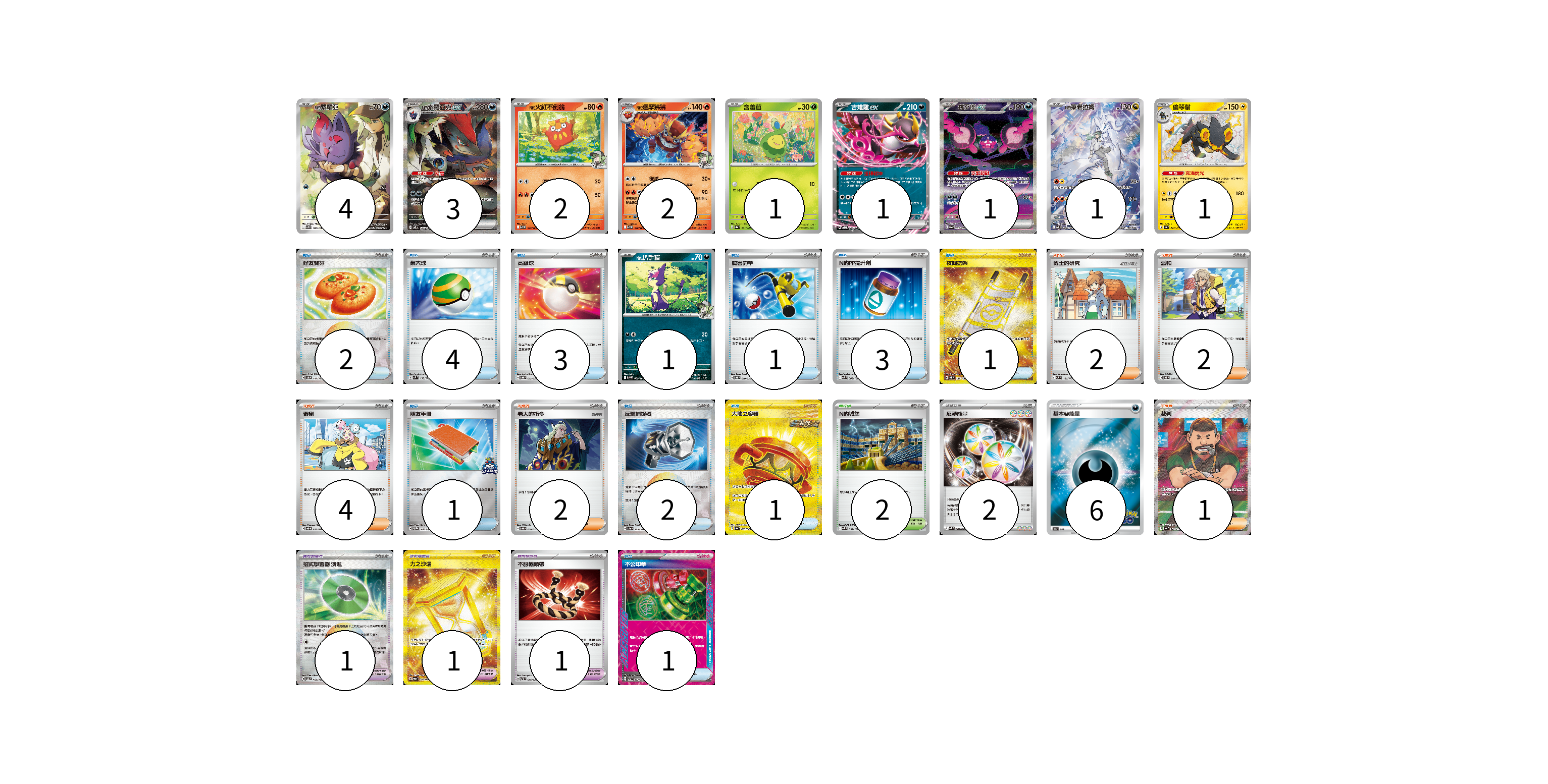 牌組構築方案 以此牌組為基礎新構築牌組 顯示卡面 顯示列表 寶可夢卡(17) 4 3 2 2 1 1 1 1 1 1 寶可夢道具(3) 1 1 1 物品卡(19) 2 4 3 1 3 1 1 2 1 1 支援者卡(11) 2 2 4 2 1 競技場卡(2) 2 能量卡(8) 2 6 寶可夢卡(17) 卡牌名稱 張數 卡牌名稱 張數 N的索羅亞 SV9 108/100 04 N的索羅亞克ex SV9 127/100 03 N的火紅不倒翁 SV9 015/100 02 N的達摩狒狒 SV9 016/100 02 含羞苞 SV8a 001/187 01 吉雉雞ex SVOD 004/020 01 桃歹郎ex SV6a 090/064 01 N的萊希拉姆 SV9 109/100 01 倫琴貓 SV4a 242/190 01 N的扒手貓 SV9 059/100 01 寶可夢道具(3) 卡牌名稱 張數 卡牌名稱 張數 招式學習器 演進 SV8a 160/187 01 力之沙漏 SV6a 094/064 01 不服輸頭帶 SVTL 016/021 01 物品卡(19) 卡牌名稱 張數 卡牌名稱 張數 好友寶芬 SV8a 147/187 02 巢穴球 SVM 133/175 04 高級球 SVOD 012/020 03 厲害釣竿 SVOD 010/020 01 N的PP提升劑 SV9 089/100 03 夜間擔架 SV8 137/106 01 朋友手冊 SV-P 182/SV-P 01 反擊捕捉器 SV8a 139/187 02 大地之容器 SV6a 093/064 01 不公印章 SV5a 053/066 01 支援者卡(11) 卡牌名稱 張數 卡牌名稱 張數 博士的研究 SVM 166/175 02 派帕 SVOD 018/020 02 奇樹 SVOD 016/020 04 老大的指令 SVOD 019/020 02 裁判 SV4a 342/190 01 競技場卡(2) 卡牌名稱 張數 卡牌名稱 張數 N的城堡 SV9 097/100 02 能量卡(8) 卡牌名稱 張數 卡牌名稱 張數 反轉能量 SVK 041/042 02 基本惡能量 S10b DAR 06 以此牌組為基礎新構築牌組 牌組編碼 plhcEV-TJjrUC-jmfthR copy 列印牌組單 牌組編碼已複製 分享至SNS