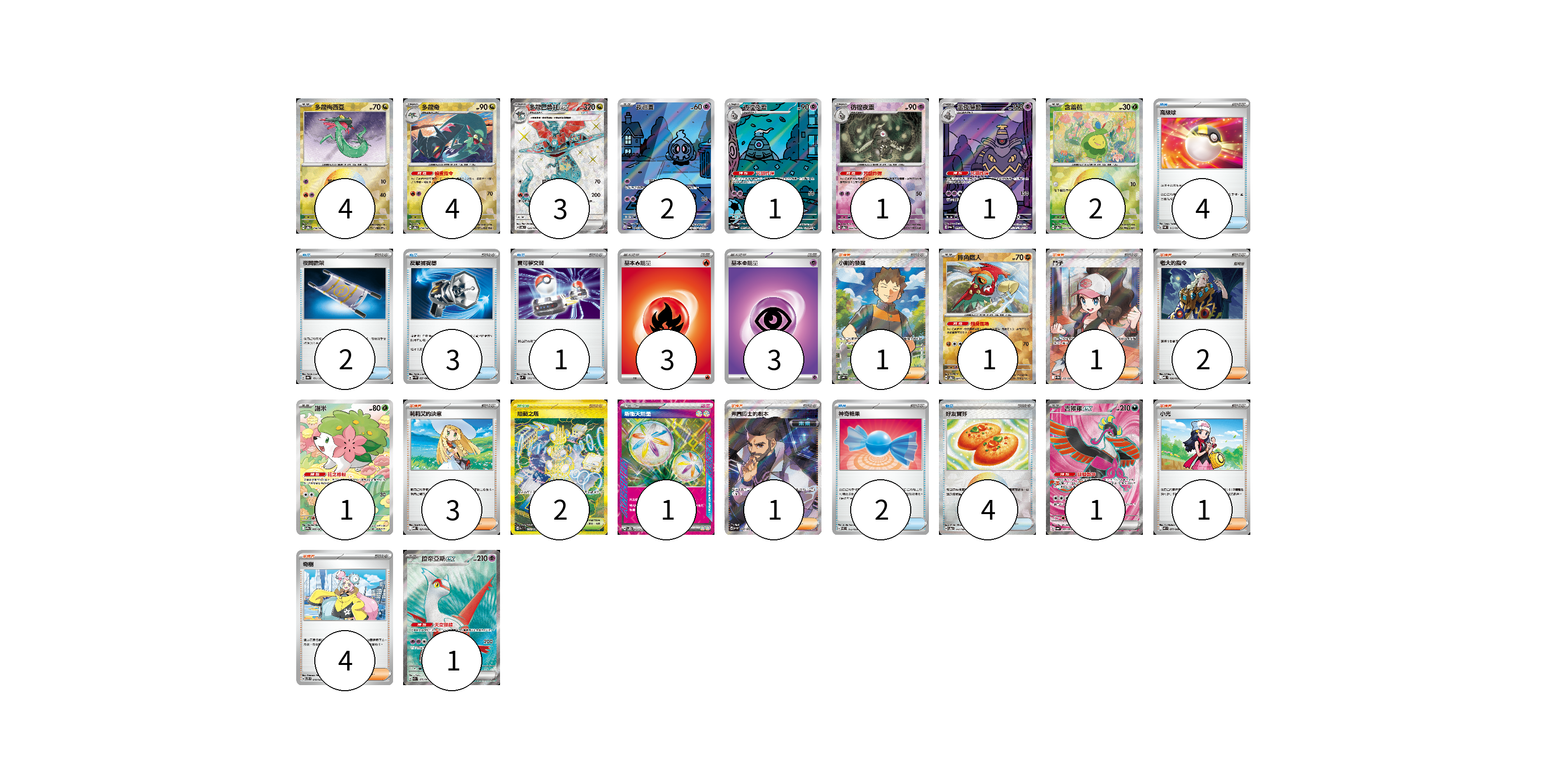牌組構築方案 以此牌組為基礎新構築牌組 顯示卡面 顯示列表 寶可夢卡(22) 4 4 3 2 1 1 1 2 1 1 1 1 物品卡(16) 4 2 3 1 2 4 支援者卡(13) 1 1 2 3 1 1 4 競技場卡(2) 2 能量卡(7) 3 3 1 寶可夢卡(22) 卡牌名稱 張數 卡牌名稱 張數 多龍梅西亞 SV8a 118/187 04 多龍奇 SV8a 119/187 04 多龍巴魯托ex SV6 120/101 03 夜巡靈 SV6a 068/064 02 彷徨夜靈 SV6a 069/064 01 彷徨夜靈 SV8a 065/187 01 黑夜魔靈 SV6a 070/064 01 含羞苞 SV8a 001/187 02 摔角鷹人 SV8a 084/187 01 謝米 SV9a 066/063 01 吉雉雞ex SV6a 081/064 01 拉帝亞斯ex SV7a 078/064 01 物品卡(16) 卡牌名稱 張數 卡牌名稱 張數 高級球 SVAL 013/021 04 夜間擔架 SV8a 151/187 02 反擊捕捉器 SV4M 059/066 03 寶可夢交替 SVM 136/175 01 神奇糖果 SVEL 013/020 02 好友寶芬 SV8a 147/187 04 支援者卡(13) 卡牌名稱 張數 卡牌名稱 張數 小剛的發掘 SV9 123/100 01 鬥子 SV11W 166/086 01 老大的指令 MBD 020/022 02 莉莉艾的決意 MBD 021/022 03 弗圖博士的劇本 SV4M 086/066 01 小光 M2 077/080 01 奇樹 SVTS 018/022 04 競技場卡(2) 卡牌名稱 張數 卡牌名稱 張數 阻礙之塔 SV10 132/098 02 能量卡(7) 卡牌名稱 張數 卡牌名稱 張數 基本【火】能量 SVTL FIR 03 基本【超】能量 SVTS PSY 03 新衝天能量 SV5K 071/071 01 以此牌組為基礎新構築牌組 牌組編碼 pmrEDf-NnlrJC-EoxVON copy 列印牌組單 牌組編碼已複製 分享至SNS