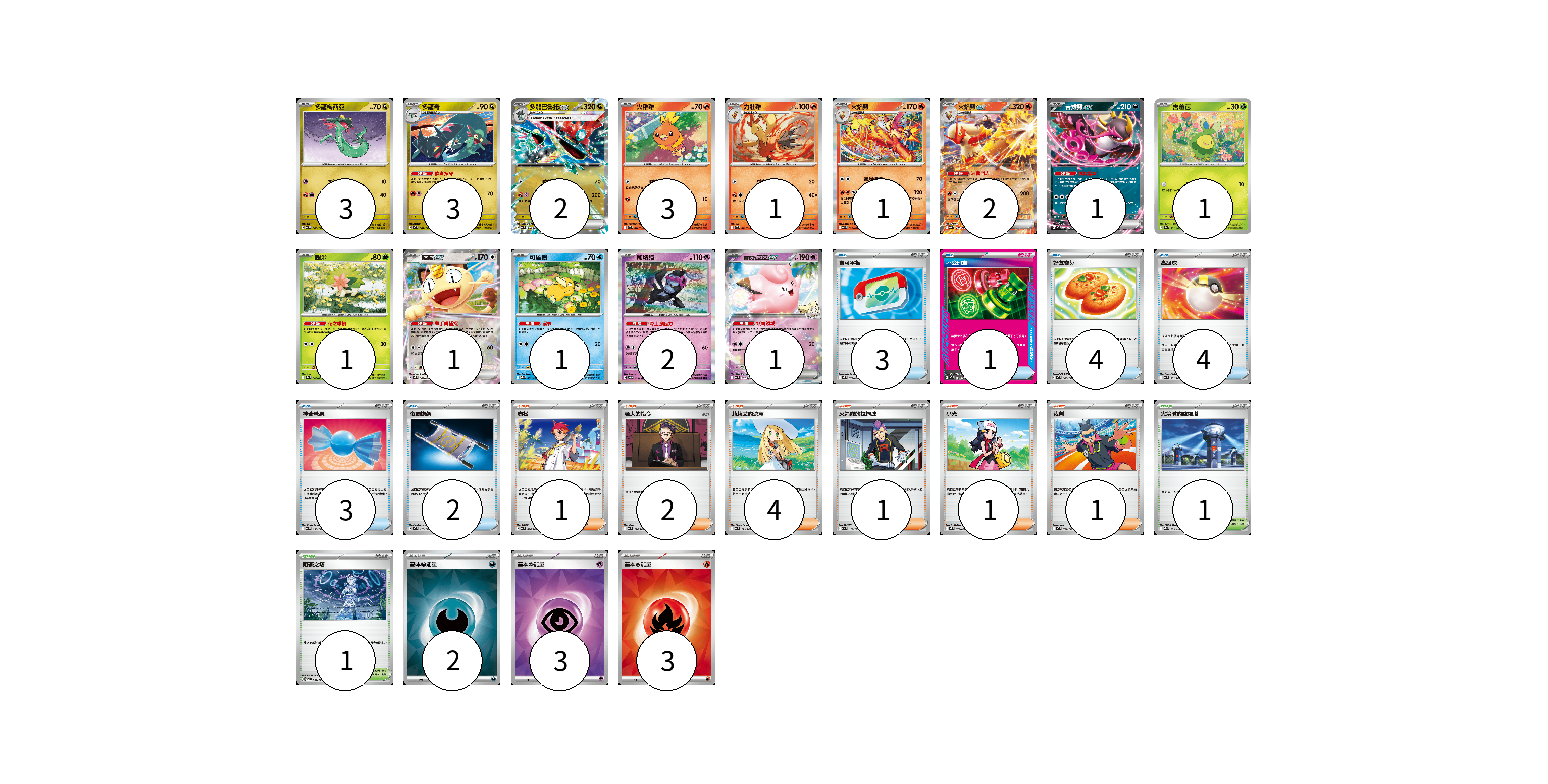 牌組構築方案 以此牌組為基礎新構築牌組 顯示卡面 顯示列表 寶可夢卡(23) 3 3 2 3 1 1 2 1 1 1 1 1 2 1 物品卡(17) 3 1 4 4 3 2 支援者卡(10) 1 2 4 1 1 1 競技場卡(2) 1 1 能量卡(8) 2 3 3 寶可夢卡(23) 卡牌名稱 張數 卡牌名稱 張數 多龍梅西亞 MC 546/742 03 多龍奇 MC 547/742 03 多龍巴魯托ex MC 548/742 02 火稚雞 SV10 018/098 03 力壯雞 SV10 019/098 01 火焰雞 SV10 020/098 01 火焰雞ex SVM 016/175 02 吉雉雞ex MC 489/742 01 含羞苞 SV8a 001/187 01 謝米 SV9a 006/063 01 喵喵ex M3 061/080 01 可達鴨 M2a 032/193 01 願增猿 SV6 055/101 02 莉莉艾的皮皮ex MC 287/742 01 物品卡(17) 卡牌名稱 張數 卡牌名稱 張數 寶可平板 M3 070/080 03 不公印章 MC 633/742 01 好友寶芬 MC 648/742 04 高級球 MC 651/742 04 神奇糖果 MC 655/742 03 夜間擔架 MC 670/742 02 支援者卡(10) 卡牌名稱 張數 卡牌名稱 張數 赤松 MC 696/742 01 老大的指令 MC 724/742 02 莉莉艾的決意 MC 729/742 04 火箭隊的拉姆達 M2a 179/193 01 小光 M2 077/080 01 裁判 MC 711/742 01 競技場卡(2) 卡牌名稱 張數 卡牌名稱 張數 火箭隊的監視塔 M2a 189/193 01 阻礙之塔 SV6 100/101 01 能量卡(8) 卡牌名稱 張數 卡牌名稱 張數 基本【惡】能量 SVOM DAR 02 基本【超】能量 SVOD PSY 03 基本【火】能量 SVM FIR 03 以此牌組為基礎新構築牌組 牌組編碼 ppXtBy-HDEOUq-FPsXin copy 列印牌組單 牌組編碼已複製 分享至SNS