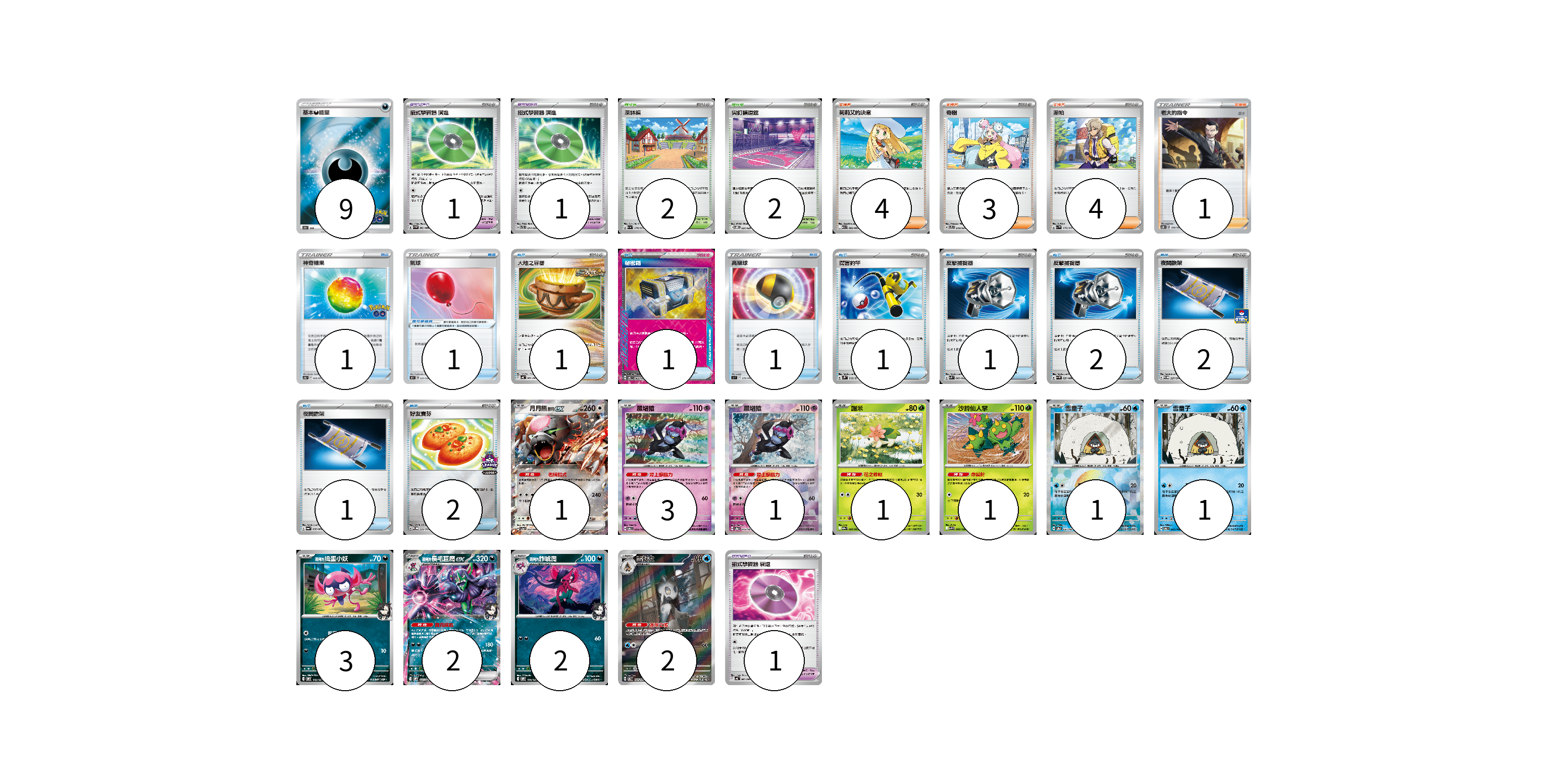 牌組構築方案 以此牌組為基礎新構築牌組 顯示卡面 顯示列表 寶可夢卡(18) 1 3 1 1 1 1 1 3 2 2 2 寶可夢道具(7) 1 1 3 1 1 物品卡(13) 1 1 1 1 1 1 2 2 1 2 支援者卡(9) 4 4 1 競技場卡(4) 2 2 能量卡(9) 9 寶可夢卡(18) 卡牌名稱 張數 卡牌名稱 張數 月月熊 赫月 ex SV5a 052/066 01 願增猿 SV6 055/101 03 願增猿 SV8a 075/187 01 謝米 SV9a 006/063 01 沙鈴仙人掌 SV9 006/100 01 雪童子 SV8a 037/187 01 雪童子 SV6 031/101 01 <瑪俐的>搗蛋小妖 SVOM 005/021 03 <瑪俐的>長毛巨魔ex SVOM 007/021 02 <瑪俐的>詐唬魔 SVOM 006/021 02 雪妖女 SV6 104/101 02 寶可夢道具(7) 卡牌名稱 張數 卡牌名稱 張數 招式學習器 演進 SV4M 063/066 01 招式學習器 演進 SVTL 017/021 01 奇樹 SVTL 018/021 03 氣球 SK 021/030 01 招式學習器 衰退 SV4K 063/066 01 物品卡(13) 卡牌名稱 張數 卡牌名稱 張數 神奇糖果 S10b 066/071 01 大地之容器 SV4K 060/066 01 秘密箱 SV6 092/101 01 高級球 SI 375/414 01 厲害釣竿 SV2P 066/071 01 反擊捕捉器 SVK 009/042 01 反擊捕捉器 SV4M 059/066 02 夜間擔架 SV-P 227/SV-P 02 夜間擔架 SV6a 056/064 01 好友寶芬 SV-P 230/SV-P 02 支援者卡(9) 卡牌名稱 張數 卡牌名稱 張數 莉莉艾的決意 M1L 062/063 04 派帕 SV1V 076/078 04 老大的指令(坂木) SC2D 154/157 01 競技場卡(4) 卡牌名稱 張數 卡牌名稱 張數 深缽鎮 SV1a 070/073 02 尖釘鎮道館 SVOM 021/021 02 能量卡(9) 卡牌名稱 張數 卡牌名稱 張數 基本惡能量 S10b DAR 09 以此牌組為基礎新構築牌組 牌組編碼 prCXPK-JXAENk-AqOXON copy 列印牌組單 牌組編碼已複製 分享至SNS