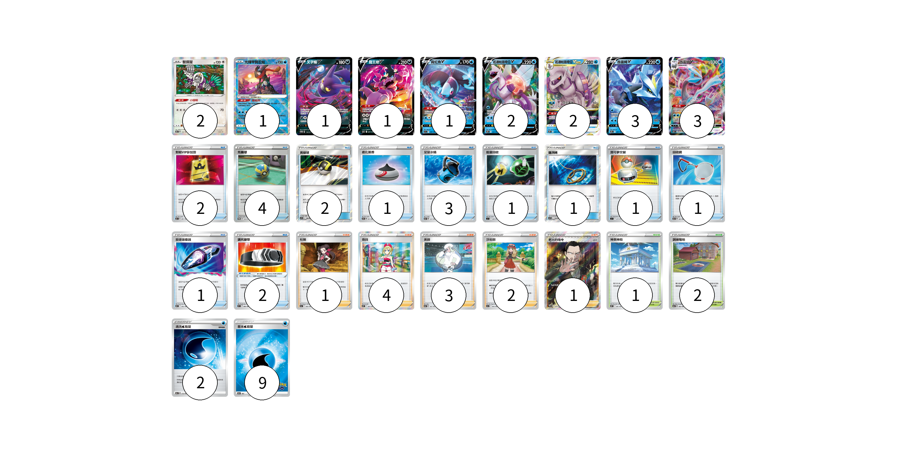 牌組構築方案 以此牌組為基礎新構築牌組 顯示卡面 顯示列表 寶可夢卡(16) 2 1 1 1 1 2 2 3 3 寶可夢道具(2) 2 物品卡(17) 2 4 2 1 3 1 1 1 1 1 支援者卡(11) 1 4 3 2 1 競技場卡(3) 1 2 能量卡(11) 2 9 寶可夢卡(16) 卡牌名稱 張數 卡牌名稱 張數 智揮猩 S8b 129/184 02 光輝甲賀忍蛙 S9a 026/067 01 叉字蝠V S-P 142/S-P 01 龍王蠍V S12a 085/172 01 霓虹魚V S9 030/100 01 起源帕路奇亞V S10P 022/067 02 起源帕路奇亞VSTAR S10P 023/067 02 酋雷姆V S11 029/100 03 酋雷姆VMAX S11 030/100 03 寶可夢道具(2) 卡牌名稱 張數 卡牌名稱 張數 講究腰帶 S9 090/100 02 物品卡(17) 卡牌名稱 張數 卡牌名稱 張數 對戰VIP參加證 S8 091/100 02 先機球 S-P 147/S-P 04 高級球 AS5b 178/186 02 進化薰香 S7D 057/067 01 足量水桶 S8b 137/184 03 能量回收 SI 365/414 01 離洞繩 AS5b 177/186 01 寶可夢交替 SI 377/414 01 回收網 S4a 157/190 01 放逐吸塵器 S11 093/100 01 支援者卡(11) 卡牌名稱 張數 卡牌名稱 張數 杜娟 S9a 065/067 01 珠貝 S10P 064/067 04 美蓉 S8b 161/184 03 莎莉娜 S11a 064/068 02 老大的指令(坂木) SC1b 170/153 01 競技場卡(3) 卡牌名稱 張數 卡牌名稱 張數 神奧神殿 S10P 067/067 01 訓練場地 S4a 180/190 02 能量卡(11) 卡牌名稱 張數 卡牌名稱 張數 清洗水能量 S8b 173/184 02 基本水能量 S10b WAT 09 以此牌組為基礎新構築牌組 牌組編碼 prwydm-MqfMKX-gzoUsI copy 列印牌組單 牌組編碼已複製 分享至SNS