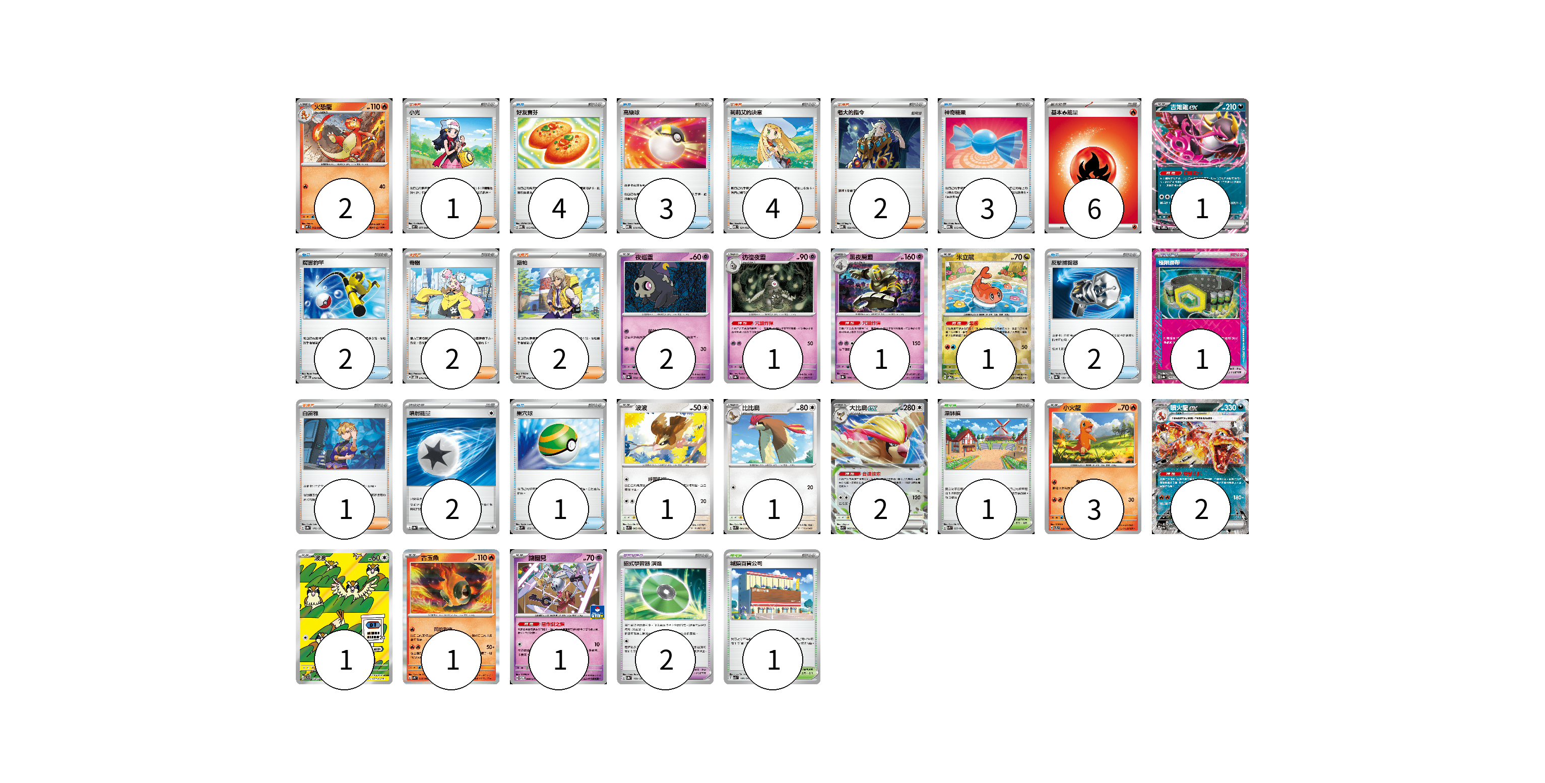 牌組構築方案 以此牌組為基礎新構築牌組 顯示卡面 顯示列表 寶可夢卡(20) 2 1 2 1 1 1 1 1 2 3 2 1 1 1 寶可夢道具(3) 1 2 物品卡(15) 4 3 3 2 2 1 支援者卡(12) 1 4 2 2 2 1 競技場卡(2) 1 1 能量卡(8) 6 2 寶可夢卡(20) 卡牌名稱 張數 卡牌名稱 張數 火恐龍 M2 012/080 02 吉雉雞ex SVOD 004/020 01 夜巡靈 SV8a 064/187 02 彷徨夜靈 SV8a 065/187 01 黑夜魔靈 SV8a 066/187 01 米立龍 SV8a 121/187 01 波波 SVK 003/042 01 比比鳥 SVK 004/042 01 大比鳥ex SVK 005/042 02 小火龍 SVTL 001/021 03 噴火龍ex SV4a 115/190 02 波波 SV3 118/108 01 古玉魚 SV4K 016/066 01 鑰圈兒 SV-P 089/SV-P 01 寶可夢道具(3) 卡牌名稱 張數 卡牌名稱 張數 極限腰帶 SV8a 159/187 01 招式學習器 演進 SV8a 160/187 02 物品卡(15) 卡牌名稱 張數 卡牌名稱 張數 好友寶芬 MBD 013/022 04 高級球 MBD 014/022 03 神奇糖果 MBG 013/022 03 厲害釣竿 SVOD 010/020 02 反擊捕捉器 SV8a 139/187 02 巢穴球 SVM 133/175 01 支援者卡(12) 卡牌名稱 張數 卡牌名稱 張數 小光 M2 077/080 01 莉莉艾的決意 MBD 021/022 04 老大的指令 MBD 020/022 02 奇樹 SVOD 016/020 02 派帕 SVOD 018/020 02 白蕾雅 SV8a 176/187 01 競技場卡(2) 卡牌名稱 張數 卡牌名稱 張數 深缽鎮 SVK 039/042 01 城鎮百貨公司 SV3 107/108 01 能量卡(8) 卡牌名稱 張數 卡牌名稱 張數 基本【火】能量 M-P FIR 06 噴射能量 SV8a 185/187 02 以此牌組為基礎新構築牌組 牌組編碼 psKpJi-xnaQEX-MqMHzk copy 列印牌組單 牌組編碼已複製 分享至SNS