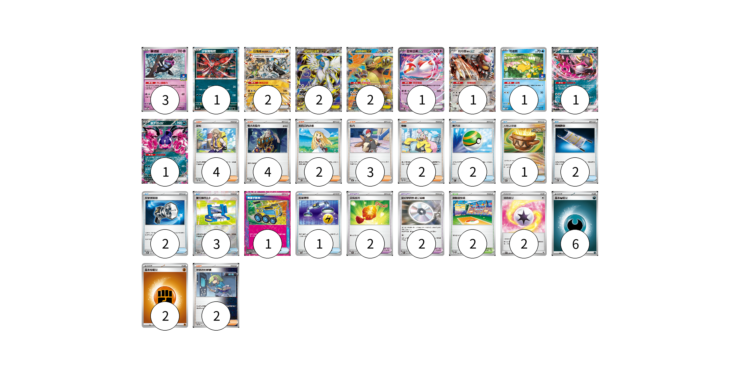 牌組構築方案 以此牌組為基礎新構築牌組 顯示卡面 顯示列表 寶可夢卡(15) 3 1 2 2 2 1 1 1 1 1 寶可夢道具(4) 2 2 物品卡(12) 2 1 2 2 3 1 1 支援者卡(17) 4 4 2 3 2 2 競技場卡(2) 2 能量卡(10) 2 6 2 寶可夢卡(15) 卡牌名稱 張數 卡牌名稱 張數 願增猿 M-P 014/M-P 03 伊裴爾塔爾 M1L 040/063 01 厄鬼椪 礎石面具ex SV8a 091/187 02 超級阿勃梭魯ex M1L 079/063 02 超級袋獸ex M1S 080/063 02 拉帝亞斯ex MBD 003/022 01 月月熊 赫月ex SV8a 134/187 01 可達鴨 SV-P 220/SV-P 01 吉雉雞ex SV6a 038/064 01 桃歹郎ex SV6a 039/064 01 寶可夢道具(4) 卡牌名稱 張數 卡牌名稱 張數 勇氣護符 SVK 024/042 02 招式學習器 能量渦輪 SV3a 056/062 02 物品卡(12) 卡牌名稱 張數 卡牌名稱 張數 巢穴球 SVM 133/175 02 大地之容器 SV8a 143/187 01 夜間擔架 MBD 016/022 02 反擊捕捉器 SV8a 139/187 02 寶可裝置3.0 SV11B 081/086 03 貴重手推車 SVK 020/042 01 能量轉移 SVAM 012/023 01 支援者卡(17) 卡牌名稱 張數 卡牌名稱 張數 派帕 SVOD 018/020 04 老大的指令 MBD 020/022 04 莉莉艾的決意 MBD 021/022 02 牡丹 SV4a 182/190 03 奇樹 SVOD 016/020 02 暗碼迷的解讀 SV5M 067/071 02 競技場卡(2) 卡牌名稱 張數 卡牌名稱 張數 激動競技場 SV8 105/106 02 能量卡(10) 卡牌名稱 張數 卡牌名稱 張數 薄霧能量 SV8a 186/187 02 基本【惡】能量 MBG DAR 06 基本【鬥】能量 M-P FIG 02 以此牌組為基礎新構築牌組 牌組編碼 psUUFy-apDFXk-QOYVKw copy 列印牌組單 牌組編碼已複製 分享至SNS