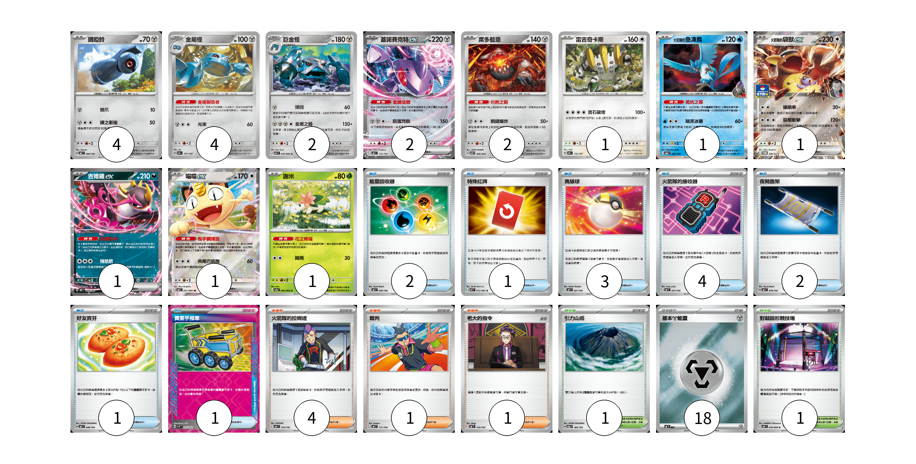 牌組構築方案 以此牌組為基礎新構築牌組 顯示卡面 顯示列表 寶可夢卡(20) 4 4 2 2 2 1 1 1 1 1 1 物品卡(14) 2 1 3 4 2 1 1 支援者卡(6) 4 1 1 競技場卡(2) 1 1 能量卡(18) 18 寶可夢卡(20) 卡牌名稱 張數 卡牌名稱 張數 鐵啞鈴 MC 496/742 04 金屬怪 SV8a 107/187 04 巨金怪 M4 059/083 02 蓋諾賽克特ex MC 512/742 02 席多藍恩 SVTH 005/018 02 雷吉奇卡斯 SV8a 132/187 01 <火箭隊的>急凍鳥 M2a 034/193 01 <火箭隊的>袋獸ex SV-P 226/SV-P 01 吉雉雞ex MC 489/742 01 喵喵ex M3 061/080 01 謝米 SV9a 006/063 01 物品卡(14) 卡牌名稱 張數 卡牌名稱 張數 能量回收器 MC 640/742 02 特殊紅牌 M4 072/083 01 高級球 MC 651/742 03 火箭隊的接收器 MC 675/742 04 夜間擔架 MC 670/742 02 好友寶芬 MC 648/742 01 貴重手推車 SVK 020/042 01 支援者卡(6) 卡牌名稱 張數 卡牌名稱 張數 火箭隊的拉姆達 MC 734/742 04 裁判 MC 711/742 01 老大的指令 MC 724/742 01 競技場卡(2) 卡牌名稱 張數 卡牌名稱 張數 引力山岳 M2a 183/193 01 對戰圓形競技場 M2 079/080 01 能量卡(18) 卡牌名稱 張數 卡牌名稱 張數 基本【鋼】能量 MC MET 18 以此牌組為基礎新構築牌組 牌組編碼 ptIvXp-OAfQsm-fbWKKA copy 列印牌組單 牌組編碼已複製 分享至SNS