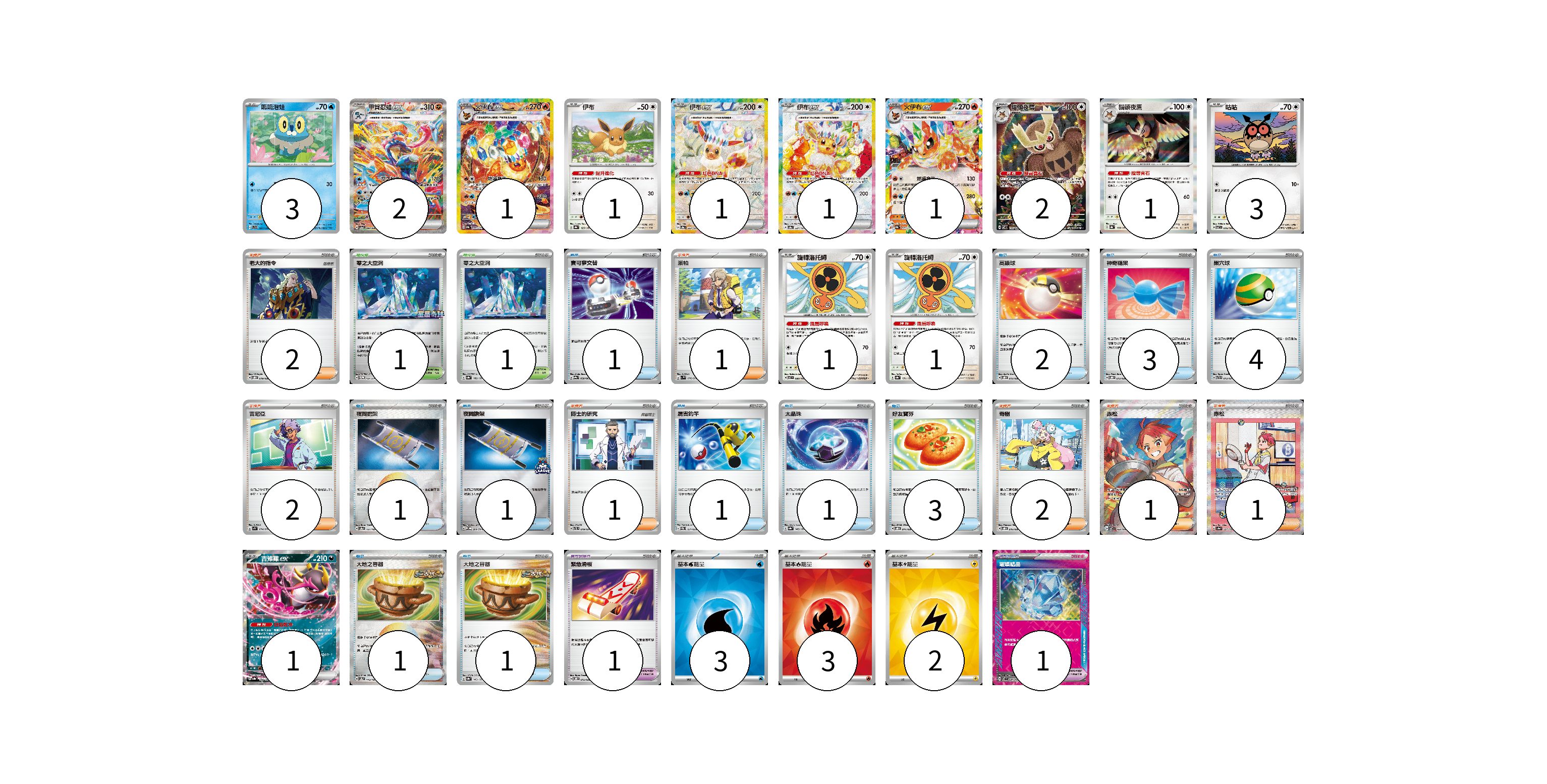 牌組構築方案 以此牌組為基礎新構築牌組 顯示卡面 顯示列表 寶可夢卡(19) 3 2 1 1 1 1 1 2 1 3 1 1 1 寶可夢道具(2) 1 1 物品卡(19) 1 2 3 4 1 1 1 1 3 1 1 支援者卡(10) 2 1 2 1 2 1 1 競技場卡(2) 1 1 能量卡(8) 3 3 2 寶可夢卡(19) 卡牌名稱 張數 卡牌名稱 張數 呱呱泡蛙 SVD 027/139 03 甲賀忍蛙ex SV5a 090/066 02 火伊布ex SV8a 202/187 01 伊布 SV8a 125/187 01 伊布ex SV8a 223/187 01 伊布ex SV8a 224/187 01 火伊布ex SV8a 022/187 01 貓頭夜鷹 SV7 114/102 02 貓頭夜鷹 SV8a 128/187 01 咕咕 SV7 076/102 03 旋轉洛托姆 SV7 080/102 01 旋轉洛托姆 SV8a 131/187 01 吉雉雞ex SV8a 104/187 01 寶可夢道具(2) 卡牌名稱 張數 卡牌名稱 張數 緊急滑板 SVOD 015/020 01 璀璨結晶 SV7 094/102 01 物品卡(19) 卡牌名稱 張數 卡牌名稱 張數 寶可夢交替 SV9a 058/063 01 高級球 SVOD 012/020 02 神奇糖果 SVOD 013/020 03 巢穴球 SVTR 013/021 04 夜間擔架 SV8a 151/187 01 夜間擔架 SV-P 204/SV-P 01 厲害釣竿 SVEM 011/020 01 太晶珠 SV8a 145/187 01 好友寶芬 SVOD 011/020 03 大地之容器 SV8a 143/187 01 大地之容器 SV8a 143/187 01 支援者卡(10) 卡牌名稱 張數 卡牌名稱 張數 老大的指令 SVOD 019/020 02 派帕 SV1V 076/078 01 吉尼亞 SV1S 074/078 02 博士的研究 SVTL 019/021 01 奇樹 SVOD 016/020 02 赤松 SV7 123/102 01 赤松 SV8a 227/187 01 競技場卡(2) 卡牌名稱 張數 卡牌名稱 張數 零之大空洞 SV-P 151/SV-P 01 零之大空洞 SV8a 182/187 01 能量卡(8) 卡牌名稱 張數 卡牌名稱 張數 基本【水】能量 SVK WAT 03 基本【火】能量 SVK FIR 03 基本【雷】能量 SVK LIG 02 以此牌組為基礎新構築牌組 牌組編碼 pvQoll-wXKWey-hpdubF copy 列印牌組單 牌組編碼已複製 分享至SNS