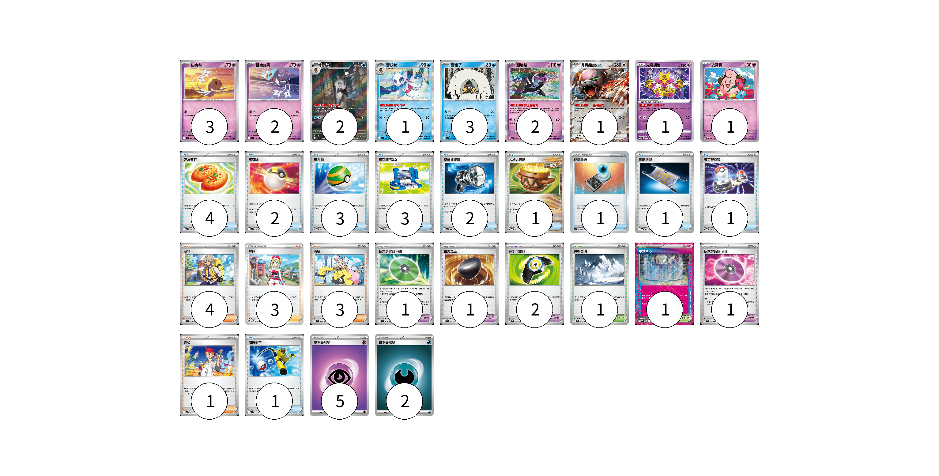 牌組構築方案 以此牌組為基礎新構築牌組 顯示卡面 顯示列表 寶可夢卡(16) 3 2 2 1 3 2 1 1 1 寶可夢道具(5) 1 1 2 1 物品卡(19) 4 2 3 3 2 1 1 1 1 1 支援者卡(11) 4 3 3 1 競技場卡(2) 1 1 能量卡(7) 5 2 寶可夢卡(16) 卡牌名稱 張數 卡牌名稱 張數 由克希 SV8 048/106 03 亞克諾姆 SV8 050/106 02 雪妖女 SV6 104/101 02 雪妖女 SV6 033/101 01 雪童子 SV6 031/101 03 願增猿 SV6 055/101 02 月月熊 赫月 ex SV5a 052/066 01 光輝胡地 SVTM 006/022 01 皮寶寶 SV3 042/108 01 寶可夢道具(5) 卡牌名稱 張數 卡牌名稱 張數 招式學習器 演進 SVK 025/042 01 重力之玉 SV7 095/102 01 反擊增幅器 SV7a 059/064 02 招式學習器 衰退 SVK 026/042 01 物品卡(19) 卡牌名稱 張數 卡牌名稱 張數 好友寶芬 SVK 015/042 04 高級球 SVK 018/042 02 巢穴球 SVK 016/042 03 寶可裝置3.0 SVK 021/042 03 反擊捕捉器 SVK 009/042 02 大地之容器 SVK 012/042 01 能量輸送 SI 367/414 01 夜間擔架 SV6a 056/064 01 寶可夢交替 SVK 022/042 01 厲害釣竿 SVK 011/042 01 支援者卡(11) 卡牌名稱 張數 卡牌名稱 張數 派帕 SVK 035/042 04 珠貝 SVTG 016/019 03 奇樹 SVK 031/042 03 赤松 SVK 027/042 01 競技場卡(2) 卡牌名稱 張數 卡牌名稱 張數 災禍雪山 SV2P 070/071 01 中立中心 SV6a 063/064 01 能量卡(7) 卡牌名稱 張數 卡牌名稱 張數 基本【超】能量 SVTS PSY 05 基本【惡】能量 SVF DAR 02 以此牌組為基礎新構築牌組 牌組編碼 pvrupD-cevPxK-GWSsgY copy 列印牌組單 牌組編碼已複製 分享至SNS