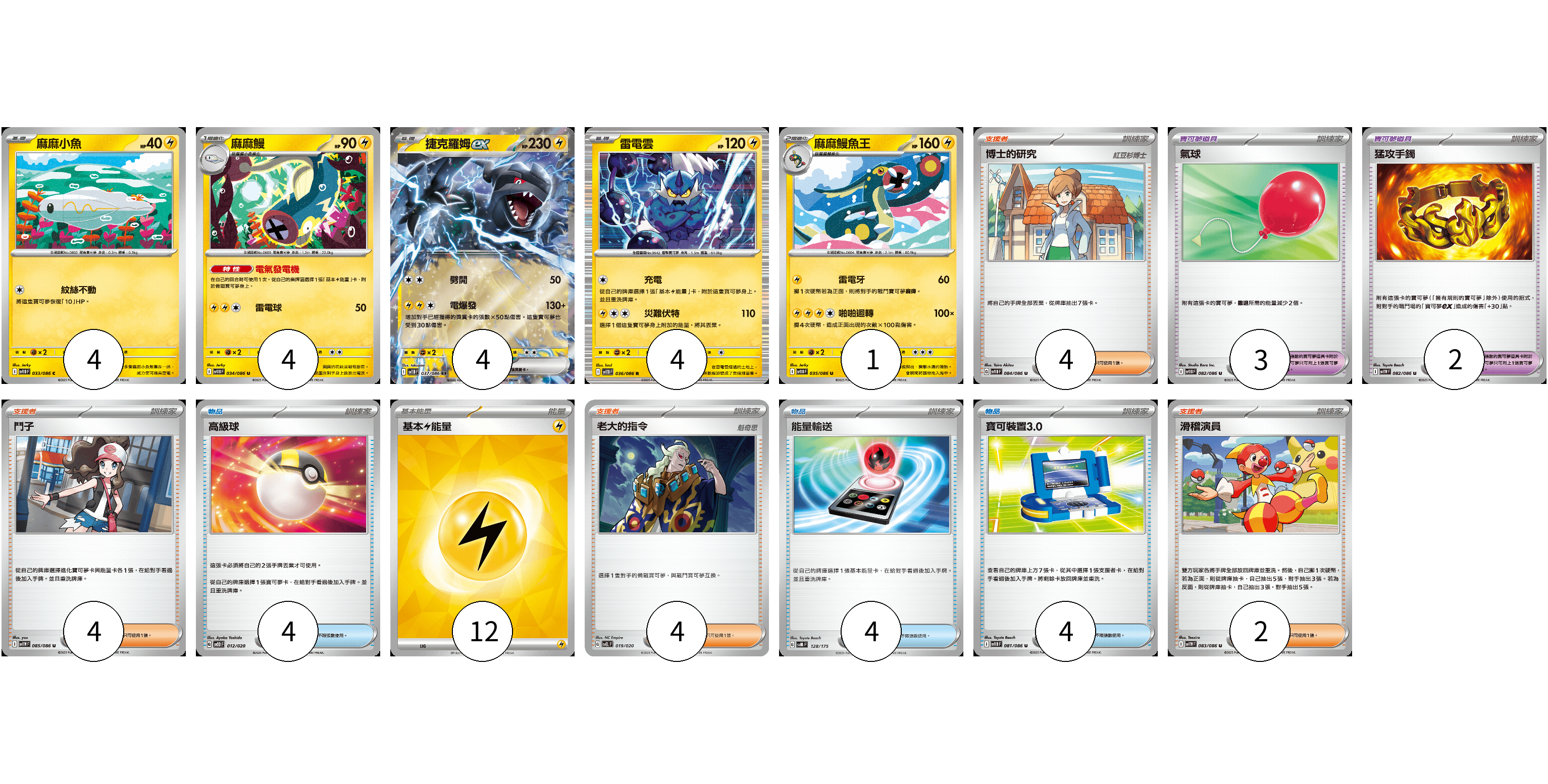 牌組構築方案 以此牌組為基礎新構築牌組 顯示卡面 顯示列表 寶可夢卡(17) 4 4 4 4 1 寶可夢道具(5) 3 2 物品卡(12) 4 4 4 支援者卡(14) 4 4 4 2 能量卡(12) 12 寶可夢卡(17) 卡牌名稱 張數 卡牌名稱 張數 麻麻小魚 SV11B 033/086 04 麻麻鰻 SV11B 034/086 04 捷克羅姆ex SV11B 037/086 04 雷電雲 SV11B 036/086 04 麻麻鰻魚王 SV11B 035/086 01 寶可夢道具(5) 卡牌名稱 張數 卡牌名稱 張數 氣球 SV11B 082/086 03 猛攻手鐲 SV11W 082/086 02 物品卡(12) 卡牌名稱 張數 卡牌名稱 張數 高級球 SVOD 012/020 04 能量輸送 SVM 128/175 04 寶可裝置3.0 SV11B 081/086 04 支援者卡(14) 卡牌名稱 張數 卡牌名稱 張數 博士的研究 SV11B 084/086 04 鬥子 SV11W 085/086 04 老大的指令 SVEL 019/020 04 滑稽演員 SV11W 083/086 02 能量卡(12) 卡牌名稱 張數 卡牌名稱 張數 基本【雷】能量 SVM LIG 12 以此牌組為基礎新構築牌組 牌組編碼 pwQsRT-joPiOa-qtwUOQ copy 列印牌組單 牌組編碼已複製 分享至SNS