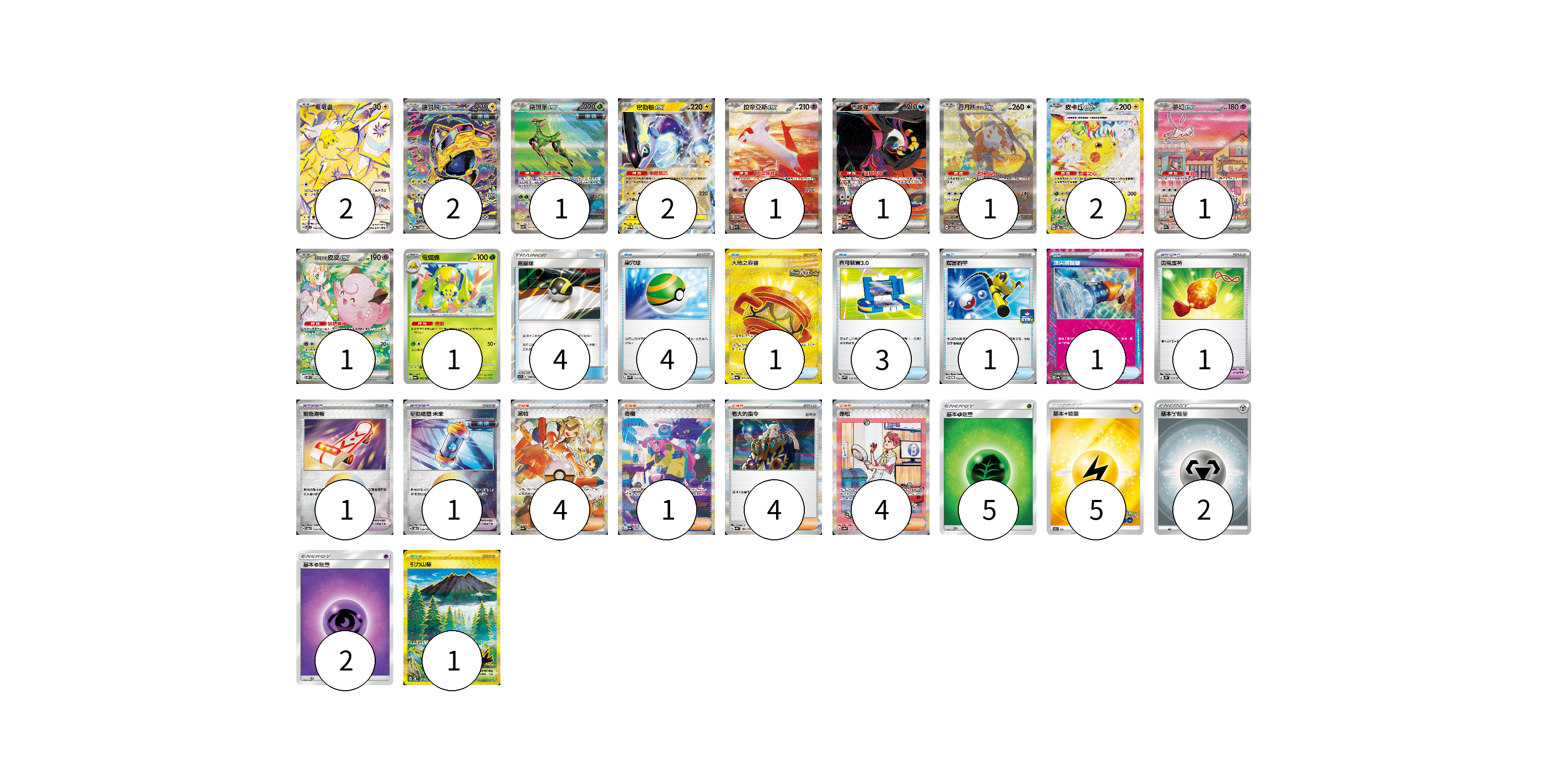 牌組構築方案 以此牌組為基礎新構築牌組 顯示卡面 顯示列表 寶可夢卡(15) 2 2 1 2 1 1 1 2 1 1 1 寶可夢道具(3) 1 1 1 物品卡(14) 4 4 1 3 1 1 支援者卡(13) 4 1 4 4 競技場卡(1) 1 能量卡(14) 5 5 2 2 寶可夢卡(15) 卡牌名稱 張數 卡牌名稱 張數 電電蟲 SV7 108/102 02 鐵臂膀ex SV8a 210/187 02 鐵斑葉ex SV5M 093/071 01 密勒頓ex SV-P 164/SV-P 02 拉帝亞斯ex SV7a 087/064 01 吉雉雞ex SV6a 089/064 01 月月熊 赫月 ex SV5a 091/066 01 皮卡丘ex SV8 132/106 02 夢幻ex SV2a 205/165 01 莉莉艾的皮皮ex SV9 126/100 01 電蜘蛛 SV6a 002/064 01 寶可夢道具(3) 卡牌名稱 張數 卡牌名稱 張數 勇氣護符 SV2D 067/071 01 緊急滑板 SV8a 153/187 01 驅勁能量 未來 SV8a 158/187 01 物品卡(14) 卡牌名稱 張數 卡牌名稱 張數 高級球 AS5b 178/186 04 巢穴球 SVAW 014/023 04 大地之容器 SV6a 093/064 01 寶可裝置3.0 SVAW 016/023 03 厲害釣竿 SV-P 112/SV-P 01 頂尖捕捉器 SV8a 148/187 01 支援者卡(13) 卡牌名稱 張數 卡牌名稱 張數 派帕 SV4a 353/190 04 奇樹 SV4a 350/190 01 老大的指令 SV4a 181/190 04 赤松 SV8a 227/187 04 競技場卡(1) 卡牌名稱 張數 卡牌名稱 張數 引力山岳 SV8 138/106 01 能量卡(14) 卡牌名稱 張數 卡牌名稱 張數 基本草能量 AS6D GRA 05 基本雷能量 S10b LIG 05 基本【鋼】能量 SI MET 02 基本超能量 AS6D PSY 02 以此牌組為基礎新構築牌組 牌組編碼 pxXQuY-pStDFJ-FxlHTb copy 列印牌組單 牌組編碼已複製 分享至SNS