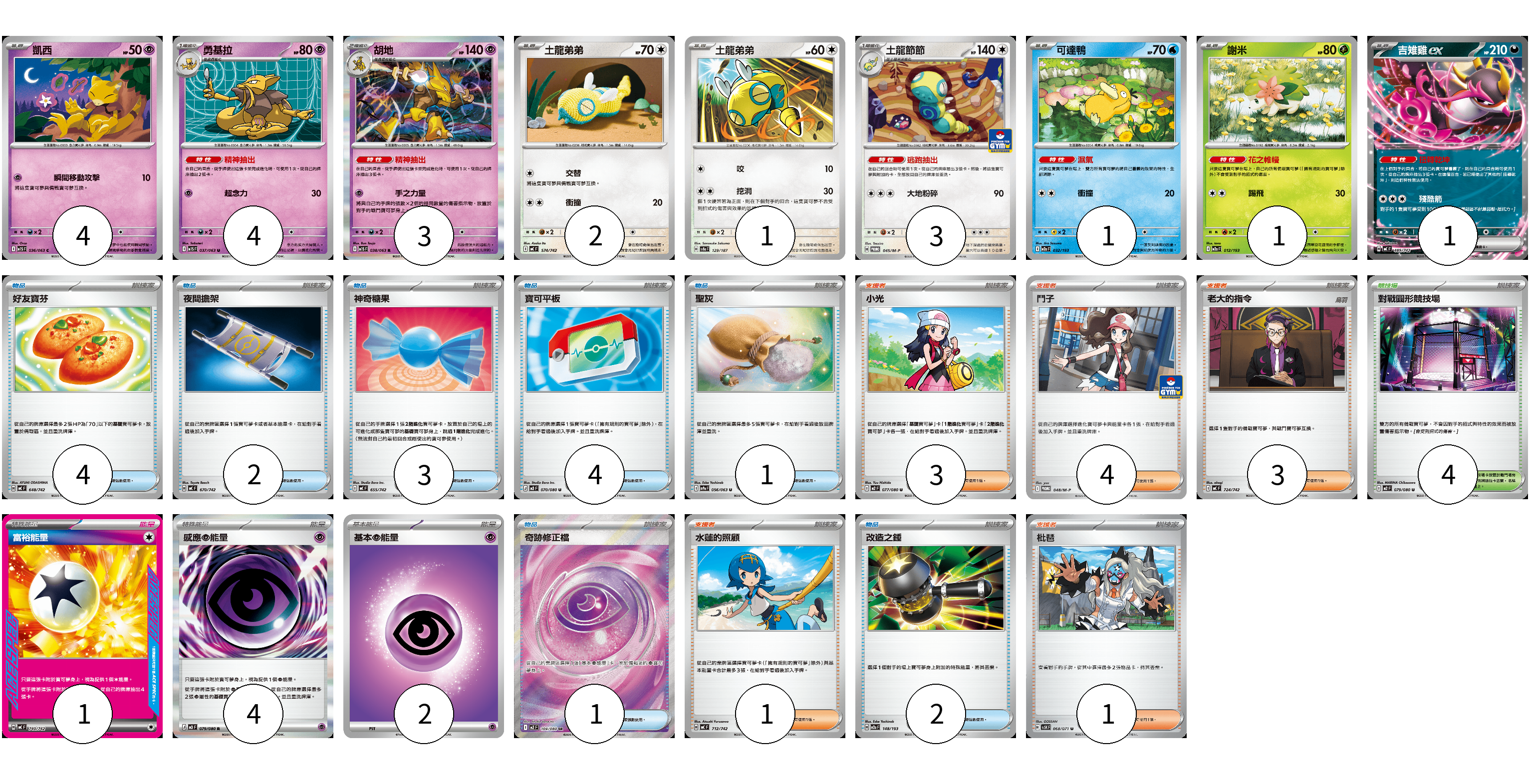 牌組構築方案 以此牌組為基礎新構築牌組 顯示卡面 顯示列表 寶可夢卡(20) 4 4 3 2 1 3 1 1 1 物品卡(17) 4 2 3 4 1 1 2 支援者卡(12) 3 4 3 1 1 競技場卡(4) 4 能量卡(7) 1 4 2 寶可夢卡(20) 卡牌名稱 張數 卡牌名稱 張數 凱西 M1S 036/063 04 勇基拉 M1S 037/063 04 胡地 M1S 038/063 03 土龍弟弟 MC 574/742 02 土龍弟弟 SV8a 129/187 01 土龍節節 M-P 045/M-P 03 可達鴨 M2a 032/193 01 謝米 M2a 012/193 01 吉雉雞ex MC 489/742 01 物品卡(17) 卡牌名稱 張數 卡牌名稱 張數 好友寶芬 MC 648/742 04 夜間擔架 MC 670/742 02 神奇糖果 MC 655/742 03 寶可平板 M3 070/080 04 聖灰 SV9a 056/063 01 奇跡修正檔 M3 104/080 01 改造之錘 M2a 148/193 02 支援者卡(12) 卡牌名稱 張數 卡牌名稱 張數 小光 M2 077/080 03 鬥子 M-P 048/M-P 04 老大的指令 MC 724/742 03 水蓮的照顧 MC 712/742 01 枇琶 SV5K 068/071 01 競技場卡(4) 卡牌名稱 張數 卡牌名稱 張數 對戰圓形競技場 M2 079/080 04 能量卡(7) 卡牌名稱 張數 卡牌名稱 張數 富裕能量 MC 740/742 01 感應【超】能量 M3 079/080 04 基本【超】能量 M-P PSY 02 以此牌組為基礎新構築牌組 牌組編碼 pxbJUI-vSWrXT-lZniqx copy 列印牌組單 牌組編碼已複製 分享至SNS