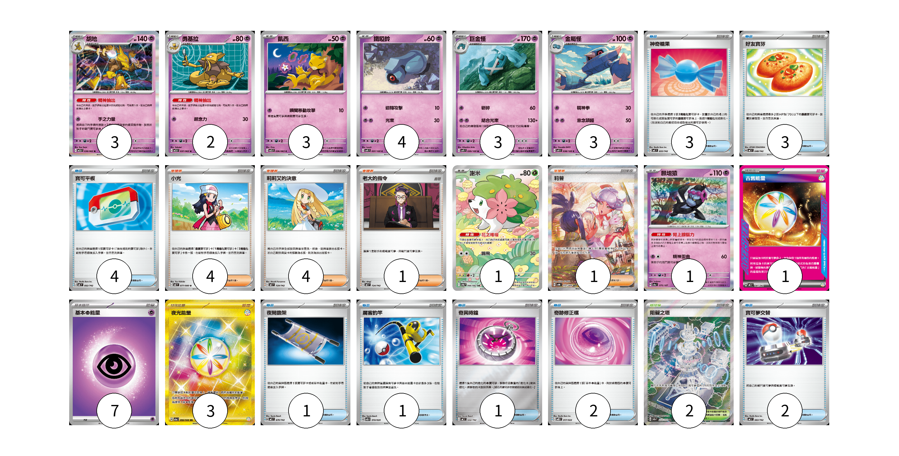 牌組構築方案 以此牌組為基礎新構築牌組 顯示卡面 顯示列表 寶可夢卡(20) 3 2 3 4 3 3 1 1 物品卡(17) 3 3 4 1 1 1 2 2 支援者卡(10) 4 4 1 1 競技場卡(2) 2 能量卡(11) 1 7 3 寶可夢卡(20) 卡牌名稱 張數 卡牌名稱 張數 胡地 M1S 038/063 03 勇基拉 M1S 037/063 02 凱西 M1S 036/063 03 鐵啞鈴 SV9 037/100 04 巨金怪 SV9 039/100 03 金屬怪 SV9 038/100 03 謝米 SV9a 066/063 01 願增猿 SV8a 075/187 01 物品卡(17) 卡牌名稱 張數 卡牌名稱 張數 神奇糖果 MC 655/742 03 好友寶芬 MC 648/742 03 寶可平板 MC 662/742 04 夜間擔架 MC 670/742 01 厲害釣竿 SVOD 010/020 01 奇異時鐘 MC 632/742 01 奇跡修正檔 MBD 017/022 02 寶可夢交替 MC 663/742 02 支援者卡(10) 卡牌名稱 張數 卡牌名稱 張數 小光 M2 077/080 04 莉莉艾的決意 MC 729/742 04 老大的指令 MC 724/742 01 莉普 SV4M 092/066 01 競技場卡(2) 卡牌名稱 張數 卡牌名稱 張數 阻礙之塔 M2a 222/193 02 能量卡(11) 卡牌名稱 張數 卡牌名稱 張數 古舊能量 MC 741/742 01 基本【超】能量 MC PSY 07 夜光能量 SV5a 096/066 03 以此牌組為基礎新構築牌組 牌組編碼 pzPRre-EHurYG-KTChNF copy 列印牌組單 牌組編碼已複製 分享至SNS