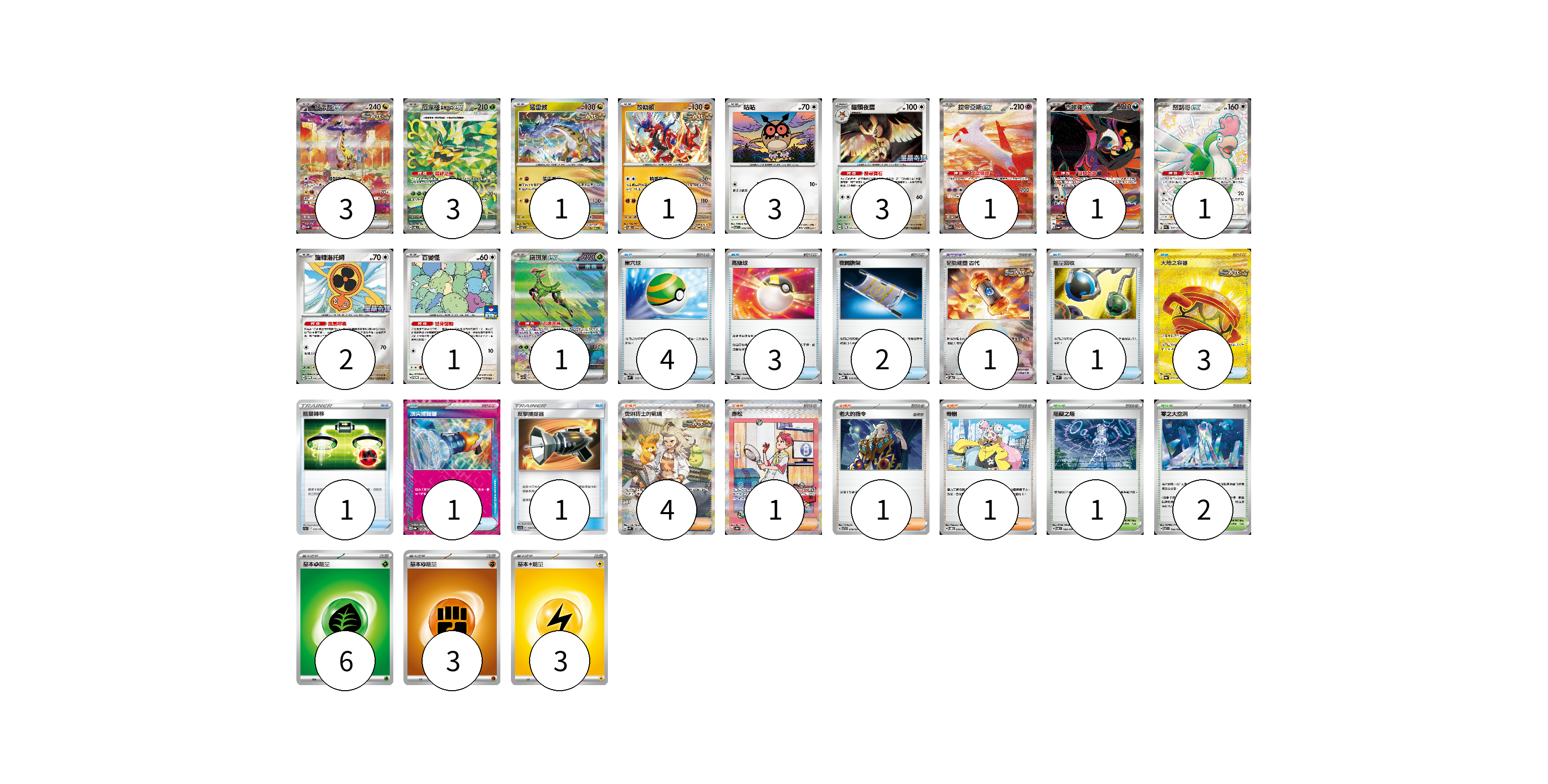 牌組構築方案 以此牌組為基礎新構築牌組 顯示卡面 顯示列表 寶可夢卡(21) 3 3 1 1 3 3 1 1 1 2 1 1 寶可夢道具(1) 1 物品卡(16) 4 3 2 1 3 1 1 1 支援者卡(7) 4 1 1 1 競技場卡(3) 1 2 能量卡(12) 6 3 3 寶可夢卡(21) 卡牌名稱 張數 卡牌名稱 張數 猛雷鼓ex SV5K 095/071 03 厄鬼椪 碧草面具ex SV6 125/101 03 猛雷鼓 SV7 075/102 01 故勒頓 SV8 069/106 01 咕咕 SV7 076/102 03 貓頭夜鷹 SV-P 145/SV-P 03 拉帝亞斯ex SV7a 087/064 01 吉雉雞ex SV6a 089/064 01 怒鸚哥ex SV4a 337/190 01 旋轉洛托姆 SV-P 146/SV-P 02 百變怪 SV-P 111/SV-P 01 鐵斑葉ex SV5M 093/071 01 寶可夢道具(1) 卡牌名稱 張數 卡牌名稱 張數 驅勁能量 古代 SV8a 157/187 01 物品卡(16) 卡牌名稱 張數 卡牌名稱 張數 巢穴球 SVM 133/175 04 高級球 MBD 014/022 03 夜間擔架 MBD 016/022 02 能量回收 SVM 125/175 01 大地之容器 SV6a 093/064 03 能量轉移 S11a 059/068 01 頂尖捕捉器 SV8a 148/187 01 反擊捕捉器 AC1a 130/158 01 支援者卡(7) 卡牌名稱 張數 卡牌名稱 張數 奧琳博士的氣魄 SV4K 091/066 04 赤松 SV8a 227/187 01 老大的指令 SVTR 019/021 01 奇樹 SVOD 016/020 01 競技場卡(3) 卡牌名稱 張數 卡牌名稱 張數 阻礙之塔 SV6 100/101 01 零之大空洞 SV7 102/102 02 能量卡(12) 卡牌名稱 張數 卡牌名稱 張數 基本【草】能量 SVTM GRA 06 基本【鬥】能量 SVTG FIG 03 基本【雷】能量 SVTR LIG 03 以此牌組為基礎新構築牌組 牌組編碼 qAnDVC-DsDgja-fWVSxQ copy 列印牌組單 牌組編碼已複製 分享至SNS