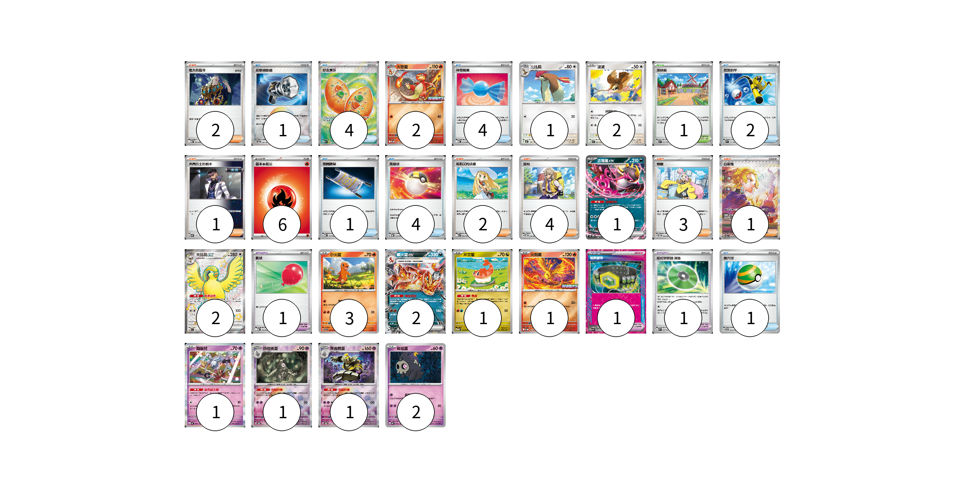 牌組構築方案 以此牌組為基礎新構築牌組 顯示卡面 顯示列表 寶可夢卡(20) 2 1 2 1 2 3 2 1 1 1 1 1 2 寶可夢道具(3) 1 1 1 物品卡(17) 1 4 4 2 1 4 1 支援者卡(13) 2 1 2 4 3 1 競技場卡(1) 1 能量卡(6) 6 寶可夢卡(20) 卡牌名稱 張數 卡牌名稱 張數 火恐龍 M-P 021/M-P 02 比比鳥 SV4a 138/190 01 波波 SVK 003/042 02 吉雉雞ex SVOM 009/021 01 大比鳥ex SV4a 335/190 02 小火龍 SVTL 001/021 03 噴火龍ex SVTL 006/021 02 米立龍 MBG 010/022 01 火焰鳥 M-P 022/M-P 01 鑰圈兒 SV4a 087/190 01 彷徨夜靈 SV8a 065/187 01 黑夜魔靈 SV8a 066/187 01 夜巡靈 SV8a 064/187 02 寶可夢道具(3) 卡牌名稱 張數 卡牌名稱 張數 氣球 MBG 019/022 01 極限腰帶 SV5K 066/071 01 招式學習器 演進 SVK 025/042 01 物品卡(17) 卡牌名稱 張數 卡牌名稱 張數 反擊捕捉器 SV8a 139/187 01 好友寶芬 M1S 081/063 04 神奇糖果 MBG 013/022 04 厲害釣竿 SVK 011/042 02 夜間擔架 MBG 017/022 01 高級球 SVQL 015/022 04 巢穴球 SVTG 012/019 01 支援者卡(13) 卡牌名稱 張數 卡牌名稱 張數 老大的指令 MBG 021/022 02 弗圖博士的劇本 SV8a 175/187 01 莉莉艾的決意 M1L 062/063 02 派帕 SVOD 018/020 04 奇樹 SVOM 018/021 03 白蕾雅 SV7 132/102 01 競技場卡(1) 卡牌名稱 張數 卡牌名稱 張數 深缽鎮 SVK 039/042 01 能量卡(6) 卡牌名稱 張數 卡牌名稱 張數 基本【火】能量 M-P FIR 06 以此牌組為基礎新構築牌組 牌組編碼 qBnrRX-IFHOXF-EdujOa copy 列印牌組單 牌組編碼已複製 分享至SNS