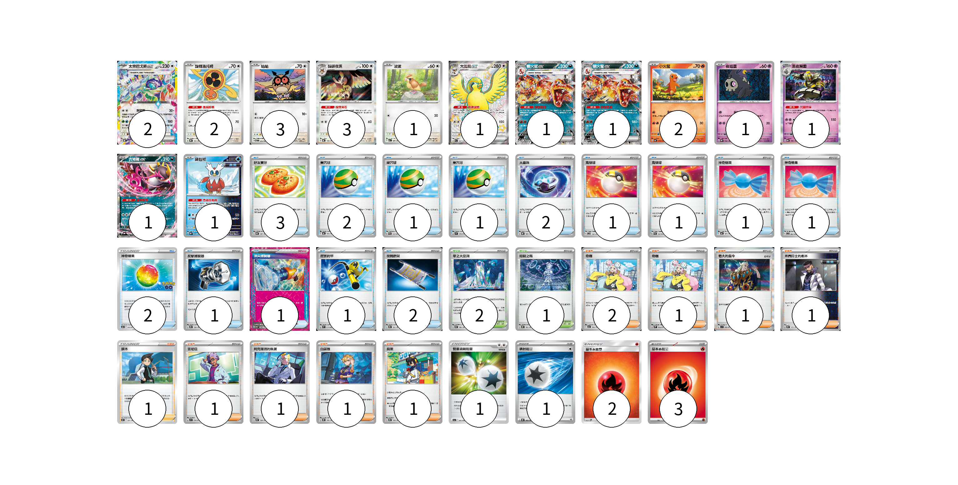 牌組構築方案 以此牌組為基礎新構築牌組 顯示卡面 顯示列表 寶可夢卡(20) 2 2 3 3 1 1 1 1 2 1 1 1 1 物品卡(20) 3 2 1 1 2 1 1 1 1 2 1 1 1 2 支援者卡(10) 2 1 1 1 1 1 1 1 1 競技場卡(3) 2 1 能量卡(7) 1 1 2 3 寶可夢卡(20) 卡牌名稱 張數 卡牌名稱 張數 太樂巴戈斯ex SV8a 136/187 02 旋轉洛托姆 SV8a 131/187 02 咕咕 SV7 076/102 03 貓頭夜鷹 SV8a 128/187 03 波波 SV3 087/108 01 大比鳥ex SV4a 335/190 01 噴火龍ex SV-P 166/SV-P 01 噴火龍ex SV4a 115/190 01 小火龍 SV4a 025/190 02 夜巡靈 SV8a 064/187 01 黑夜魔靈 SV8a 066/187 01 吉雉雞ex SV8a 104/187 01 鐵包袱 SV8a 047/187 01 物品卡(20) 卡牌名稱 張數 卡牌名稱 張數 好友寶芬 SV8a 147/187 03 巢穴球 SV4a 159/190 02 巢穴球 SVAM 015/023 01 巢穴球 SV1S 070/078 01 太晶珠 SV8a 145/187 02 高級球 SVD 119/139 01 高級球 SVAM 016/023 01 神奇糖果 SV4a 163/190 01 神奇糖果 SVB 003/028 01 神奇糖果 S10b 066/071 02 反擊捕捉器 SV8a 139/187 01 頂尖捕捉器 SV8a 148/187 01 厲害釣竿 SVK 011/042 01 夜間擔架 SV8a 151/187 02 支援者卡(10) 卡牌名稱 張數 卡牌名稱 張數 奇樹 SV4a 174/190 02 奇樹 SV2D 069/071 01 老大的指令 SV1a 069/073 01 弗圖博士的劇本 SV8a 175/187 01 捩木 S11 097/100 01 吉尼亞 SV1S 074/078 01 阿克羅瑪的執著 SV8a 164/187 01 白蕾雅 SV8a 176/187 01 烏栗 SV8a 169/187 01 競技場卡(3) 卡牌名稱 張數 卡牌名稱 張數 零之大空洞 SV8a 182/187 02 阻礙之塔 SV8a 181/187 01 能量卡(7) 卡牌名稱 張數 卡牌名稱 張數 雙重渦輪能量 S11a 067/068 01 噴射能量 SV8a 185/187 01 基本火能量 AS6D FIR 02 基本火能量 sv-p FIR 03 以此牌組為基礎新構築牌組 牌組編碼 qCCazS-LKyTcZ-LXSMjF copy 列印牌組單 牌組編碼已複製 分享至SNS