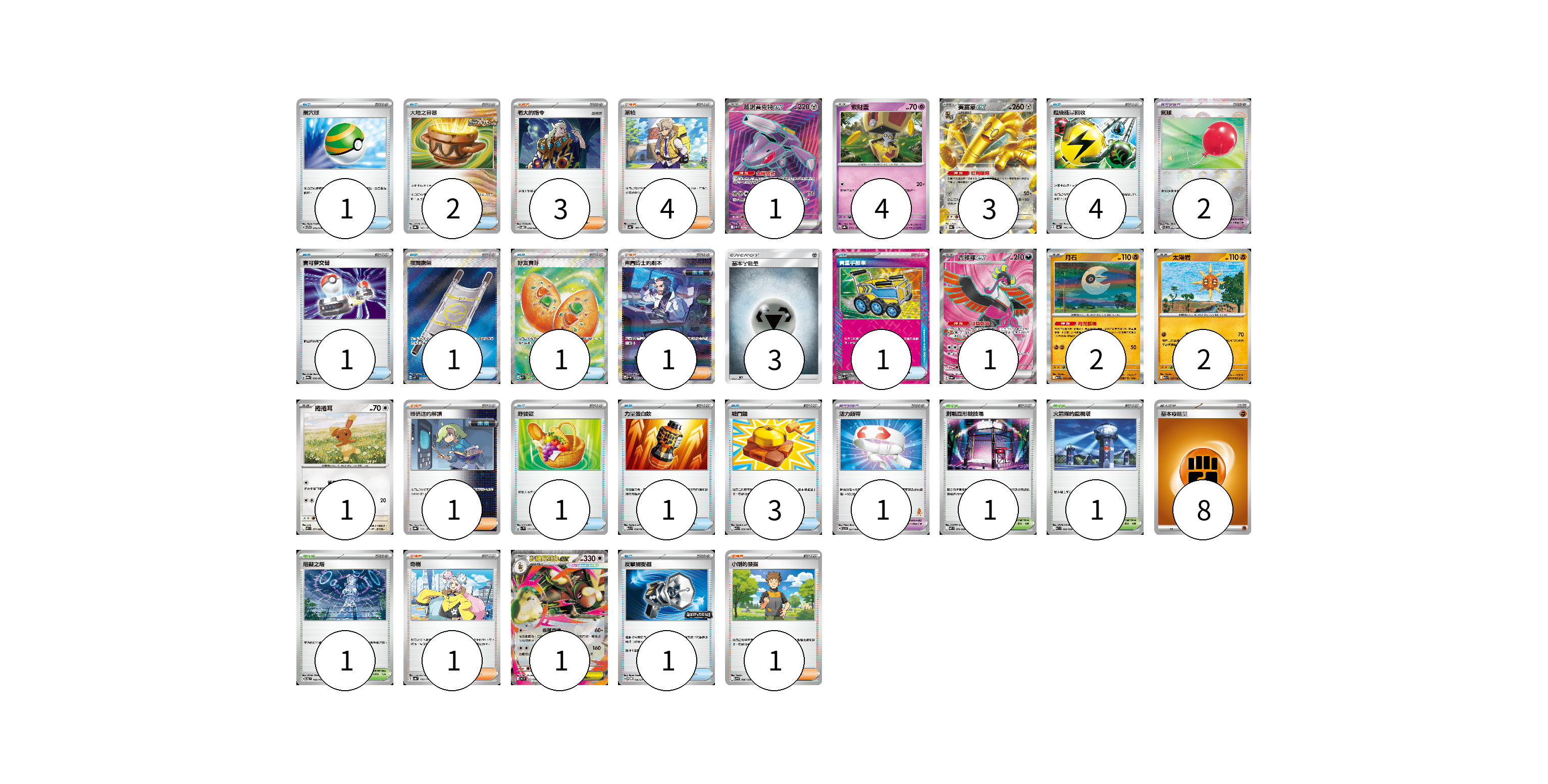 牌組構築方案 以此牌組為基礎新構築牌組 顯示卡面 顯示列表 寶可夢卡(15) 1 4 3 1 2 2 1 1 寶可夢道具(3) 2 1 物品卡(17) 1 2 4 1 1 1 1 1 1 3 1 支援者卡(11) 3 4 1 1 1 1 競技場卡(3) 1 1 1 能量卡(11) 3 8 寶可夢卡(15) 卡牌名稱 張數 卡牌名稱 張數 蓋諾賽克特ex SV11B 164/086 01 索財靈 SV8a 073/187 04 賽富豪ex SV8a 117/187 03 吉雉雞ex SV6a 081/064 01 月石 M1L 026/063 02 太陽岩 M1L 027/063 02 捲捲耳 M2 071/080 01 超級長耳兔ex M2 072/080 01 寶可夢道具(3) 卡牌名稱 張數 卡牌名稱 張數 氣球 SV11B 082/086 02 活力頭帶 SVI 057/066 01 物品卡(17) 卡牌名稱 張數 卡牌名稱 張數 巢穴球 SVTG 012/019 01 大地之容器 SV8a 143/187 02 超級能量回收 SV4a 157/190 04 寶可夢交替 SV9a 058/063 01 夜間擔架 M1L 083/063 01 好友寶芬 M1S 081/063 01 貴重手推車 SVK 020/042 01 野餐籃 SV1V 071/078 01 力量蛋白飲 M1L 058/063 01 戰鬥鑼 M1L 059/063 03 反擊捕捉器 SV-P 136/SV-P 01 支援者卡(11) 卡牌名稱 張數 卡牌名稱 張數 老大的指令 SVOD 019/020 03 派帕 SV4a 180/190 04 弗圖博士的劇本 SV4M 091/066 01 暗碼迷的解讀 SV8a 165/187 01 奇樹 SV4a 174/190 01 小剛的發掘 SV9 096/100 01 競技場卡(3) 卡牌名稱 張數 卡牌名稱 張數 對戰圓形競技場 M2 079/080 01 火箭隊的監視塔 SV10 096/098 01 阻礙之塔 SV6 100/101 01 能量卡(11) 卡牌名稱 張數 卡牌名稱 張數 基本鋼能量 AS6D MET 03 基本【鬥】能量 SVTG FIG 08 以此牌組為基礎新構築牌組 牌組編碼 qCoNcD-pgoOYg-SCnBgy copy 列印牌組單 牌組編碼已複製 分享至SNS
