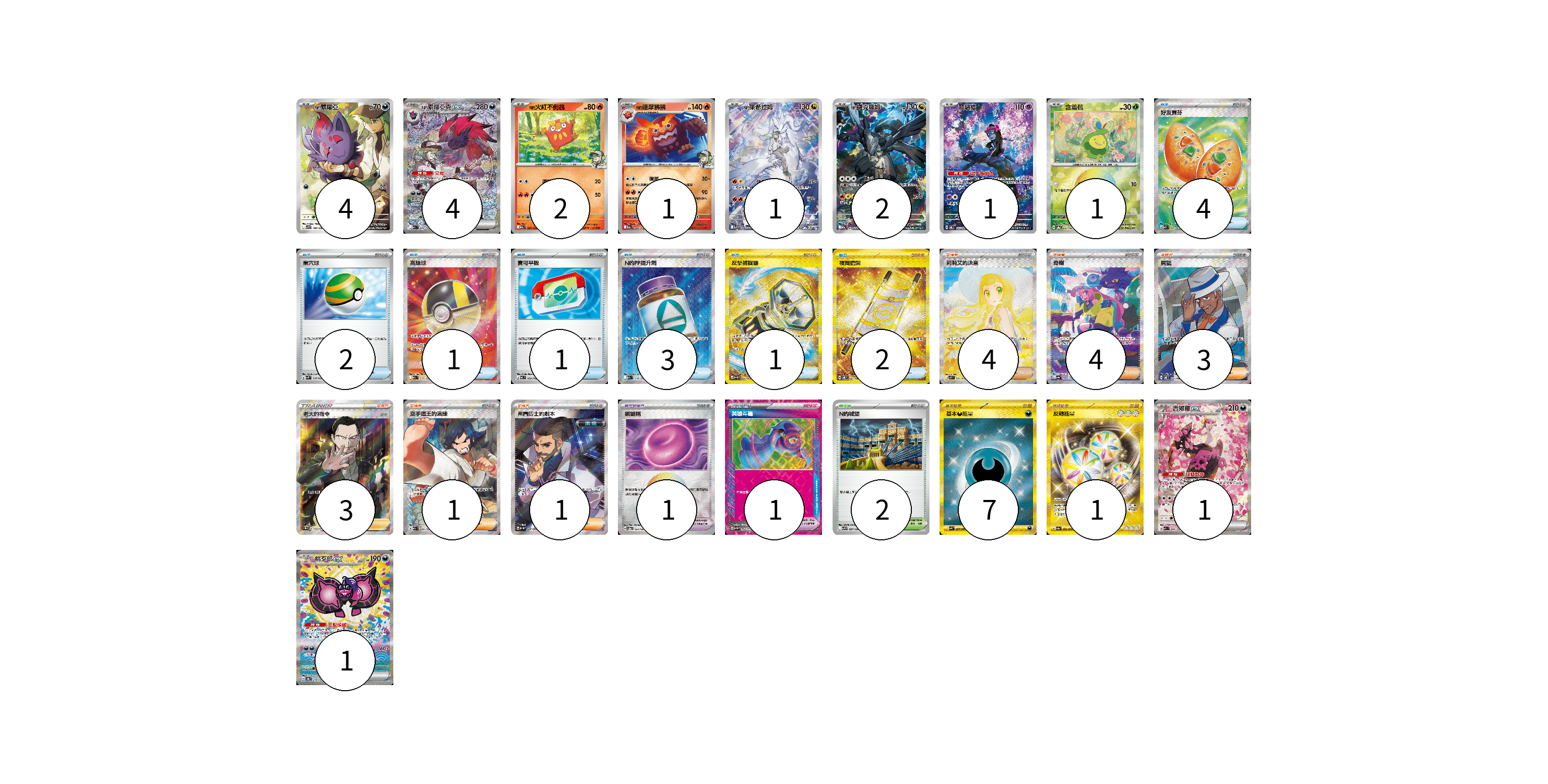 牌組構築方案 以此牌組為基礎新構築牌組 顯示卡面 顯示列表 寶可夢卡(18) 4 4 2 1 1 2 1 1 1 1 寶可夢道具(2) 1 1 物品卡(14) 4 2 1 1 3 1 2 支援者卡(16) 4 4 3 3 1 1 競技場卡(2) 2 能量卡(8) 7 1 寶可夢卡(18) 卡牌名稱 張數 卡牌名稱 張數 N的索羅亞 SV9 108/100 04 N的索羅亞克ex M2a 242/193 04 N的火紅不倒翁 M2a 027/193 02 N的達摩狒狒 M2a 028/193 01 N的萊希拉姆 SV9 109/100 01 N的捷克羅姆 M2a 210/193 02 願增猿 SV6 107/101 01 含羞苞 SV8a 001/187 01 吉雉雞ex M2a 244/193 01 桃歹郎ex SV8a 219/187 01 寶可夢道具(2) 卡牌名稱 張數 卡牌名稱 張數 鎖鏈糬 SV8a 154/187 01 英雄斗篷 SV5M 064/071 01 物品卡(14) 卡牌名稱 張數 卡牌名稱 張數 好友寶芬 M1S 081/063 04 巢穴球 SVK 016/042 02 高級球 M2a 216/193 01 寶可平板 MC 662/742 01 N的PP提升劑 M2a 214/193 03 反擊捕捉器 SV4M 094/066 01 夜間擔架 SV8 137/106 02 支援者卡(16) 卡牌名稱 張數 卡牌名稱 張數 莉莉艾的決意 M1L 091/063 04 奇樹 SV4a 350/190 04 席藍 SV8 127/106 03 老大的指令(坂木) SC1b 170/153 03 空手道王的演練 M2a 220/193 01 弗圖博士的劇本 SV4M 086/066 01 競技場卡(2) 卡牌名稱 張數 卡牌名稱 張數 N的城堡 SV9 097/100 02 能量卡(8) 卡牌名稱 張數 卡牌名稱 張數 基礎【惡】能量 SV4K 095/066 07 反轉能量 SV3a 092/062 01 以此牌組為基礎新構築牌組 牌組編碼 qDixqA-bZQfLL-NulinM copy 列印牌組單 牌組編碼已複製 分享至SNS
