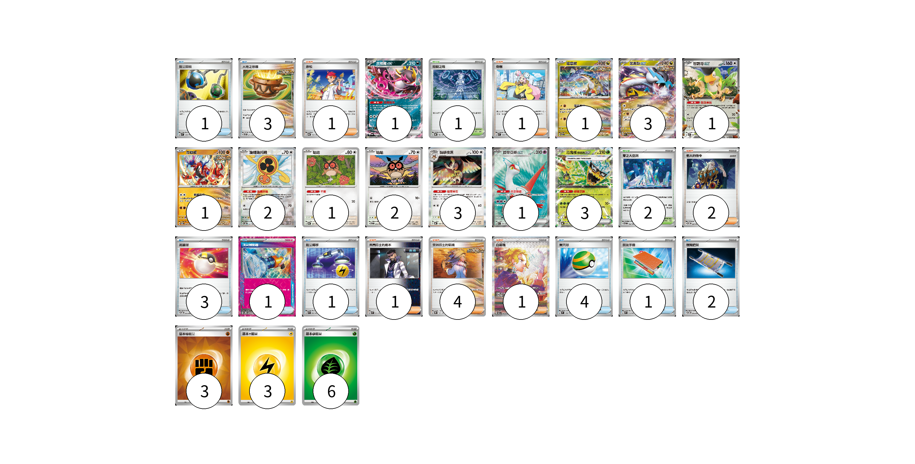 牌組構築方案 以此牌組為基礎新構築牌組 顯示卡面 顯示列表 寶可夢卡(19) 1 1 3 1 1 2 1 2 3 1 3 物品卡(16) 1 3 3 1 1 4 1 2 支援者卡(10) 1 1 2 1 4 1 競技場卡(3) 1 2 能量卡(12) 3 3 6 寶可夢卡(19) 卡牌名稱 張數 卡牌名稱 張數 吉雉雞ex SV6a 038/064 01 猛雷鼓 SV7 075/102 01 猛雷鼓ex SV5K 053/071 03 怒鸚哥ex SVK 006/042 01 故勒頓 SV8 069/106 01 旋轉洛托姆 SV8a 131/187 02 咕咕 SV8a 127/187 01 咕咕 SV7 076/102 02 貓頭夜鷹 SV8a 128/187 03 拉帝亞斯ex SV7a 078/064 01 厄鬼椪 碧草面具ex SV8a 020/187 03 物品卡(16) 卡牌名稱 張數 卡牌名稱 張數 能量回收 SVM 125/175 01 大地之容器 SVTS 011/022 03 高級球 SVOD 012/020 03 頂尖捕捉器 SV5M 062/071 01 能量轉移 SVK 008/042 01 巢穴球 SVM 133/175 04 朋友手冊 SVK 014/042 01 夜間擔架 SVOM 016/021 02 支援者卡(10) 卡牌名稱 張數 卡牌名稱 張數 赤松 SV8a 163/187 01 奇樹 SVM 160/175 01 老大的指令 SVOM 020/021 02 弗圖博士的劇本 SVK 034/042 01 奧琳博士的氣魄 SV8a 167/187 04 白蕾雅 SV7 132/102 01 競技場卡(3) 卡牌名稱 張數 卡牌名稱 張數 阻礙之塔 SV8a 181/187 01 零之大空洞 SV7 102/102 02 能量卡(12) 卡牌名稱 張數 卡牌名稱 張數 基本【鬥】能量 SVK FIG 03 基本【雷】能量 SVF LIG 03 基本【草】能量 SVF GRA 06 以此牌組為基礎新構築牌組 牌組編碼 qEOHtI-immVfR-hKEpyu copy 列印牌組單 牌組編碼已複製 分享至SNS