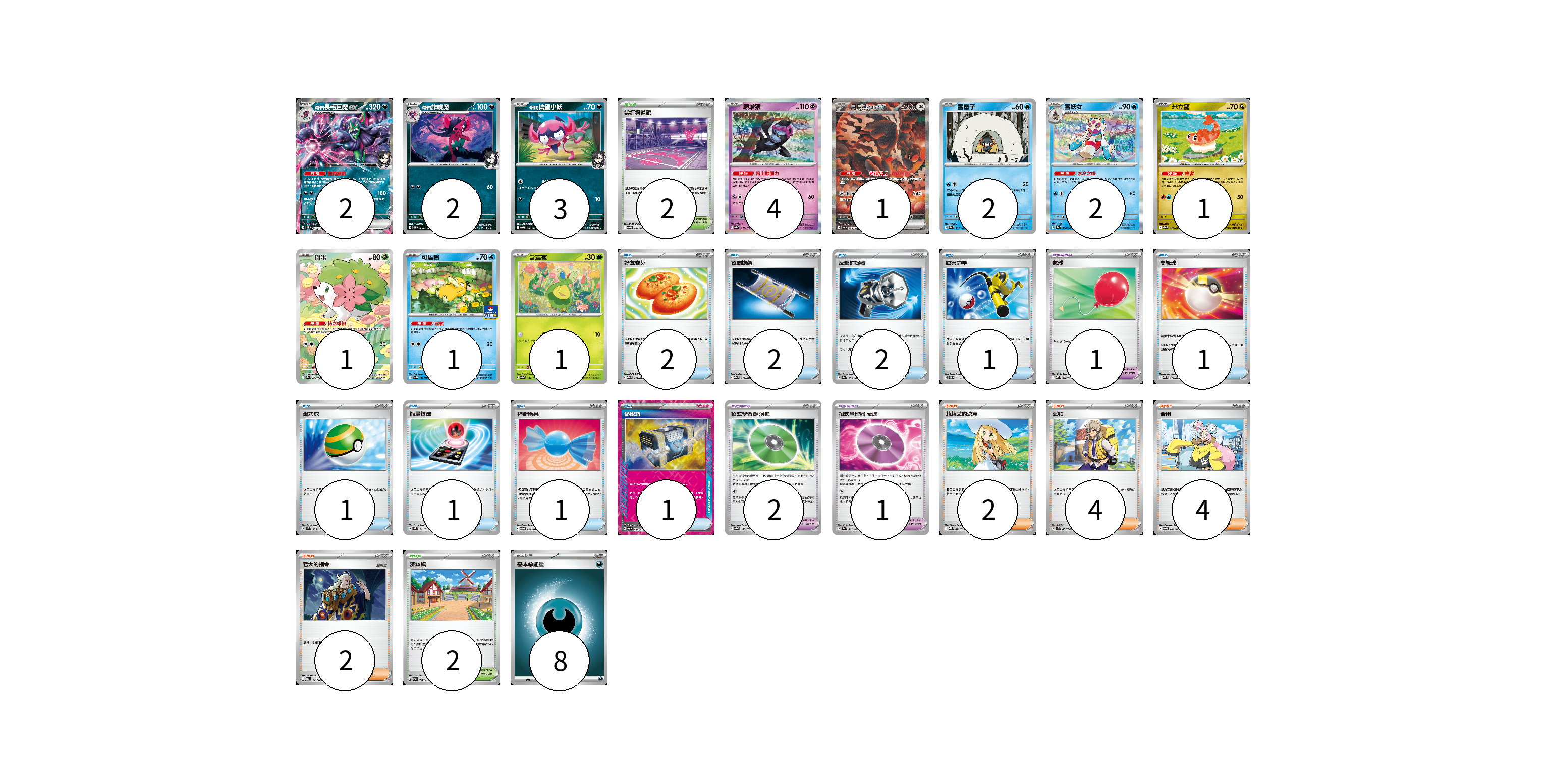 牌組構築方案 以此牌組為基礎新構築牌組 顯示卡面 顯示列表 寶可夢卡(20) 2 2 3 4 1 2 2 1 1 1 1 寶可夢道具(4) 1 2 1 物品卡(12) 2 2 2 1 1 1 1 1 1 支援者卡(12) 2 4 4 2 競技場卡(4) 2 2 能量卡(8) 8 寶可夢卡(20) 卡牌名稱 張數 卡牌名稱 張數 <瑪俐的>長毛巨魔ex SVOM 007/021 02 <瑪俐的>詐唬魔 SVOM 006/021 02 <瑪俐的>搗蛋小妖 SVOM 005/021 03 願增猿 SV8a 075/187 04 月月熊 赫月ex SV8a 225/187 01 雪童子 SV8a 037/187 02 雪妖女 SV8a 038/187 02 米立龍 MBG 010/022 01 謝米 SV9a 066/063 01 可達鴨 SV-P 220/SV-P 01 含羞苞 SV8a 001/187 01 寶可夢道具(4) 卡牌名稱 張數 卡牌名稱 張數 氣球 MBD 018/022 01 招式學習器 演進 SV8a 160/187 02 招式學習器 衰退 SV8a 161/187 01 物品卡(12) 卡牌名稱 張數 卡牌名稱 張數 好友寶芬 MBG 011/022 02 夜間擔架 MBG 017/022 02 反擊捕捉器 SV8a 139/187 02 厲害釣竿 SVOM 011/021 01 高級球 MBD 014/022 01 巢穴球 SVM 133/175 01 能量輸送 SVAL 011/021 01 神奇糖果 SVOD 013/020 01 秘密箱 SV6 092/101 01 支援者卡(12) 卡牌名稱 張數 卡牌名稱 張數 莉莉艾的決意 MBG 022/022 02 派帕 SVK 035/042 04 奇樹 SVOM 018/021 04 老大的指令 MBG 021/022 02 競技場卡(4) 卡牌名稱 張數 卡牌名稱 張數 尖釘鎮道館 SVOM 021/021 02 深缽鎮 SVK 039/042 02 能量卡(8) 卡牌名稱 張數 卡牌名稱 張數 基本【惡】能量 MBG DAR 08 以此牌組為基礎新構築牌組 牌組編碼 qFjDJT-UWHbrY-mNKgfK copy 列印牌組單 牌組編碼已複製 分享至SNS