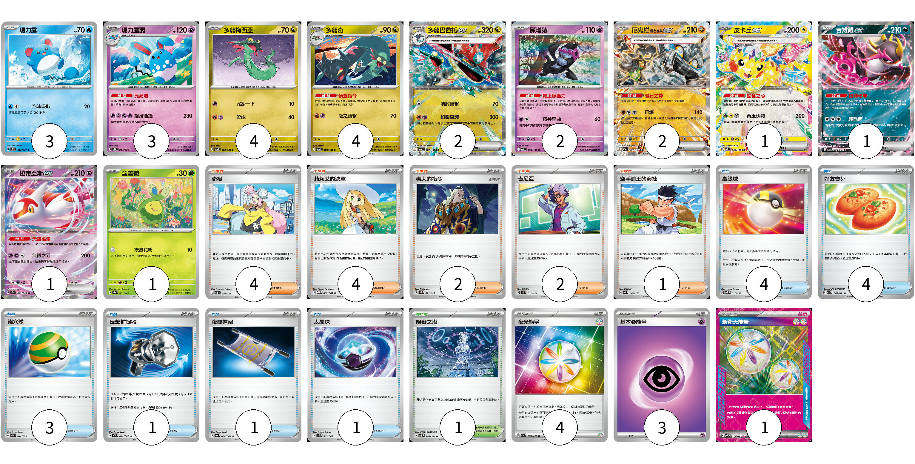 牌組構築方案 以此牌組為基礎新構築牌組 顯示卡面 顯示列表 寶可夢卡(24) 3 3 4 4 2 2 2 1 1 1 1 物品卡(14) 4 4 3 1 1 1 支援者卡(13) 4 4 2 2 1 競技場卡(1) 1 能量卡(8) 4 3 1 寶可夢卡(24) 卡牌名稱 張數 卡牌名稱 張數 瑪力露 SV2P 016/071 03 瑪力露麗 SVPN 004/008 03 多龍梅西亞 SV6 079/101 04 多龍奇 SV6 080/101 04 多龍巴魯托ex SV6 081/101 02 願增猿 SV6 055/101 02 厄鬼椪 礎石面具ex SV8a 091/187 02 皮卡丘ex SV8 033/106 01 吉雉雞ex SV6a 038/064 01 拉帝亞斯ex SV7a 019/064 01 含羞苞 SV8a 001/187 01 物品卡(14) 卡牌名稱 張數 卡牌名稱 張數 高級球 SVF 017/038 04 好友寶芬 SV5K 063/071 04 巢穴球 SVAW 014/023 03 反擊捕捉器 SV4M 059/066 01 夜間擔架 SV6a 056/064 01 太晶珠 SVK 013/042 01 支援者卡(13) 卡牌名稱 張數 卡牌名稱 張數 奇樹 SVTS 018/022 04 莉莉艾的決意 M1L 062/063 04 老大的指令 SVHM 022/022 02 吉尼亞 SVAL 017/021 02 空手道王的演練 SVM 144/175 01 競技場卡(1) 卡牌名稱 張數 卡牌名稱 張數 阻礙之塔 SV6 100/101 01 能量卡(8) 卡牌名稱 張數 卡牌名稱 張數 夜光能量 SV1a 073/073 04 基本超能量 sv-p PSY 03 新衝天能量 SV5K 071/071 01 以此牌組為基礎新構築牌組 牌組編碼 qGhFnr-CqaQek-rpTMMq copy 列印牌組單 牌組編碼已複製 分享至SNS