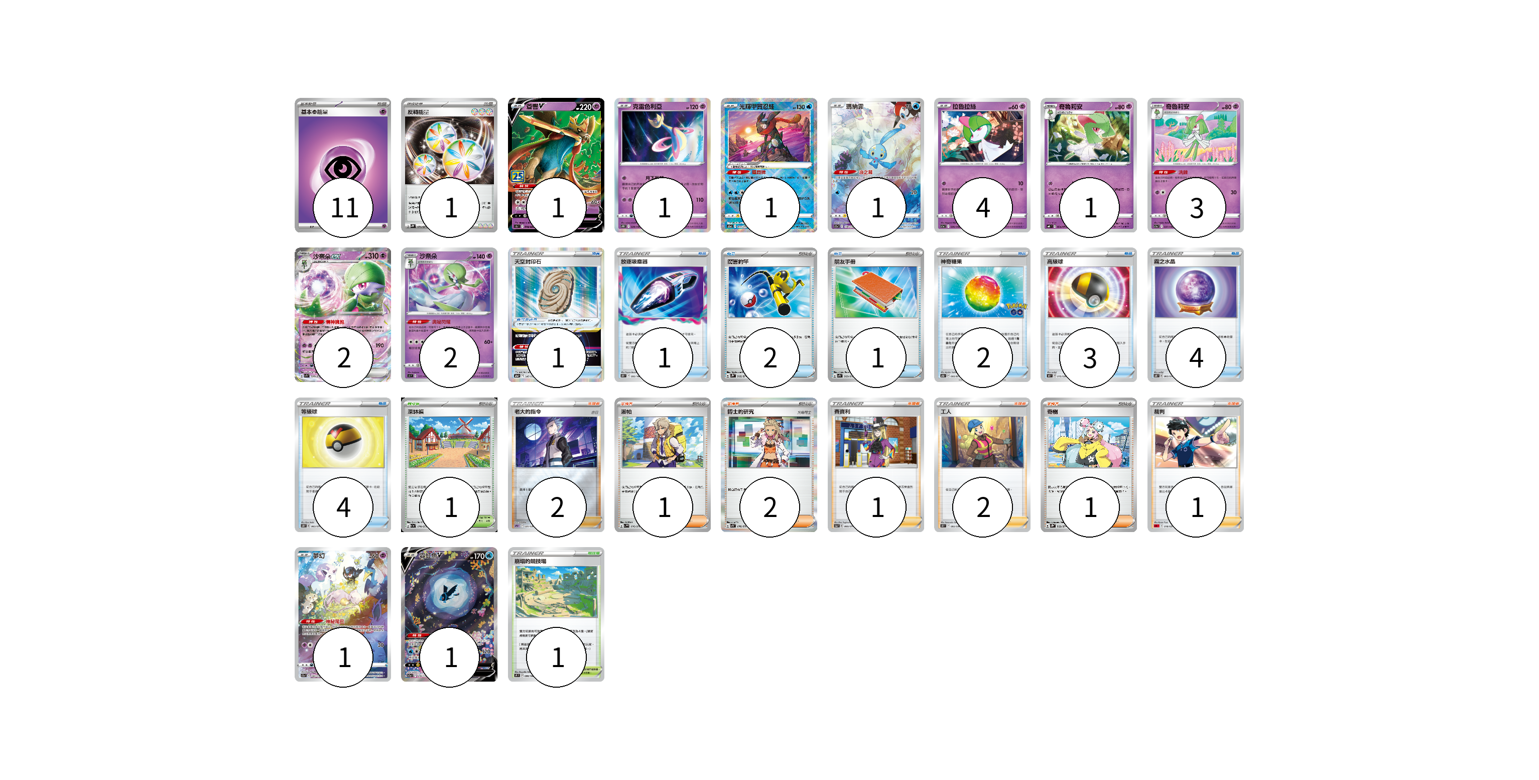 牌組構築方案 以此牌組為基礎新構築牌組 顯示卡面 顯示列表 寶可夢卡(18) 1 1 1 1 4 1 3 2 2 1 1 寶可夢道具(1) 1 物品卡(17) 1 2 1 2 3 4 4 支援者卡(10) 2 1 2 1 2 1 1 競技場卡(2) 1 1 能量卡(12) 11 1 寶可夢卡(18) 卡牌名稱 張數 卡牌名稱 張數 蒼響V S8a 018/028 01 克雷色利亞 S10D 028/067 01 光輝甲賀忍蛙 S12a 033/172 01 瑪納霏 S12a 178/172 01 拉魯拉絲 S11a 036/068 04 奇魯莉安 S6H 034/070 01 奇魯莉安 S11a 037/068 03 沙奈朵ex SV1S 028/078 02 沙奈朵 SI 177/414 02 夢幻 S12a 183/172 01 霓虹魚V S12a 216/172 01 寶可夢道具(1) 卡牌名稱 張數 卡牌名稱 張數 天空封印石 S12a 146/172 01 物品卡(17) 卡牌名稱 張數 卡牌名稱 張數 放逐吸塵器 S11 093/100 01 厲害釣竿 SV2P 066/071 02 朋友手冊 SV1S 069/078 01 神奇糖果 S10b 066/071 02 高級球 SK 015/030 03 霧之水晶 S6K 060/070 04 等級球 S5R 063/070 04 支援者卡(10) 卡牌名稱 張數 卡牌名稱 張數 老大的指令(赤日) SPD 020/020 02 派帕 SV1V 076/078 01 博士的研究(奧琳博士) SV1S 076/078 02 賽寶利 S5a 068/070 01 工人 S12 093/098 02 奇樹 SV2D 069/071 01 裁判 SDL 018/021 01 競技場卡(2) 卡牌名稱 張數 卡牌名稱 張數 深缽鎮 SV1a 070/073 01 崩塌的競技場 S9 098/100 01 能量卡(12) 卡牌名稱 張數 卡牌名稱 張數 基本【超】能量 SVB PSY 11 反轉能量 SV2P 071/071 01 以此牌組為基礎新構築牌組 牌組編碼 qGhNjY-APOAcF-kyZpIs copy 列印牌組單 牌組編碼已複製 分享至SNS