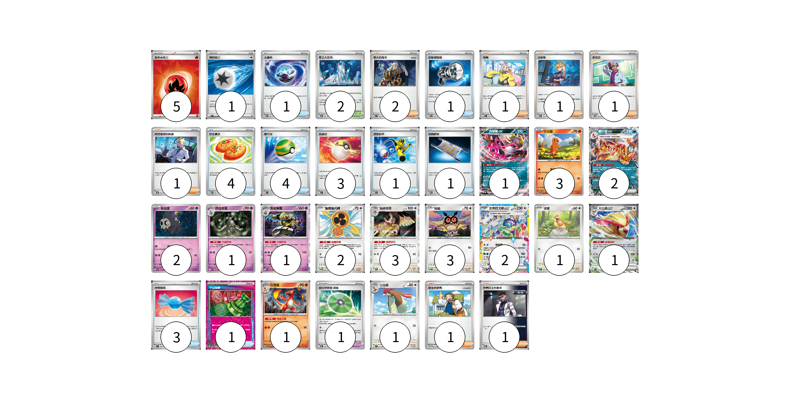 牌組構築方案 以此牌組為基礎新構築牌組 顯示卡面 顯示列表 寶可夢卡(24) 1 3 2 2 1 1 2 3 3 2 1 1 1 1 寶可夢道具(1) 1 物品卡(19) 1 1 4 4 3 1 1 3 1 支援者卡(8) 2 1 1 1 1 1 1 競技場卡(2) 2 能量卡(6) 5 1 寶可夢卡(24) 卡牌名稱 張數 卡牌名稱 張數 吉雉雞ex SV8a 104/187 01 小火龍 SVTL 001/021 03 噴火龍ex SVTL 006/021 02 夜巡靈 SV6a 018/064 02 彷徨夜靈 SV6a 019/064 01 黑夜魔靈 SV6a 020/064 01 旋轉洛托姆 SV7 080/102 02 貓頭夜鷹 SV8a 128/187 03 咕咕 SV7 076/102 03 太樂巴戈斯ex SV8a 136/187 02 波波 SV3 087/108 01 大比鳥ex SVK 005/042 01 火恐龍 SVTL 002/021 01 比比鳥 SVK 004/042 01 寶可夢道具(1) 卡牌名稱 張數 卡牌名稱 張數 招式學習器 演進 SV8a 160/187 01 物品卡(19) 卡牌名稱 張數 卡牌名稱 張數 太晶珠 SV8a 145/187 01 反擊捕捉器 SV8a 139/187 01 好友寶芬 SV8a 147/187 04 巢穴球 SVM 133/175 04 高級球 SVM 134/175 03 厲害釣竿 SVK 011/042 01 夜間擔架 SV8a 151/187 01 神奇糖果 SVM 135/175 03 不公印章 SV5a 053/066 01 支援者卡(8) 卡牌名稱 張數 卡牌名稱 張數 老大的指令 SVM 172/175 02 奇樹 SVM 160/175 01 白蕾雅 SV8a 176/187 01 吉尼亞 SVD 129/139 01 阿克羅瑪的執著 SV8a 164/187 01 博士的研究 SVOD 017/020 01 弗圖博士的劇本 SV8a 175/187 01 競技場卡(2) 卡牌名稱 張數 卡牌名稱 張數 零之大空洞 SV8a 182/187 02 能量卡(6) 卡牌名稱 張數 卡牌名稱 張數 基本【火】能量 SVK FIR 05 噴射能量 SVK 040/042 01 以此牌組為基礎新構築牌組 牌組編碼 qIuXKB-kAuCDl-ZnpkWO copy 列印牌組單 牌組編碼已複製 分享至SNS