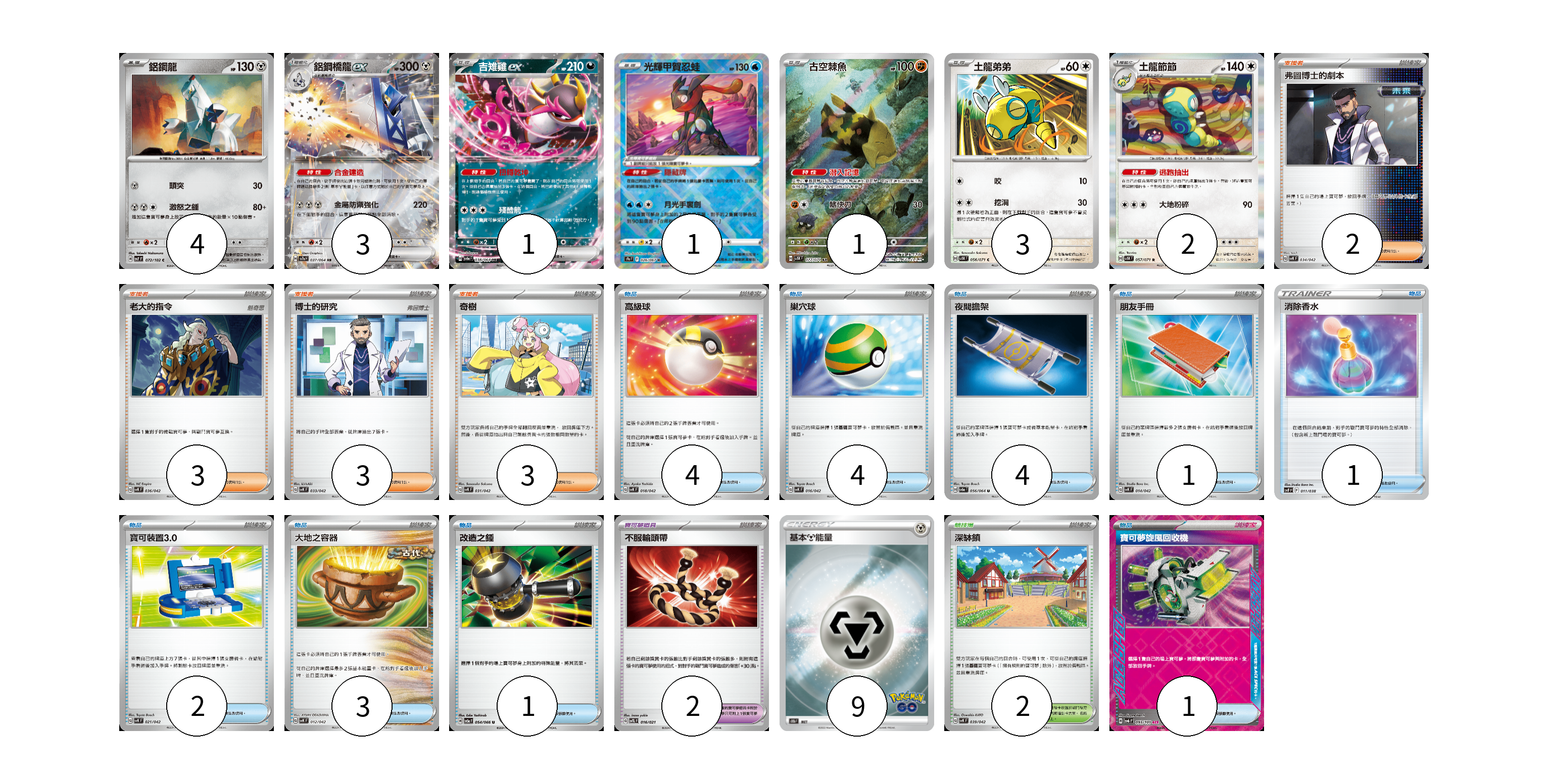 牌組構築方案 以此牌組為基礎新構築牌組 顯示卡面 顯示列表 寶可夢卡(15) 4 3 1 1 1 3 2 寶可夢道具(2) 2 物品卡(21) 4 4 4 1 1 2 3 1 1 支援者卡(11) 2 3 3 3 競技場卡(2) 2 能量卡(9) 9 寶可夢卡(15) 卡牌名稱 張數 卡牌名稱 張數 鋁鋼龍 SV7 072/102 04 鋁鋼橋龍ex SV7a 037/064 03 吉雉雞ex SV6a 038/064 01 光輝甲賀忍蛙 S9a 026/067 01 古空棘魚 SV5K 077/071 01 土龍弟弟 SV5K 056/071 03 土龍節節 SV5K 057/071 02 寶可夢道具(2) 卡牌名稱 張數 卡牌名稱 張數 不服輸頭帶 SVTL 016/021 02 物品卡(21) 卡牌名稱 張數 卡牌名稱 張數 高級球 SVK 018/042 04 巢穴球 SVK 016/042 04 夜間擔架 SV6a 056/064 04 朋友手冊 SVK 014/042 01 消除香水 SVF 011/038 01 寶可裝置3.0 SVK 021/042 02 大地之容器 SVK 012/042 03 改造之錘 SV5a 054/066 01 寶可夢旋風回收機 SV6 093/101 01 支援者卡(11) 卡牌名稱 張數 卡牌名稱 張數 弗圖博士的劇本 SVK 034/042 02 老大的指令 SVK 036/042 03 博士的研究 SVK 033/042 03 奇樹 SVK 031/042 03 競技場卡(2) 卡牌名稱 張數 卡牌名稱 張數 深缽鎮 SVK 039/042 02 能量卡(9) 卡牌名稱 張數 卡牌名稱 張數 基本鋼能量 S10b MET 09 以此牌組為基礎新構築牌組 牌組編碼 qLUwVx-Zuefnw-kXLmIf copy 列印牌組單 牌組編碼已複製 分享至SNS