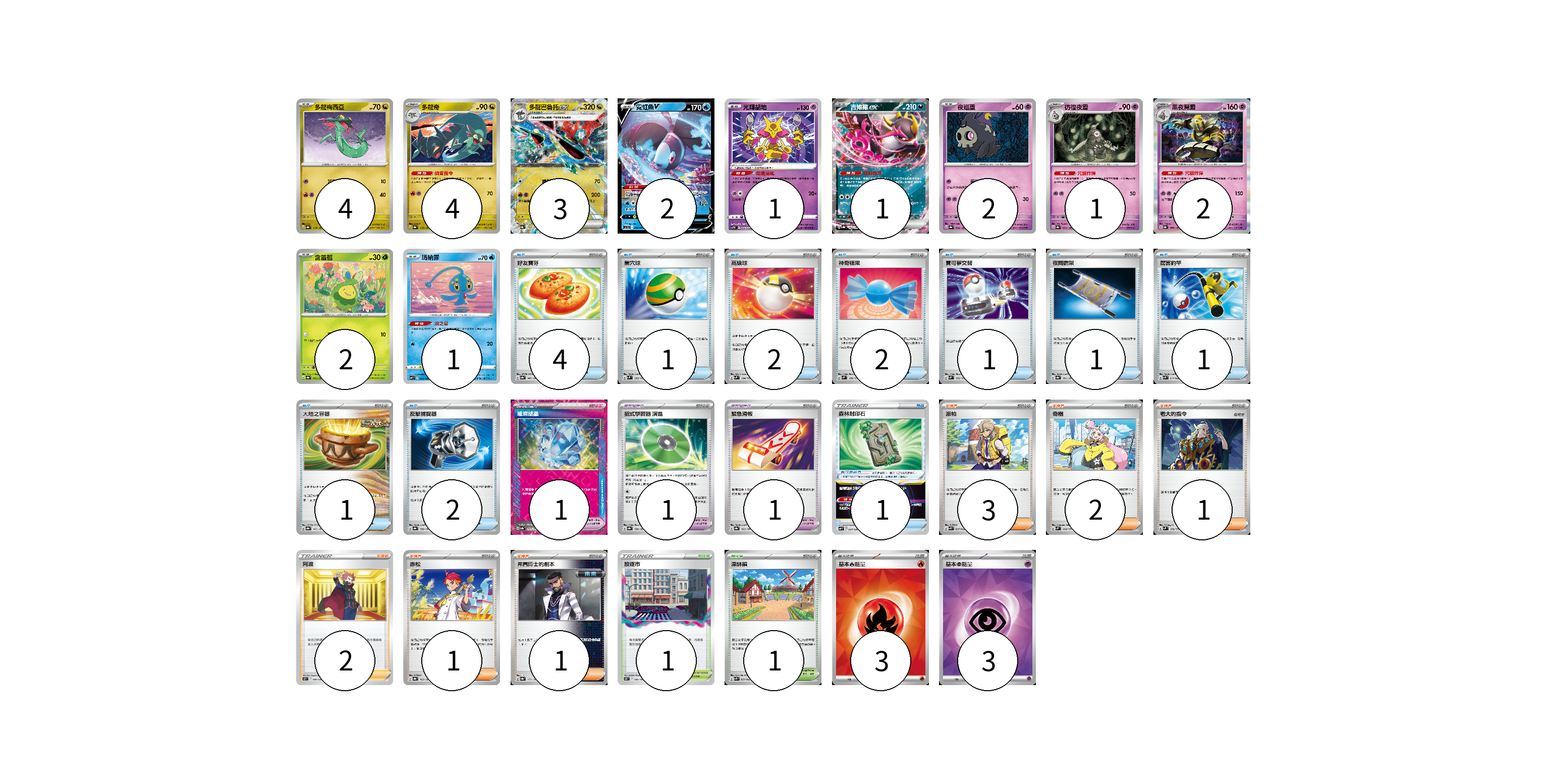 牌組構築方案 以此牌組為基礎新構築牌組 顯示卡面 顯示列表 寶可夢卡(23) 4 4 3 2 1 1 2 1 2 2 1 寶可夢道具(3) 1 1 1 物品卡(16) 4 1 2 2 1 1 1 1 2 1 支援者卡(10) 3 2 1 2 1 1 競技場卡(2) 1 1 能量卡(6) 3 3 寶可夢卡(23) 卡牌名稱 張數 卡牌名稱 張數 多龍梅西亞 SV8a 118/187 04 多龍奇 SV8a 119/187 04 多龍巴魯托ex SV8a 120/187 03 霓虹魚V SVHK 004/022 02 光輝胡地 SVTM 006/022 01 吉雉雞ex SV8a 104/187 01 夜巡靈 SV8a 064/187 02 彷徨夜靈 SV8a 065/187 01 黑夜魔靈 SV8a 066/187 02 含羞苞 SV8a 001/187 02 瑪納霏 SVF 003/038 01 寶可夢道具(3) 卡牌名稱 張數 卡牌名稱 張數 璀璨結晶 SV8a 152/187 01 招式學習器 演進 SV8a 160/187 01 緊急滑板 SV8a 153/187 01 物品卡(16) 卡牌名稱 張數 卡牌名稱 張數 好友寶芬 SV8a 147/187 04 巢穴球 SVM 133/175 01 高級球 SVM 134/175 02 神奇糖果 SVM 135/175 02 寶可夢交替 SVM 136/175 01 夜間擔架 SV8a 151/187 01 厲害釣竿 SVK 011/042 01 大地之容器 SV8a 143/187 01 反擊捕捉器 SV8a 139/187 02 森林封印石 SVF 024/038 01 支援者卡(10) 卡牌名稱 張數 卡牌名稱 張數 派帕 SVK 035/042 03 奇樹 SVM 160/175 02 老大的指令 SVM 172/175 01 阿渡 S12 096/098 02 赤松 SV8a 163/187 01 弗圖博士的劇本 SV8a 175/187 01 競技場卡(2) 卡牌名稱 張數 卡牌名稱 張數 放逐市 S11 099/100 01 深缽鎮 SVK 039/042 01 能量卡(6) 卡牌名稱 張數 卡牌名稱 張數 基本【火】能量 SVK FIR 03 基本【超】能量 SVK PSY 03 以此牌組為基礎新構築牌組 牌組編碼 qNHiCH-pIYTsi-vSpfON copy 列印牌組單 牌組編碼已複製 分享至SNS