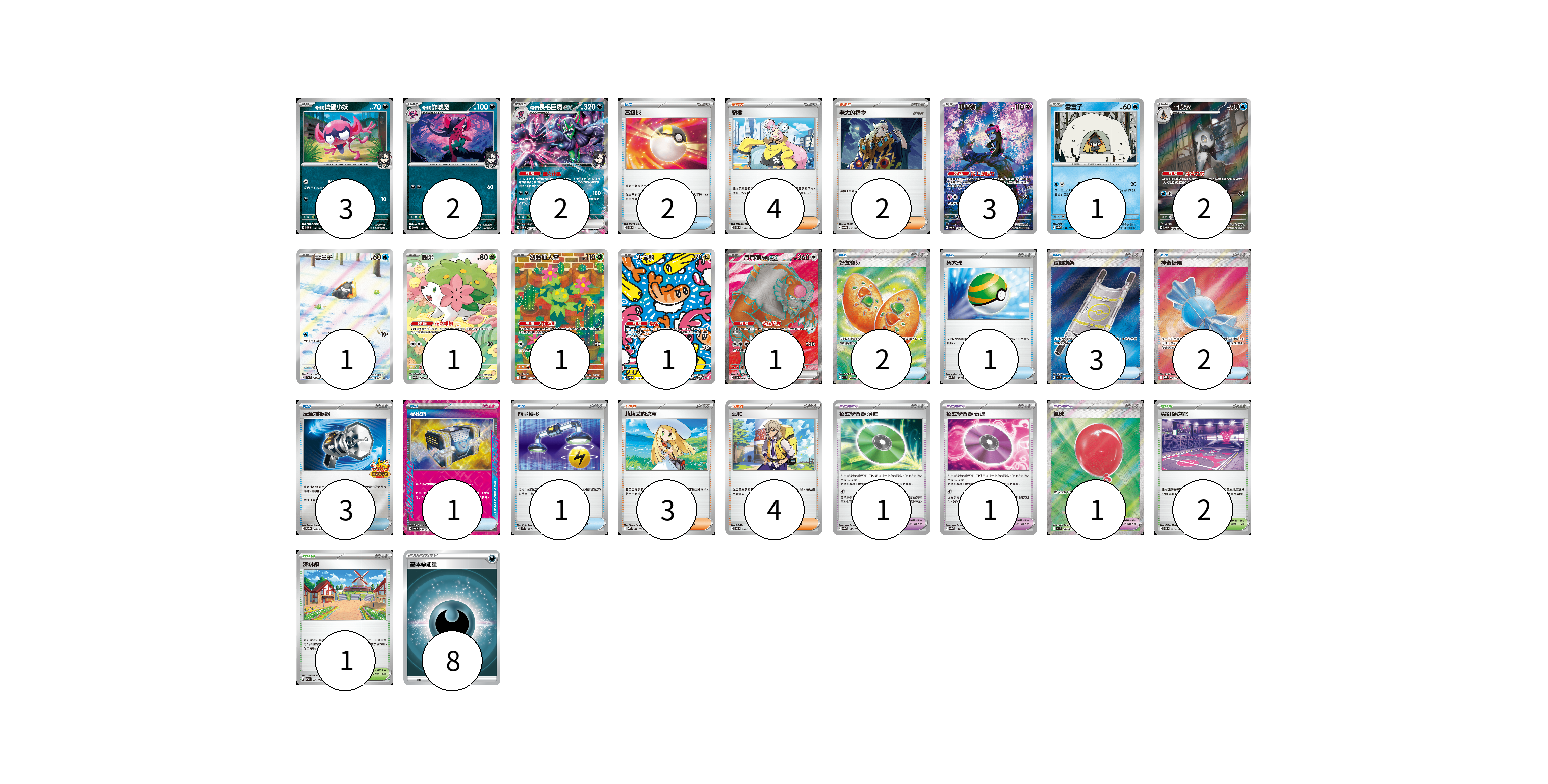 牌組構築方案 以此牌組為基礎新構築牌組 顯示卡面 顯示列表 寶可夢卡(18) 3 2 2 3 1 2 1 1 1 1 1 寶可夢道具(3) 1 1 1 物品卡(15) 2 2 1 3 2 3 1 1 支援者卡(13) 4 2 3 4 競技場卡(3) 2 1 能量卡(8) 8 寶可夢卡(18) 卡牌名稱 張數 卡牌名稱 張數 <瑪俐的>搗蛋小妖 SVOM 005/021 03 <瑪俐的>詐唬魔 SVOM 006/021 02 <瑪俐的>長毛巨魔ex SVOM 007/021 02 願增猿 SV6 107/101 03 雪童子 SV8a 037/187 01 雪妖女 SV6 104/101 02 雪童子 SV3a 063/062 01 謝米 SV9a 066/063 01 沙鈴仙人掌 SV9 101/100 01 米立龍 SV6 112/101 01 月月熊 赫月 ex SV5a 084/066 01 寶可夢道具(3) 卡牌名稱 張數 卡牌名稱 張數 招式學習器 演進 SV8a 160/187 01 招式學習器 衰退 SV8a 161/187 01 氣球 M1L 084/063 01 物品卡(15) 卡牌名稱 張數 卡牌名稱 張數 高級球 SVOM 013/021 02 好友寶芬 M1S 081/063 02 巢穴球 SVM 133/175 01 夜間擔架 M1L 083/063 03 神奇糖果 M1S 082/063 02 反擊捕捉器 SV-P 083/SV-P 03 秘密箱 SV6 092/101 01 能量轉移 SVM 127/175 01 支援者卡(13) 卡牌名稱 張數 卡牌名稱 張數 奇樹 SVOM 018/021 04 老大的指令 SVOM 020/021 02 莉莉艾的決意 MBD 021/022 03 派帕 SVOD 018/020 04 競技場卡(3) 卡牌名稱 張數 卡牌名稱 張數 尖釘鎮道館 SVOM 021/021 02 深缽鎮 SVK 039/042 01 能量卡(8) 卡牌名稱 張數 卡牌名稱 張數 基本惡能量 SLD DAR 08 以此牌組為基礎新構築牌組 牌組編碼 qOPiKT-PhpqPH-jeCiKo copy 列印牌組單 牌組編碼已複製 分享至SNS