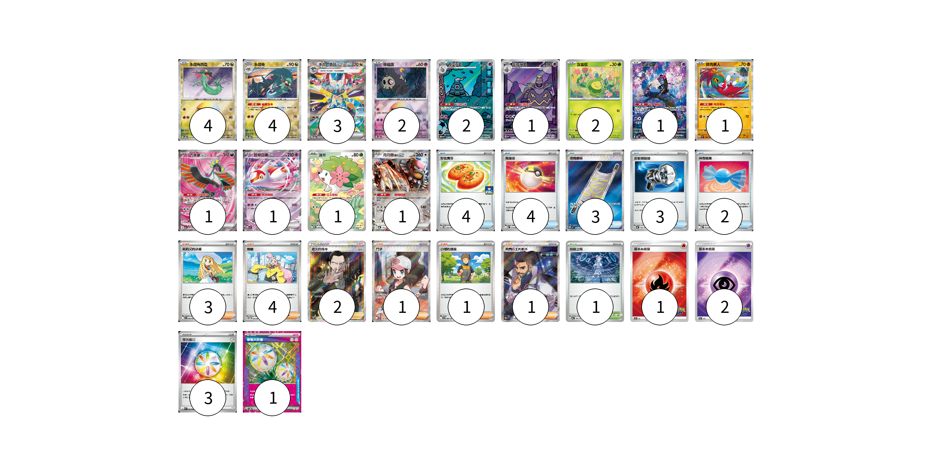 牌組構築方案 以此牌組為基礎新構築牌組 顯示卡面 顯示列表 寶可夢卡(24) 4 4 3 2 2 1 2 1 1 1 1 1 1 物品卡(16) 4 4 3 3 2 支援者卡(12) 3 4 2 1 1 1 競技場卡(1) 1 能量卡(7) 1 2 3 1 寶可夢卡(24) 卡牌名稱 張數 卡牌名稱 張數 多龍梅西亞 SV8a 118/187 04 多龍奇 SV8a 119/187 04 多龍巴魯托ex SV8a 221/187 03 夜巡靈 SV8a 064/187 02 彷徨夜靈 SV6a 069/064 02 黑夜魔靈 SV6a 070/064 01 含羞苞 SV8a 001/187 02 願增猿 SV6 107/101 01 摔角鷹人 SV4a 106/190 01 吉雉雞ex SV6a 081/064 01 拉帝亞斯ex SV7a 019/064 01 謝米 SV9a 066/063 01 月月熊 赫月ex SV8a 134/187 01 物品卡(16) 卡牌名稱 張數 卡牌名稱 張數 好友寶芬 SV-P 212/SV-P 04 高級球 MBD 014/022 04 夜間擔架 M1L 083/063 03 反擊捕捉器 SV8a 139/187 03 神奇糖果 MBG 013/022 02 支援者卡(12) 卡牌名稱 張數 卡牌名稱 張數 莉莉艾的決意 M1L 062/063 03 奇樹 SVOD 016/020 04 老大的指令(坂木) SC1b 170/153 02 鬥子 SV11W 166/086 01 小剛的發掘 SV9 096/100 01 弗圖博士的劇本 SV4M 086/066 01 競技場卡(1) 卡牌名稱 張數 卡牌名稱 張數 阻礙之塔 SV8a 181/187 01 能量卡(7) 卡牌名稱 張數 卡牌名稱 張數 基本火能量 S10b FIR 01 基本超能量 S10b PSY 02 夜光能量 SVK 042/042 03 新衝天能量 SV5K 071/071 01 以此牌組為基礎新構築牌組 牌組編碼 qQMgkX-HCxnms-JduJVQ copy 列印牌組單 牌組編碼已複製 分享至SNS