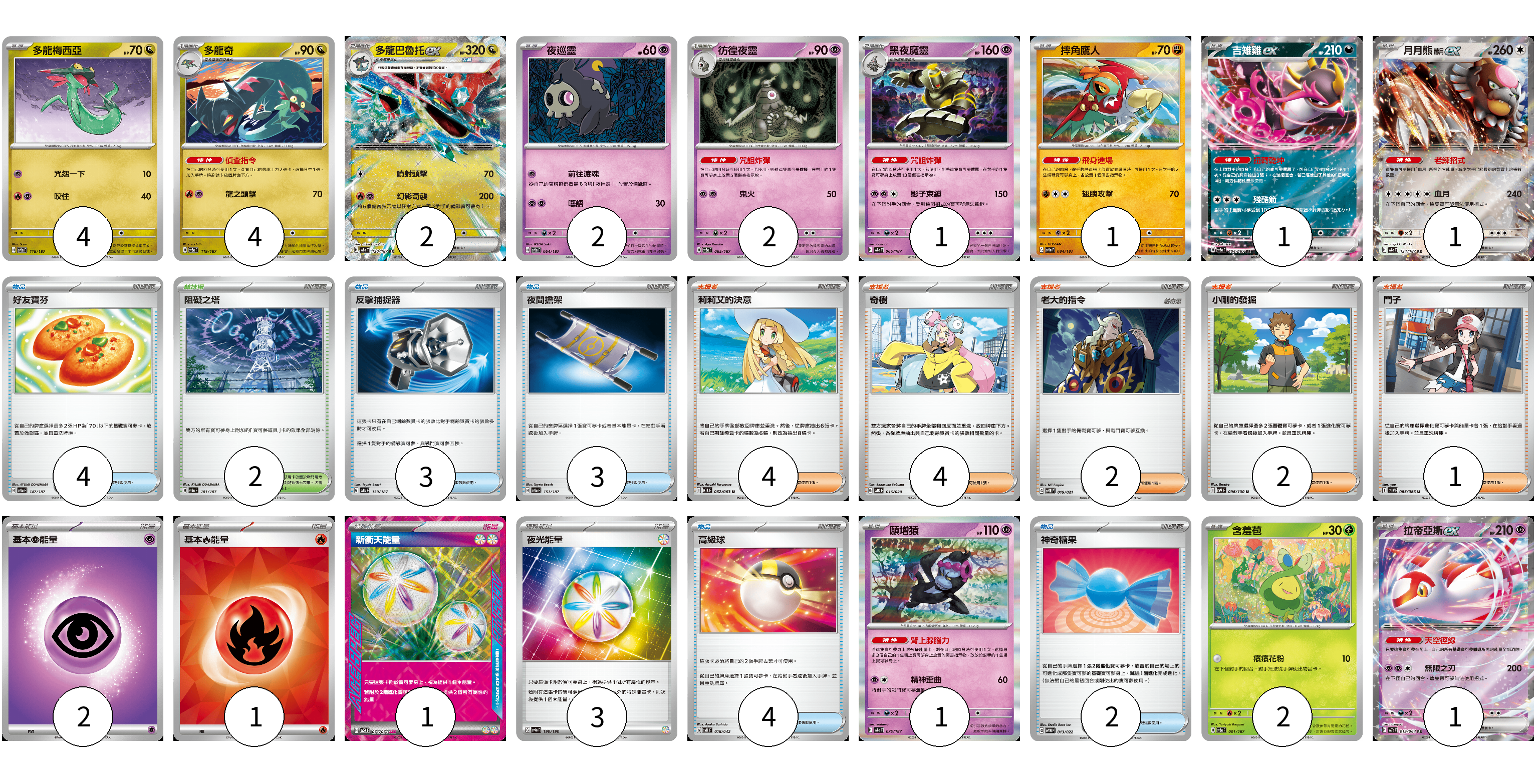 牌組構築方案 以此牌組為基礎新構築牌組 顯示卡面 顯示列表 寶可夢卡(22) 4 4 2 2 2 1 1 1 1 1 2 1 物品卡(16) 4 3 3 4 2 支援者卡(13) 4 4 2 2 1 競技場卡(2) 2 能量卡(7) 2 1 1 3 寶可夢卡(22) 卡牌名稱 張數 卡牌名稱 張數 多龍梅西亞 SV8a 118/187 04 多龍奇 SV8a 119/187 04 多龍巴魯托ex SV8a 120/187 02 夜巡靈 SV8a 064/187 02 彷徨夜靈 SV8a 065/187 02 黑夜魔靈 SV8a 066/187 01 摔角鷹人 SV8a 084/187 01 吉雉雞ex SV8a 104/187 01 月月熊 赫月ex SV8a 134/187 01 願增猿 SV8a 075/187 01 含羞苞 SV8a 001/187 02 拉帝亞斯ex SV7a 019/064 01 物品卡(16) 卡牌名稱 張數 卡牌名稱 張數 好友寶芬 SV8a 147/187 04 反擊捕捉器 SV8a 139/187 03 夜間擔架 SV8a 151/187 03 高級球 SVK 018/042 04 神奇糖果 SVTM 013/022 02 支援者卡(13) 卡牌名稱 張數 卡牌名稱 張數 莉莉艾的決意 M1L 062/063 04 奇樹 SVOD 016/020 04 老大的指令 SVTR 019/021 02 小剛的發掘 SV9 096/100 02 鬥子 SV11W 085/086 01 競技場卡(2) 卡牌名稱 張數 卡牌名稱 張數 阻礙之塔 SV8a 181/187 02 能量卡(7) 卡牌名稱 張數 卡牌名稱 張數 基本【超】能量 MBD PSY 02 基本【火】能量 SVQL FIR 01 新衝天能量 SV5K 071/071 01 夜光能量 SV4a 190/190 03 以此牌組為基礎新構築牌組 牌組編碼 qQiXQb-jGqmBP-KVnFNz copy 列印牌組單 牌組編碼已複製 分享至SNS