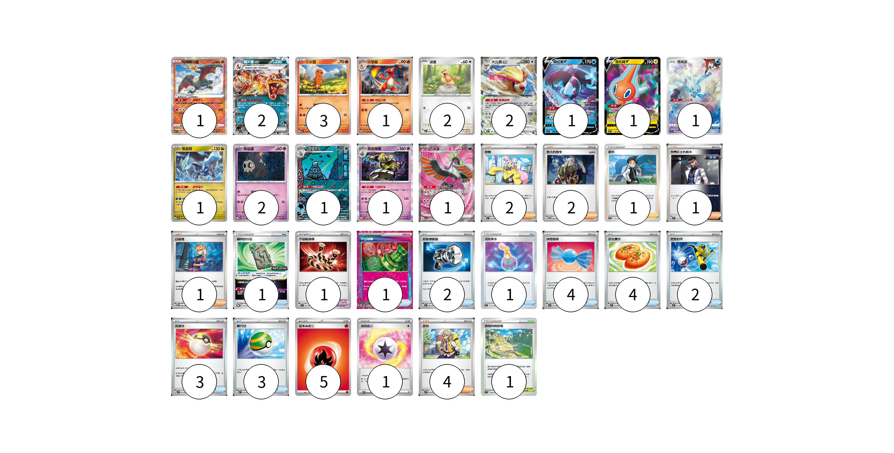 牌組構築方案 以此牌組為基礎新構築牌組 顯示卡面 顯示列表 寶可夢卡(20) 1 2 3 1 2 2 1 1 1 1 2 1 1 1 寶可夢道具(2) 1 1 物品卡(20) 1 2 1 4 4 2 3 3 支援者卡(11) 2 2 1 1 1 4 競技場卡(1) 1 能量卡(6) 5 1 寶可夢卡(20) 卡牌名稱 張數 卡牌名稱 張數 光輝噴火龍 SVF 001/038 01 噴火龍ex SV4a 115/190 02 小火龍 SV4a 025/190 03 火恐龍 SVTL 002/021 01 波波 SV3 087/108 02 大比鳥ex SV4a 139/190 02 霓虹魚V S9 030/100 01 洛托姆V S11 037/100 01 瑪納霏 S12a 178/172 01 酋雷姆 SV6a 047/064 01 夜巡靈 SV6a 018/064 02 彷徨夜靈 SV6a 069/064 01 黑夜魔靈 SV6a 020/064 01 吉雉雞ex SV6a 081/064 01 寶可夢道具(2) 卡牌名稱 張數 卡牌名稱 張數 森林封印石 SV-P 141/SV-P 01 不服輸頭帶 SV1S 073/078 01 物品卡(20) 卡牌名稱 張數 卡牌名稱 張數 不公印章 SV5a 053/066 01 反擊捕捉器 SVK 009/042 02 消除香水 S9a 063/067 01 神奇糖果 SVK 019/042 04 好友寶芬 SVK 015/042 04 厲害釣竿 SVK 011/042 02 高級球 SVK 018/042 03 巢穴球 SVK 016/042 03 支援者卡(11) 卡牌名稱 張數 卡牌名稱 張數 奇樹 SVK 031/042 02 老大的指令 SVTR 019/021 02 捩木 S11 097/100 01 弗圖博士的劇本 SVK 034/042 01 白蕾雅 SV7 100/102 01 派帕 SVK 035/042 04 競技場卡(1) 卡牌名稱 張數 卡牌名稱 張數 崩塌的競技場 S9 098/100 01 能量卡(6) 卡牌名稱 張數 卡牌名稱 張數 基本【火】能量 SVTL FIR 05 薄霧能量 SV5M 071/071 01 以此牌組為基礎新構築牌組 牌組編碼 qSSZVH-YKTErN-bdISQs copy 列印牌組單 牌組編碼已複製 分享至SNS
