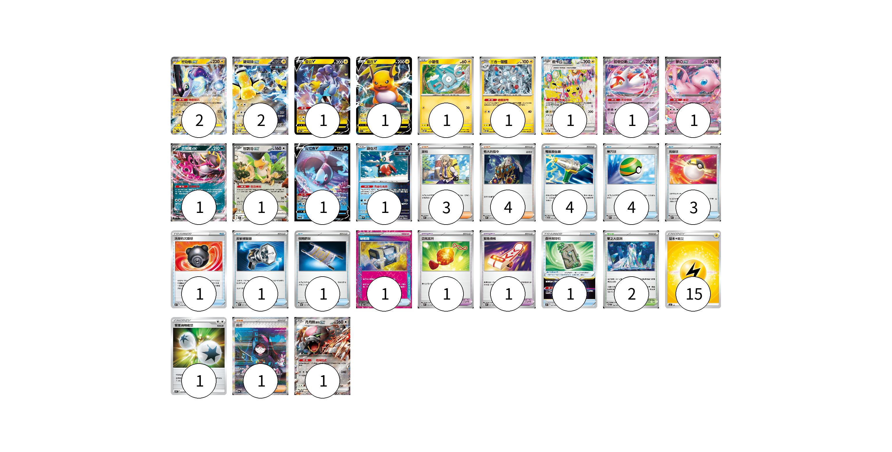 牌組構築方案 以此牌組為基礎新構築牌組 顯示卡面 顯示列表 寶可夢卡(16) 2 2 1 1 1 1 1 1 1 1 1 1 1 1 寶可夢道具(2) 1 1 物品卡(16) 4 4 3 1 1 1 1 1 支援者卡(8) 3 4 1 競技場卡(2) 2 能量卡(16) 15 1 寶可夢卡(16) 卡牌名稱 張數 卡牌名稱 張數 密勒頓ex SV1V 037/078 02 鐵臂膀ex SVTR 007/021 02 雷公V SVTR 005/021 01 雷丘V S9 034/100 01 小磁怪 SV8 034/106 01 三合一磁怪 SV8 035/106 01 皮卡丘ex SV8 122/106 01 拉帝亞斯ex SV7a 019/064 01 夢幻ex SVK 001/042 01 吉雉雞ex SV6a 038/064 01 怒鸚哥ex SVK 006/042 01 霓虹魚V SVHK 004/022 01 鐵包袱 SV4M 020/066 01 月月熊 赫月 ex SV5a 052/066 01 寶可夢道具(2) 卡牌名稱 張數 卡牌名稱 張數 勇氣護符 SVK 024/042 01 緊急滑板 SVK 023/042 01 物品卡(16) 卡牌名稱 張數 卡牌名稱 張數 電氣發生器 SVTR 011/021 04 巢穴球 SVK 016/042 04 高級球 SVK 018/042 03 洗翠的沉重球 SVF 019/038 01 反擊捕捉器 SVK 009/042 01 夜間擔架 SV6a 056/064 01 秘密箱 SV6 092/101 01 森林封印石 SVF 024/038 01 支援者卡(8) 卡牌名稱 張數 卡牌名稱 張數 派帕 SVK 035/042 03 老大的指令 SVK 036/042 04 仙后 SV6a 091/064 01 競技場卡(2) 卡牌名稱 張數 卡牌名稱 張數 零之大空洞 SV7 102/102 02 能量卡(16) 卡牌名稱 張數 卡牌名稱 張數 基本雷能量 SN LIG 15 雙重渦輪能量 SVTM 022/022 01 以此牌組為基礎新構築牌組 牌組編碼 qSgoMU-QbZxpF-DFBLHl copy 列印牌組單 牌組編碼已複製 分享至SNS