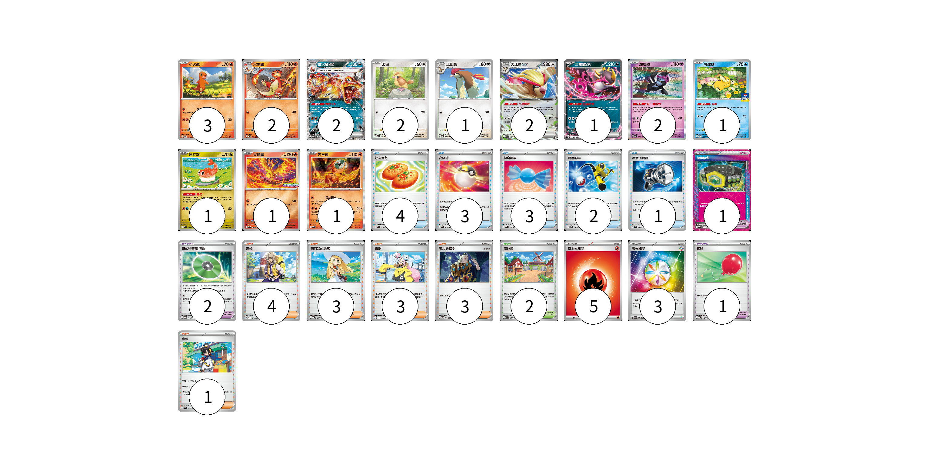 牌組構築方案 以此牌組為基礎新構築牌組 顯示卡面 顯示列表 寶可夢卡(19) 3 2 2 2 1 2 1 2 1 1 1 1 寶可夢道具(4) 1 2 1 物品卡(13) 4 3 3 2 1 支援者卡(14) 4 3 3 3 1 競技場卡(2) 2 能量卡(8) 5 3 寶可夢卡(19) 卡牌名稱 張數 卡牌名稱 張數 小火龍 SVTL 001/021 03 火恐龍 M2 012/080 02 噴火龍ex SV4a 115/190 02 波波 SV3 087/108 02 比比鳥 SV4a 138/190 01 大比鳥ex SVK 005/042 02 吉雉雞ex SVOD 004/020 01 願增猿 SV8a 075/187 02 可達鴨 SV-P 220/SV-P 01 米立龍 MBD 010/022 01 火焰鳥 M-P 022/M-P 01 古玉魚 SV8a 025/187 01 寶可夢道具(4) 卡牌名稱 張數 卡牌名稱 張數 極限腰帶 SV8a 159/187 01 招式學習器 演進 SV8a 160/187 02 氣球 MBD 018/022 01 物品卡(13) 卡牌名稱 張數 卡牌名稱 張數 好友寶芬 MBD 013/022 04 高級球 MBD 014/022 03 神奇糖果 MBG 013/022 03 厲害釣竿 SVOD 010/020 02 反擊捕捉器 SV8a 139/187 01 支援者卡(14) 卡牌名稱 張數 卡牌名稱 張數 派帕 SVOD 018/020 04 莉莉艾的決意 MBD 021/022 03 奇樹 SVOD 016/020 03 老大的指令 MBD 020/022 03 烏栗 SV8a 169/187 01 競技場卡(2) 卡牌名稱 張數 卡牌名稱 張數 深缽鎮 SVK 039/042 02 能量卡(8) 卡牌名稱 張數 卡牌名稱 張數 基本【火】能量 M-P FIR 05 夜光能量 SVK 042/042 03 以此牌組為基礎新構築牌組 牌組編碼 qTCFWK-cjbTPk-FdsXJW copy 列印牌組單 牌組編碼已複製 分享至SNS