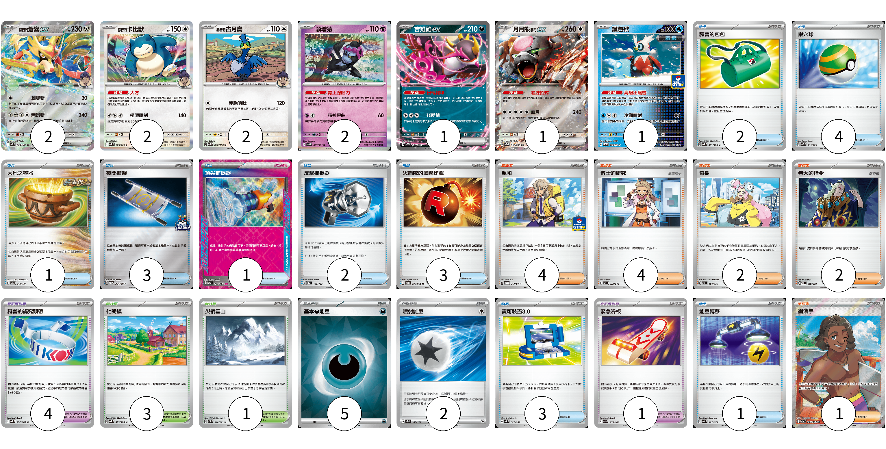 牌組構築方案 以此牌組為基礎新構築牌組 顯示卡面 顯示列表 寶可夢卡(11) 2 2 2 2 1 1 1 寶可夢道具(5) 4 1 物品卡(20) 2 4 1 3 1 2 3 3 1 支援者卡(13) 4 4 2 2 1 競技場卡(4) 3 1 能量卡(7) 5 2 寶可夢卡(11) 卡牌名稱 張數 卡牌名稱 張數 赫普的蒼響ex SV9 069/100 02 赫普的卡比獸 SV9 075/100 02 赫普的古月鳥 SV9 087/100 02 願增猿 SV6 055/101 02 吉雉雞ex SVOD 004/020 01 月月熊 赫月 ex SV5a 052/066 01 鐵包袱 SV-P 175/SV-P 01 寶可夢道具(5) 卡牌名稱 張數 卡牌名稱 張數 赫普的講究頭帶 SV9 092/100 04 緊急滑板 SV8a 153/187 01 物品卡(20) 卡牌名稱 張數 卡牌名稱 張數 赫普的包包 SV9 091/100 02 巢穴球 SVM 133/175 04 大地之容器 SV8a 143/187 01 夜間擔架 SV-P 204/SV-P 03 頂尖捕捉器 SV8a 148/187 01 反擊捕捉器 SV8a 139/187 02 火箭隊的驚嚇炸彈 SV10 089/098 03 寶可裝置3.0 SVK 021/042 03 能量轉移 SVM 127/175 01 支援者卡(13) 卡牌名稱 張數 卡牌名稱 張數 派帕 SV-P 213/SV-P 04 博士的研究 SVK 032/042 04 奇樹 SVM 160/175 02 老大的指令 SVOD 019/020 02 衝浪手 SV7a 084/064 01 競技場卡(4) 卡牌名稱 張數 卡牌名稱 張數 化朗鎮 SV9 099/100 03 災禍雪山 SV2P 070/071 01 能量卡(7) 卡牌名稱 張數 卡牌名稱 張數 基本【惡】能量 SVOM DAR 05 噴射能量 SV8a 185/187 02 以此牌組為基礎新構築牌組 牌組編碼 qUGeDv-hivQxd-LLpsJg copy 列印牌組單 牌組編碼已複製 分享至SNS
