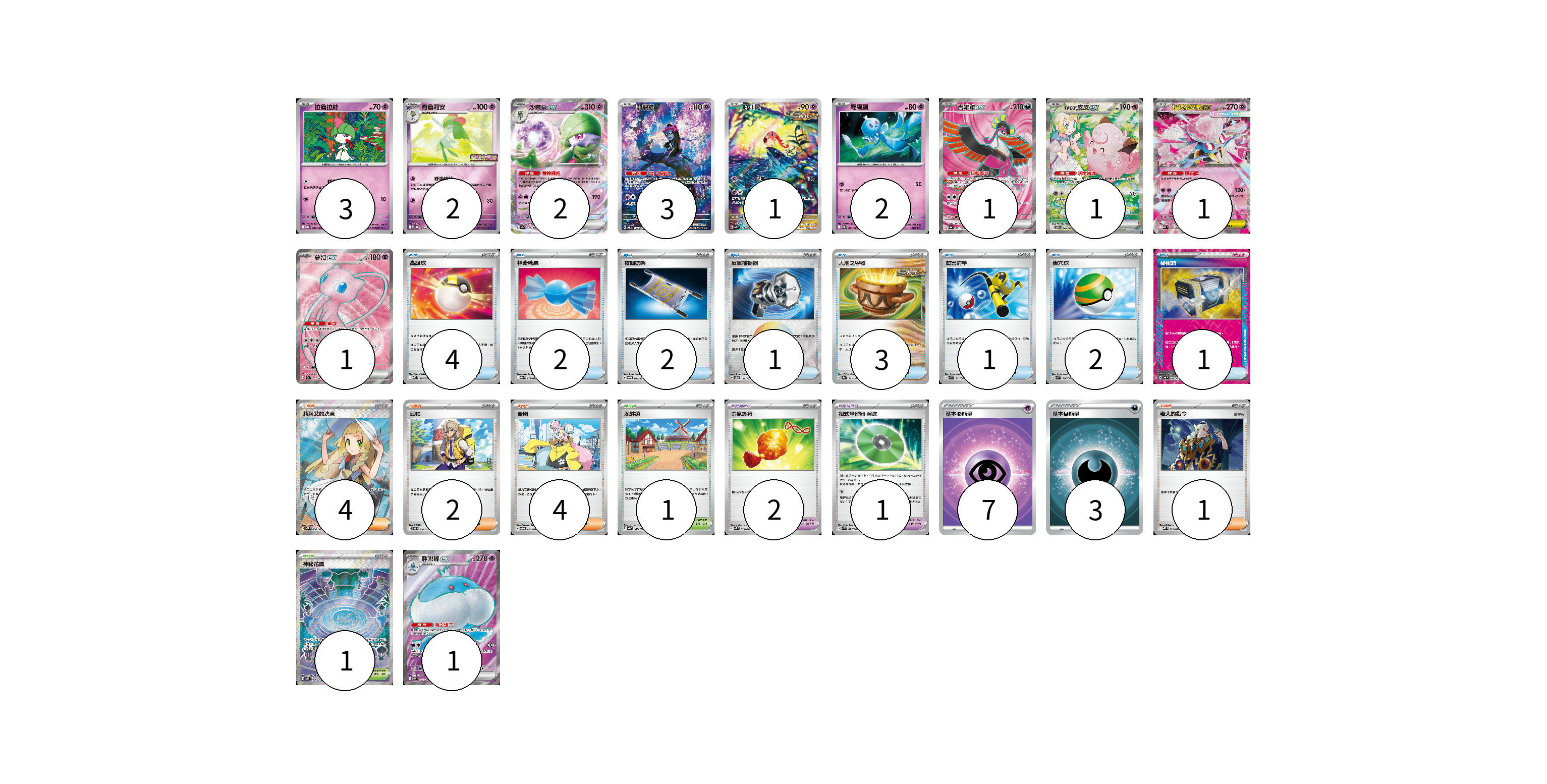 牌組構築方案 以此牌組為基礎新構築牌組 顯示卡面 顯示列表 寶可夢卡(18) 3 2 2 3 1 2 1 1 1 1 1 寶可夢道具(3) 2 1 物品卡(16) 4 2 2 1 3 1 2 1 支援者卡(11) 4 2 4 1 競技場卡(2) 1 1 能量卡(10) 7 3 寶可夢卡(18) 卡牌名稱 張數 卡牌名稱 張數 拉魯拉絲 M1S 040/063 03 奇魯莉安 M-P 006/M-P 02 沙奈朵ex SV1S 028/078 02 願增猿 SV6 107/101 03 吼叫尾 SV4K 071/066 01 輕飄飄 SV11W 041/086 02 吉雉雞ex SV6a 081/064 01 莉莉艾的皮皮ex SV9 126/100 01 超級蒂安希ex MBD 006/022 01 夢幻ex SV2a 195/165 01 胖嘟嘟ex SV11W 162/086 01 寶可夢道具(3) 卡牌名稱 張數 卡牌名稱 張數 勇氣護符 SVK 024/042 02 招式學習器 演進 SVK 025/042 01 物品卡(16) 卡牌名稱 張數 卡牌名稱 張數 高級球 MBD 014/022 04 神奇糖果 MBG 013/022 02 夜間擔架 SVOM 016/021 02 反擊捕捉器 SV8a 139/187 01 大地之容器 SV8a 143/187 03 厲害釣竿 SVK 011/042 01 巢穴球 SVK 016/042 02 秘密箱 SV6 092/101 01 支援者卡(11) 卡牌名稱 張數 卡牌名稱 張數 莉莉艾的決意 M1L 086/063 04 派帕 SVOD 018/020 02 奇樹 SVOD 016/020 04 老大的指令 MBD 020/022 01 競技場卡(2) 卡牌名稱 張數 卡牌名稱 張數 深缽鎮 SV4a 185/190 01 神秘花園 M1S 086/063 01 能量卡(10) 卡牌名稱 張數 卡牌名稱 張數 基本【超】能量 SI PSY 07 基本【惡】能量 SI DAR 03 以此牌組為基礎新構築牌組 牌組編碼 qWSCcX-eGJOxr-npFiSA copy 列印牌組單 牌組編碼已複製 分享至SNS