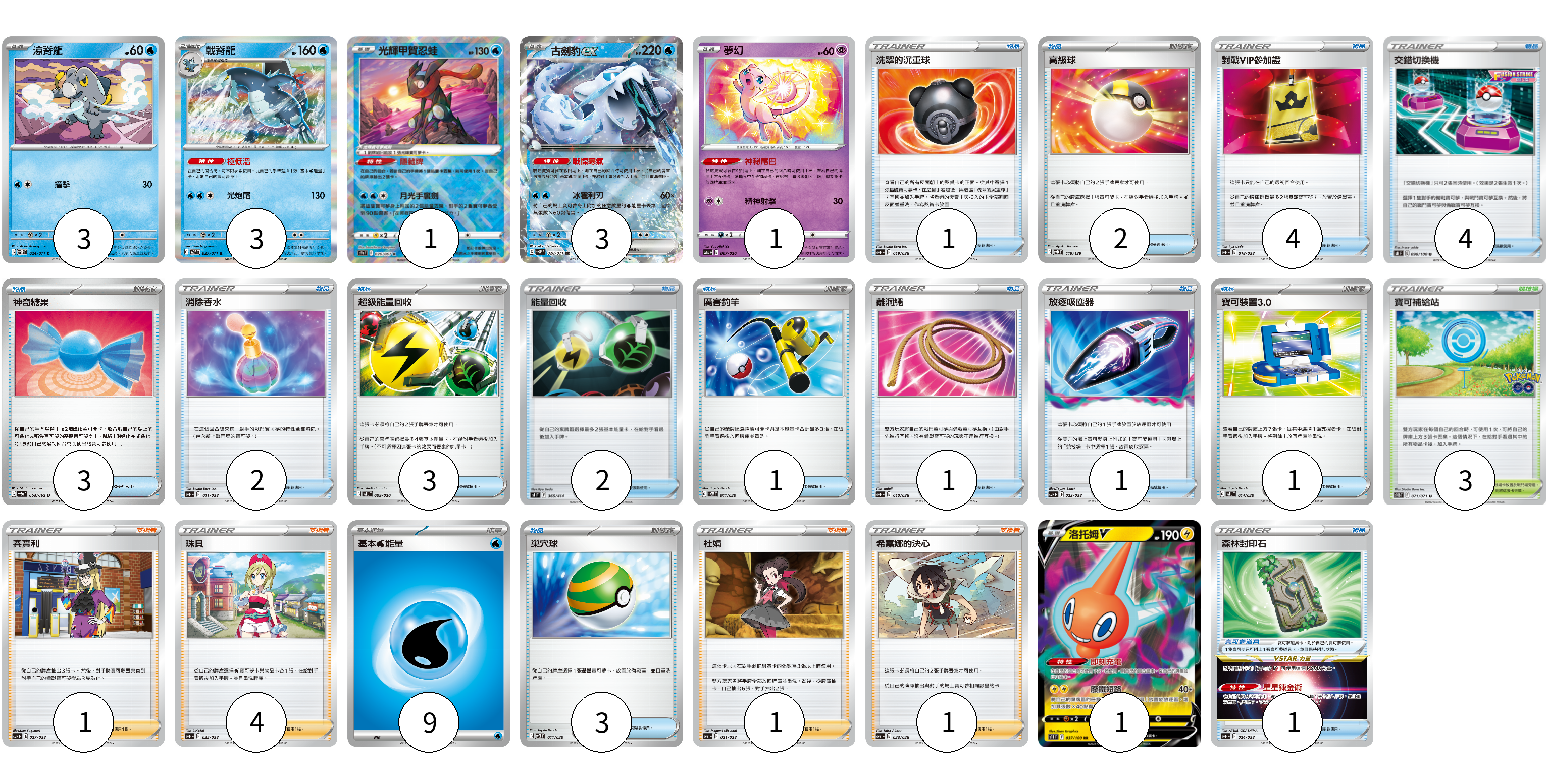 牌組構築方案 以此牌組為基礎新構築牌組 顯示卡面 顯示列表 寶可夢卡(12) 3 3 1 3 1 1 物品卡(29) 1 2 4 4 3 2 3 2 1 1 1 1 3 1 支援者卡(7) 1 4 1 1 競技場卡(3) 3 能量卡(9) 9 寶可夢卡(12) 卡牌名稱 張數 卡牌名稱 張數 涼脊龍 SV2P 024/071 03 戟脊龍 SV2P 027/071 03 光輝甲賀忍蛙 S9a 026/067 01 古劍豹ex SV2P 028/071 03 夢幻 SVEL 007/020 01 洛托姆V S11 037/100 01 物品卡(29) 卡牌名稱 張數 卡牌名稱 張數 洗翠的沉重球 SVF 019/038 01 高級球 SVD 119/139 02 對戰VIP參加證 SVF 018/038 04 交錯切換機 S8 090/100 04 神奇糖果 SV3a 053/062 03 消除香水 SVF 011/038 02 超級能量回收 SVEL 009/020 03 能量回收 SI 365/414 02 厲害釣竿 SVEM 011/020 01 離洞繩 SVF 010/038 01 放逐吸塵器 SVF 023/038 01 寶可裝置3.0 SVEL 014/020 01 巢穴球 SVEL 011/020 03 森林封印石 SVF 024/038 01 支援者卡(7) 卡牌名稱 張數 卡牌名稱 張數 賽寶利 SVF 027/038 01 珠貝 SVF 025/038 04 杜娟 SVB 021/028 01 希嘉娜的決心 SVB 023/028 01 競技場卡(3) 卡牌名稱 張數 卡牌名稱 張數 寶可補給站 S10b 071/071 03 能量卡(9) 卡牌名稱 張數 卡牌名稱 張數 基本【水】能量 SVF WAT 09 以此牌組為基礎新構築牌組 牌組編碼 qXDbDp-UYHwpF-xBVnrh copy 列印牌組單 牌組編碼已複製 分享至SNS